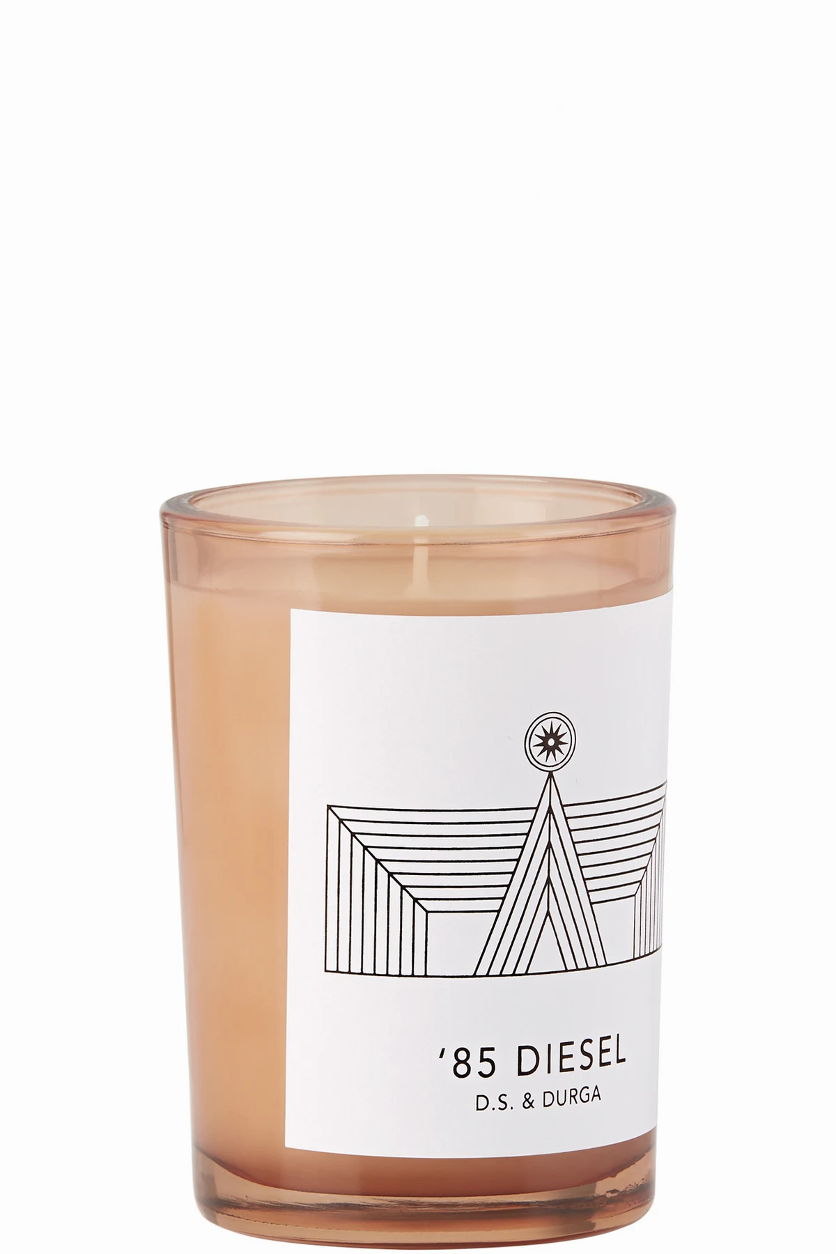 Scented wax candle in '85 Diesel. Features top notes of saffron leather, suede, and vinyl. Heart notes of white violet, hiba, and castoreum. Base notes of diesel smoke, earth dirt, and galbanum resin. Glass vessel in orange.