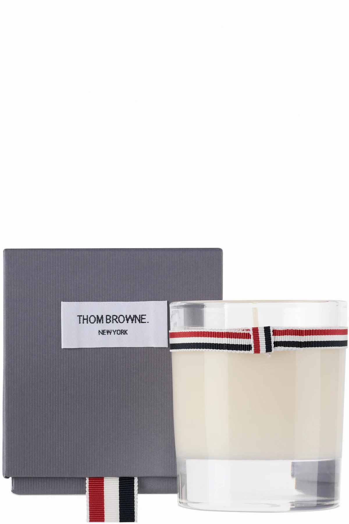 Scented wax candle. Mouth-blown glass vessel with tricolor grosgrain trim.