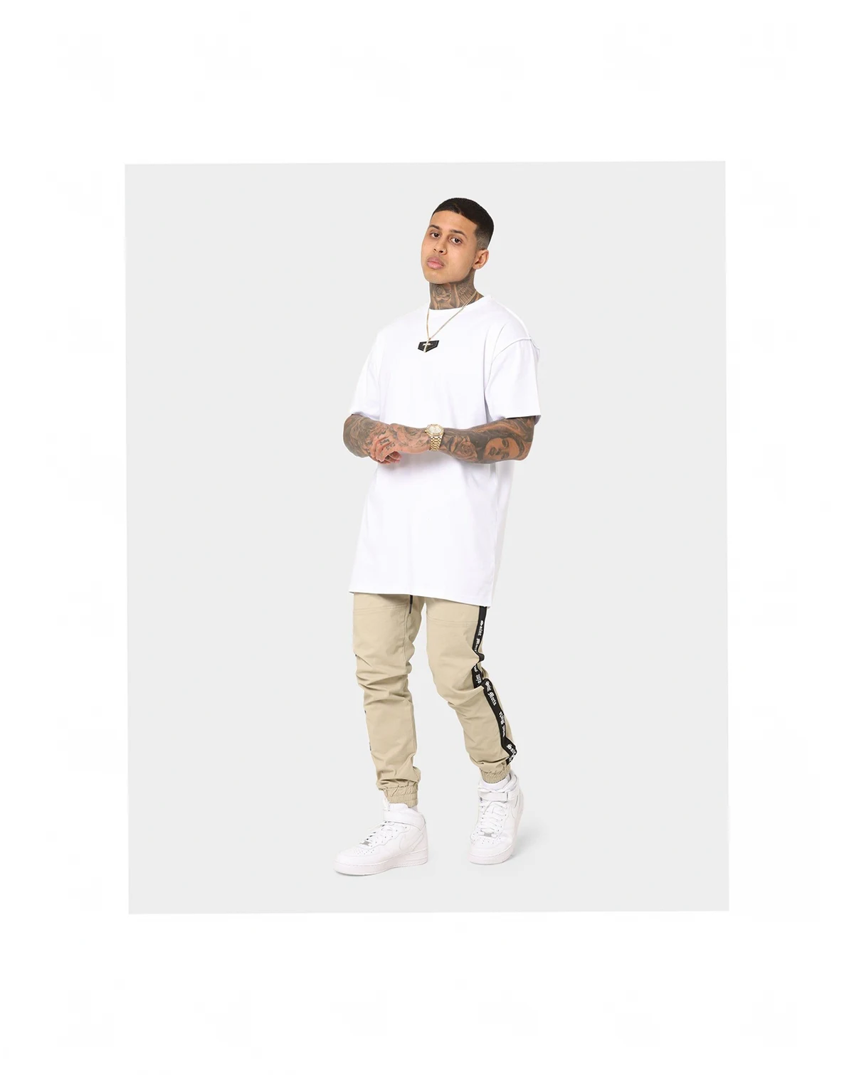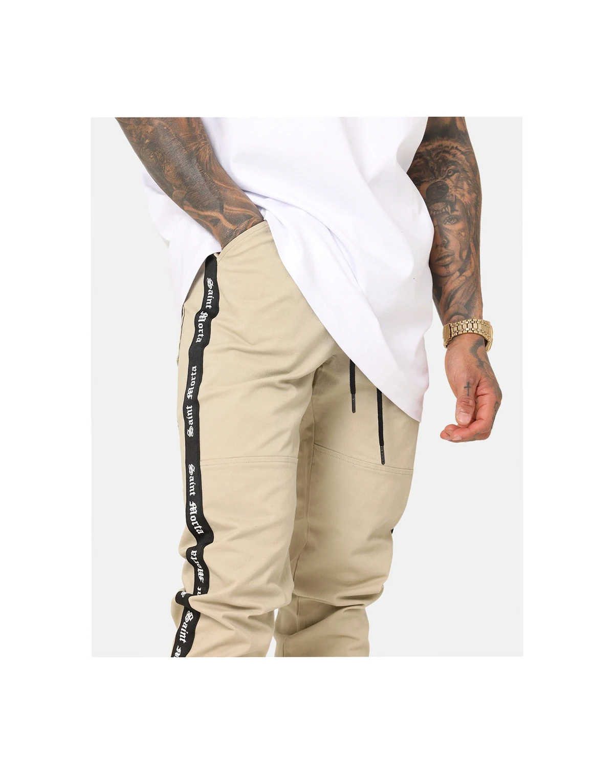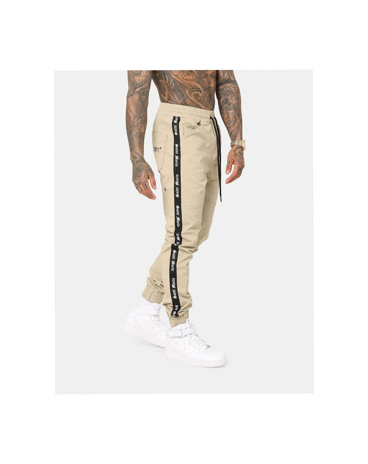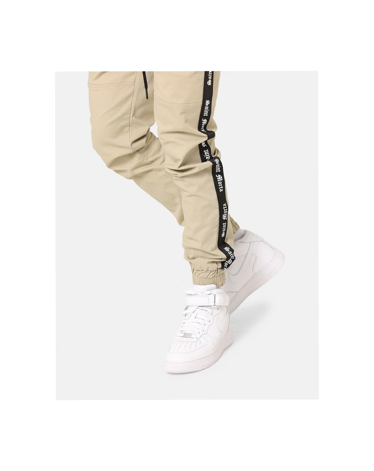 This pant is the jogger of the season. Features an elastic waistband with external drawstrings, 4 pocket design, SAINT MORTA taping down both legs, paneled detailing on legs, and embroidered branding at rear.