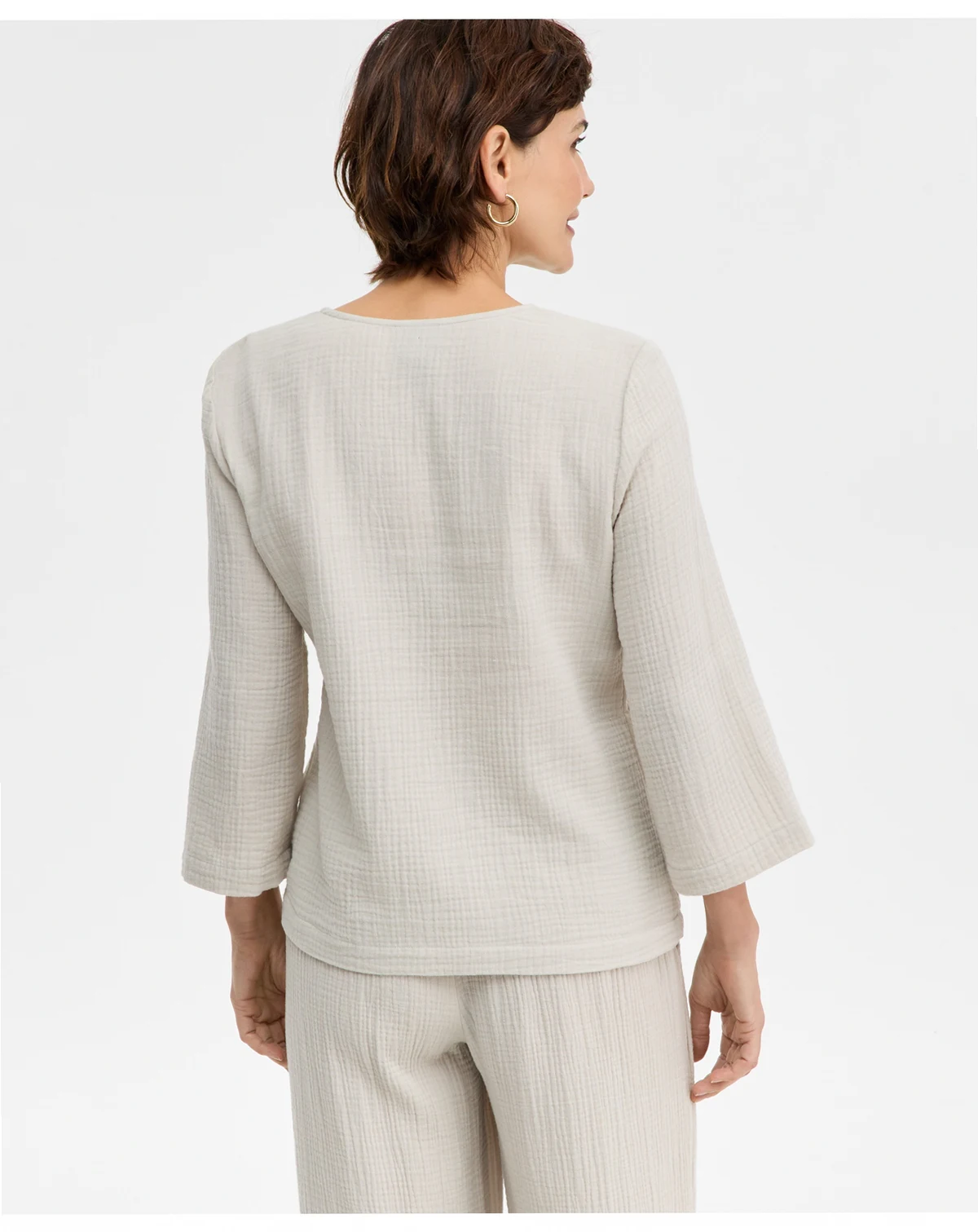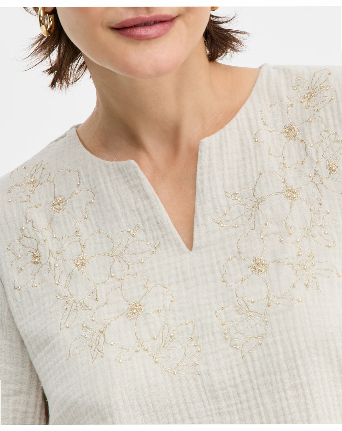 Delicate embroidery and beading highlight the neckline of this breezy cotton gauze top from JM Collection.