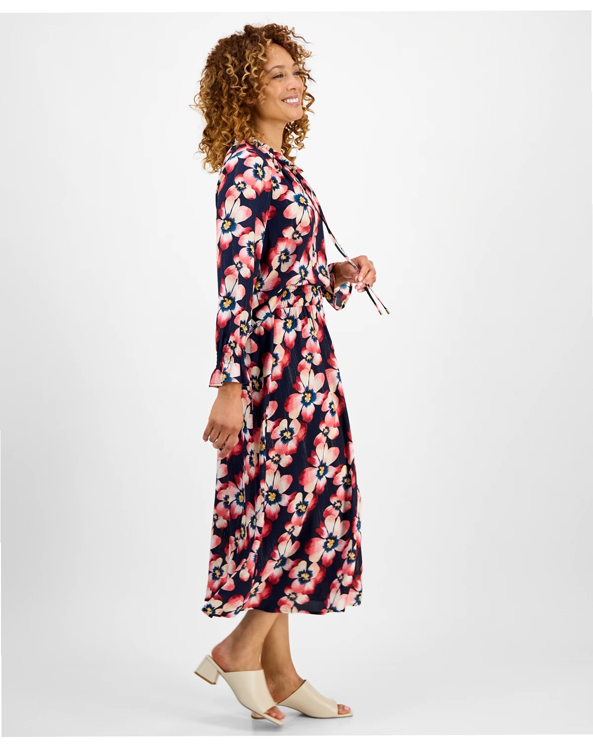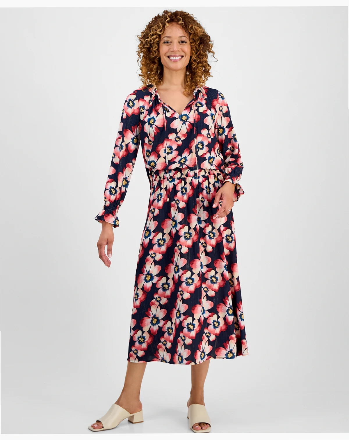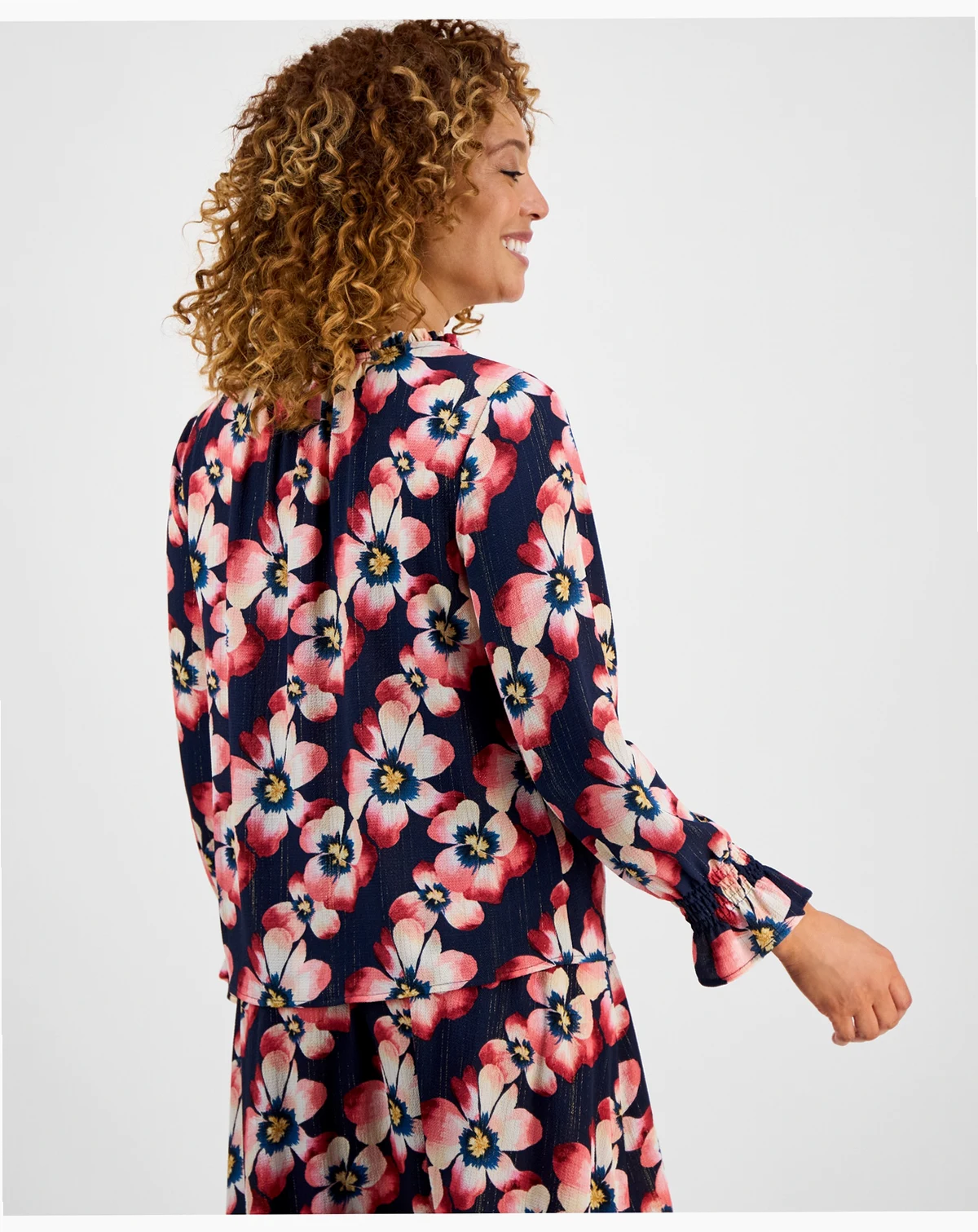 JM Collection adds style to a split-neck tunic with a painterly floral print and subtle metallic shine woven into the fabric.
