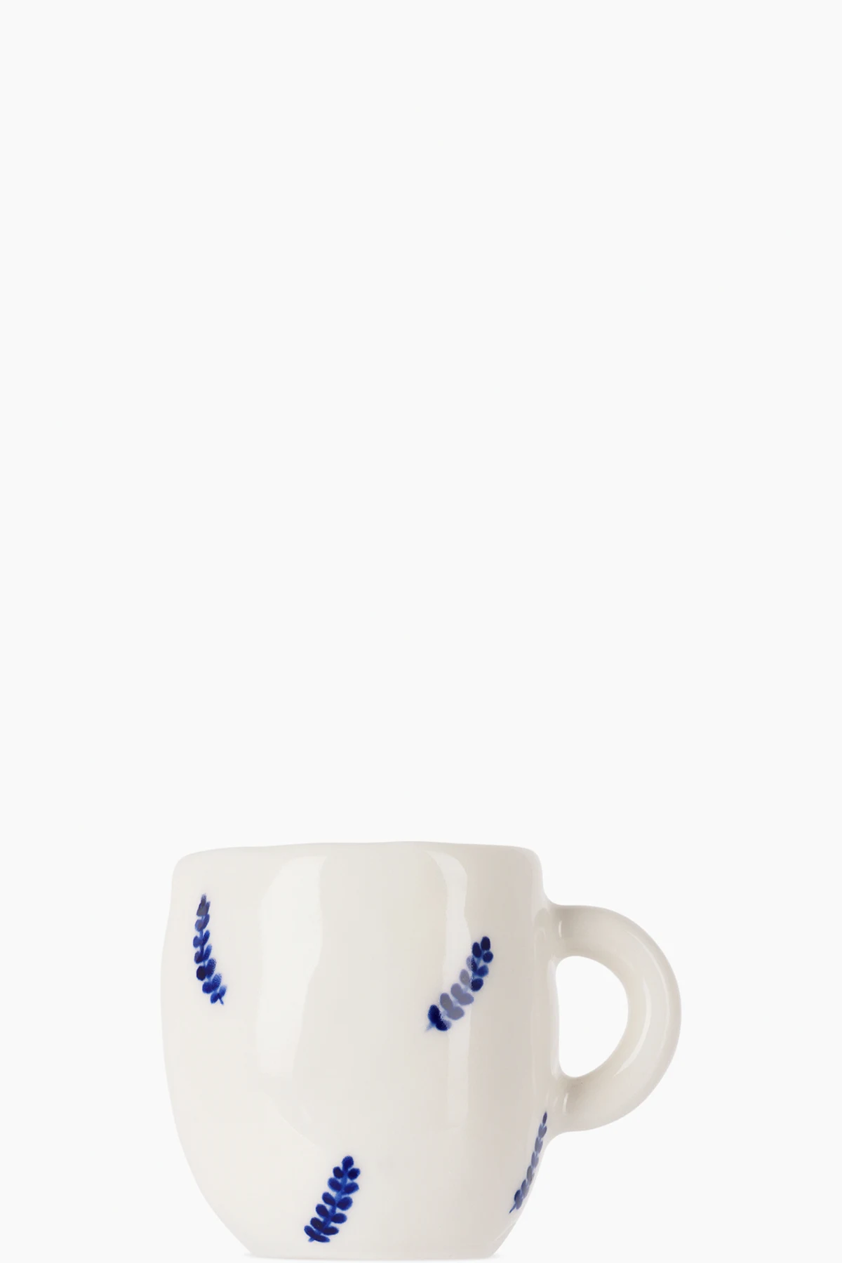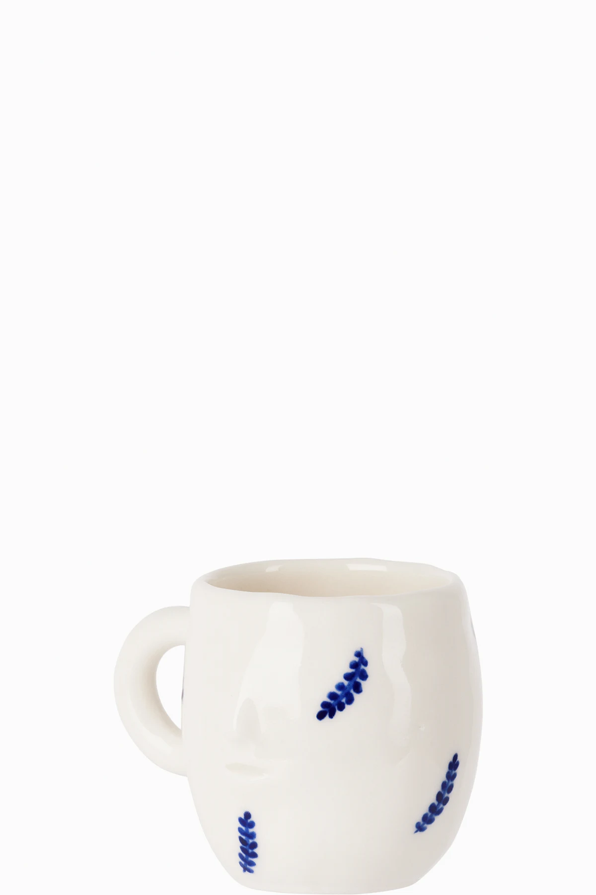 Handcrafted glossy-glazed porcelain cup in white and blue.