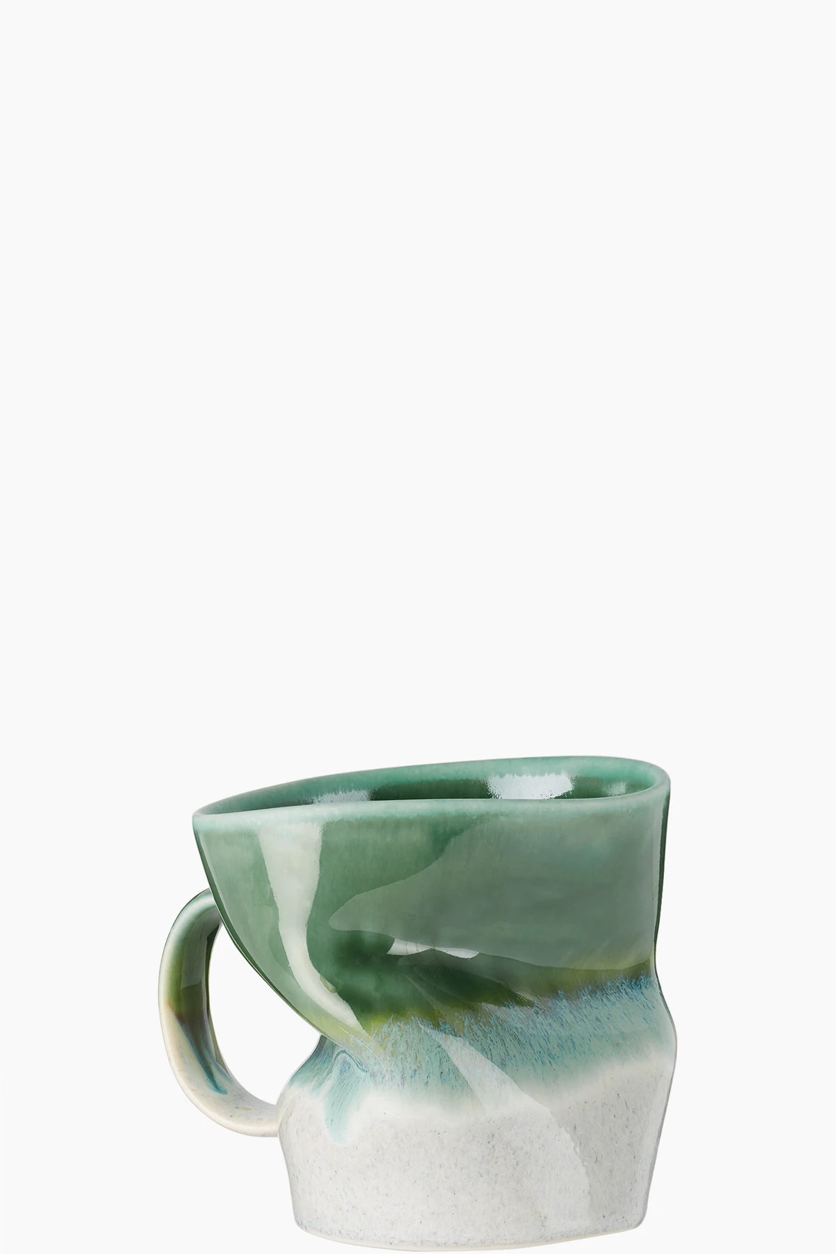 Handcrafted glazed porcelain mug in tones of green and off-white.