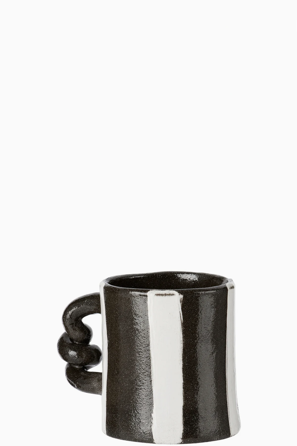 Handcrafted clay ceramic mug in black. Hand-painted stripe graphic in white throughout. Logo embossed at base.