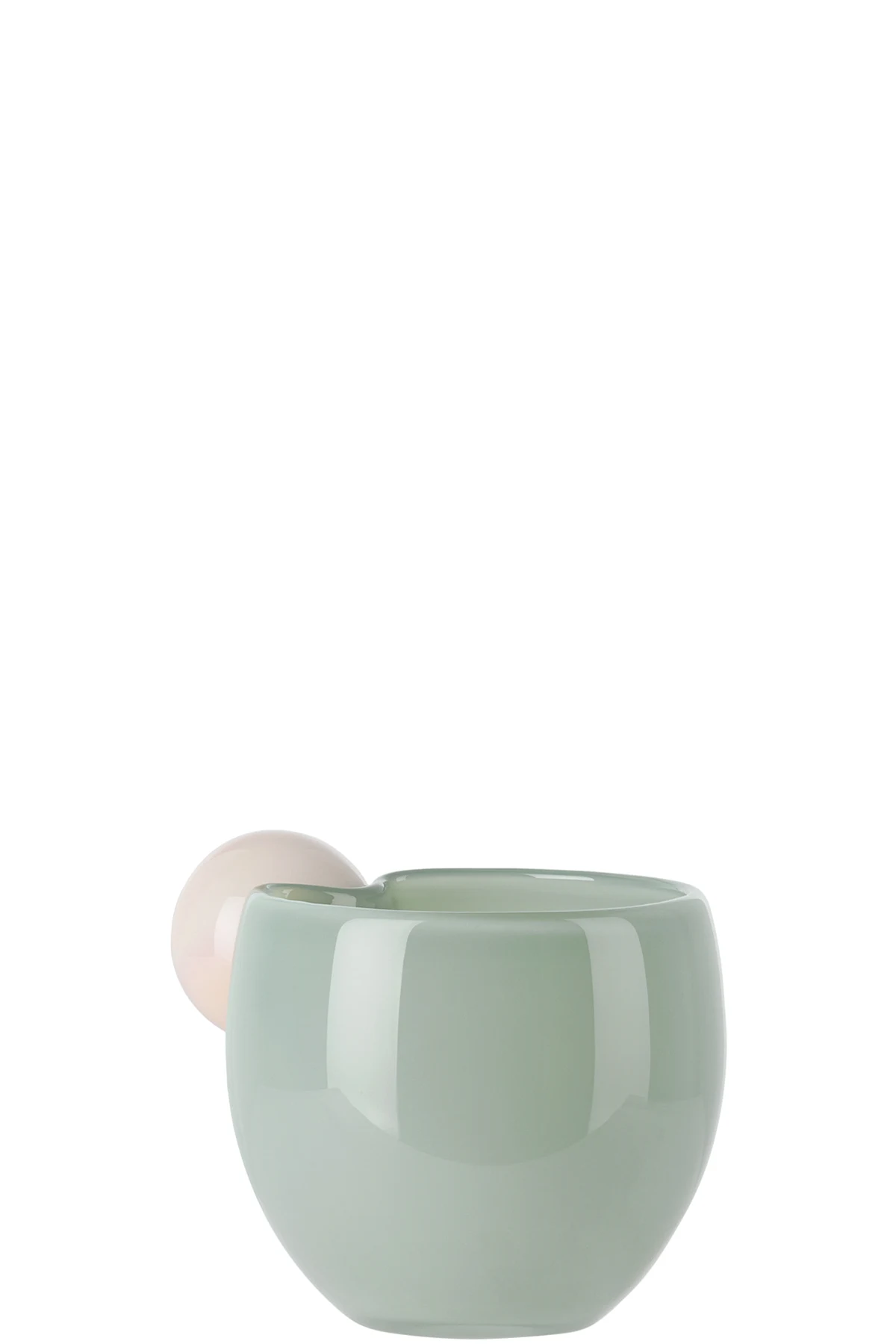 Mouth-blown sculptural tempered glass mug in off-white and green.