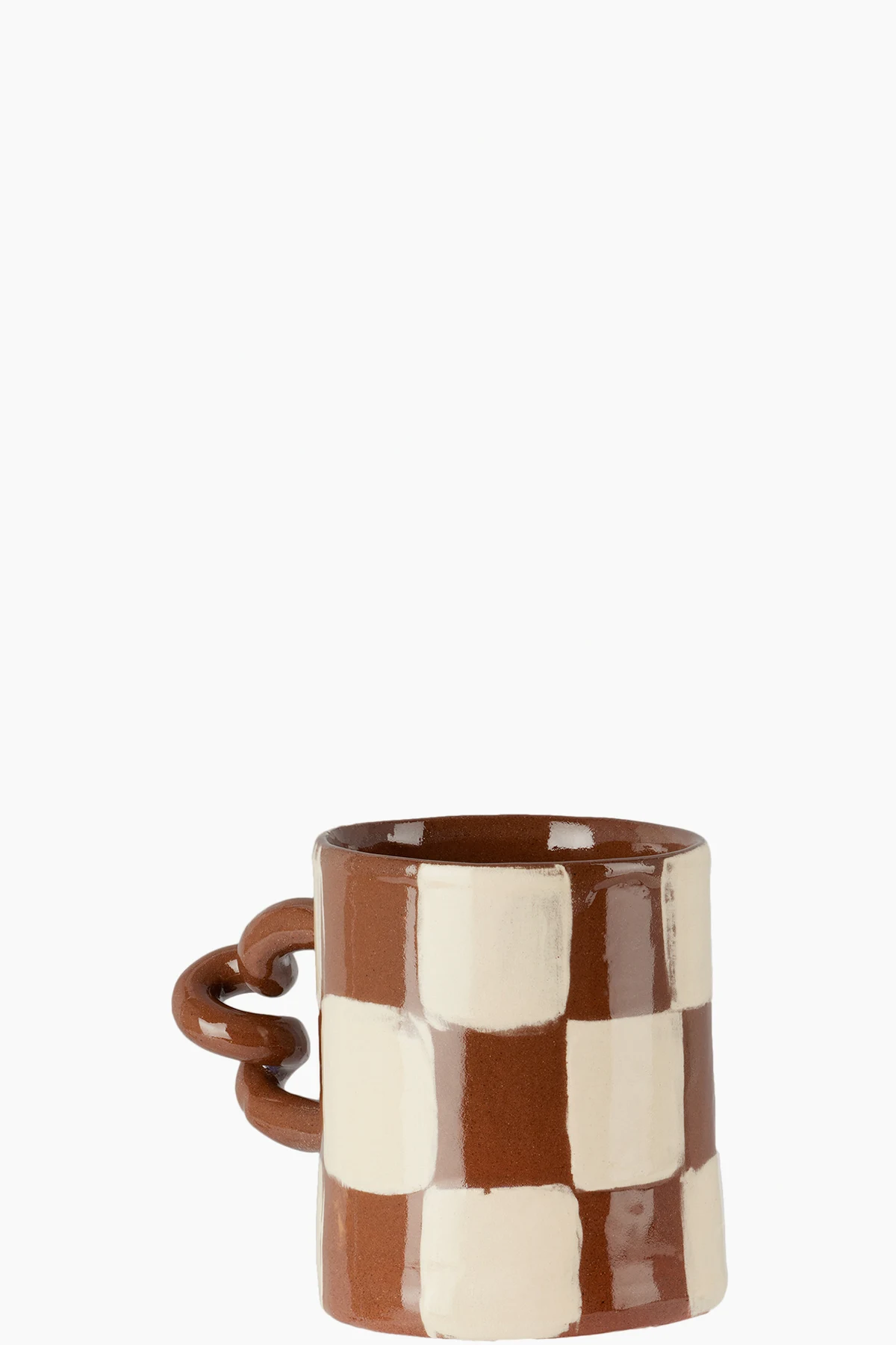 Handcrafted glazed terracotta mug in brown. Hand-painted check pattern in white throughout.