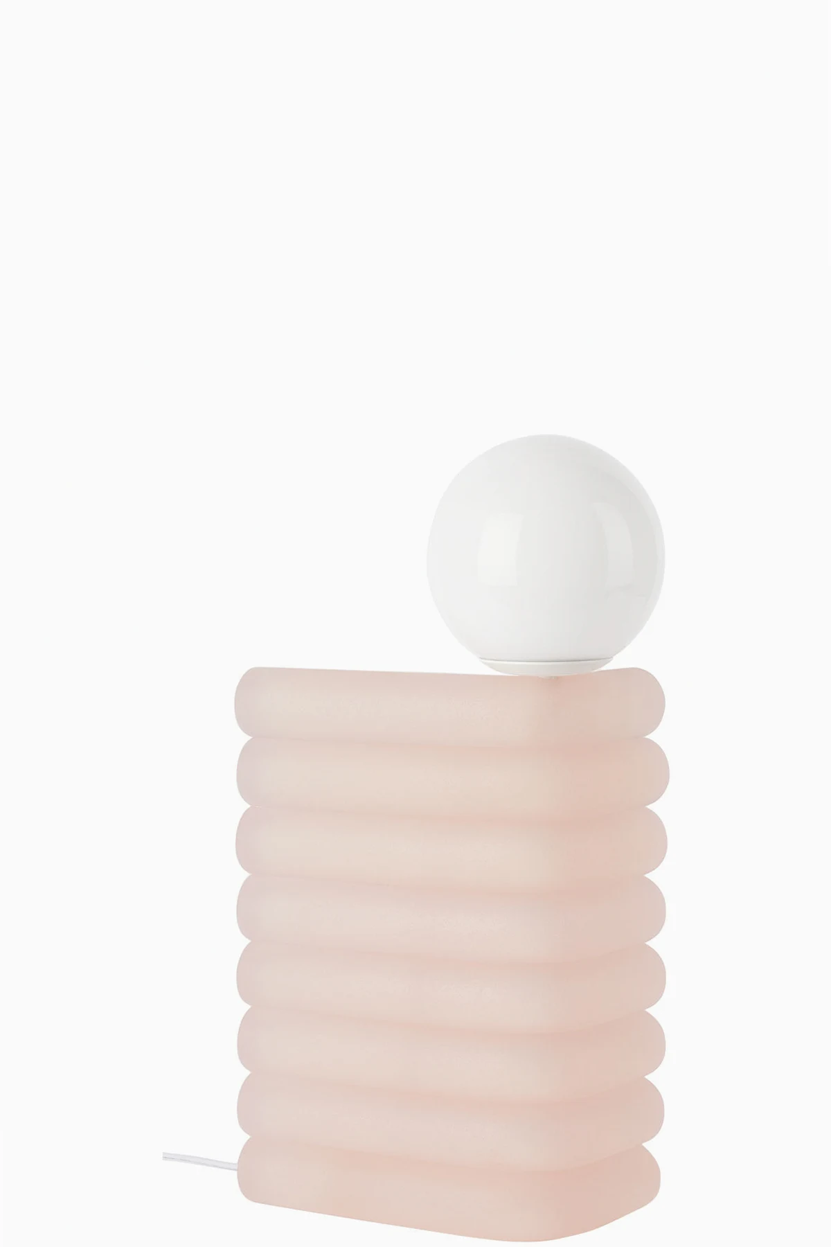 Textured cast resin lamp in pink. Glass globe. Detachable and optional voice-activated smart socket. Smart Life app required through iOS or Android.