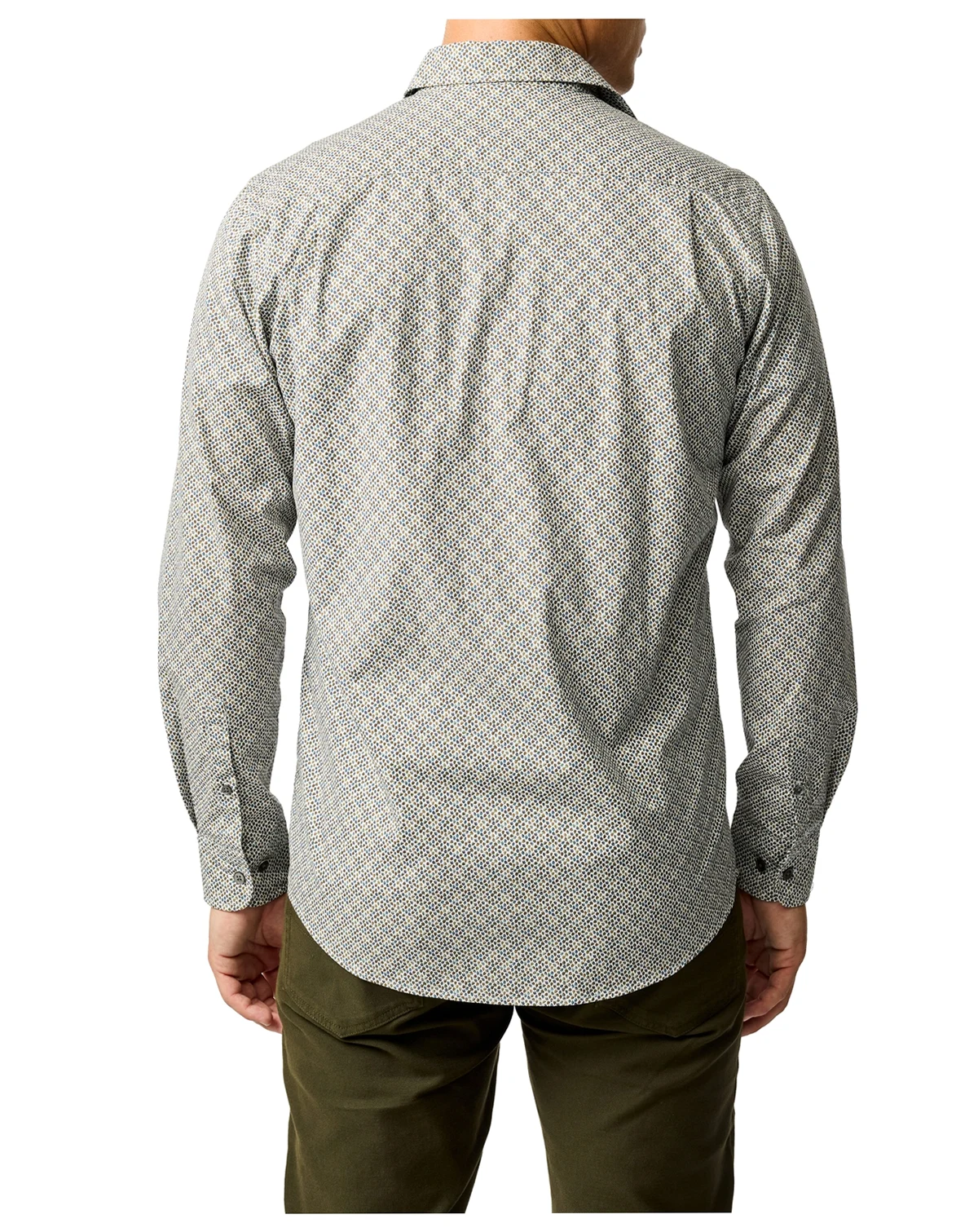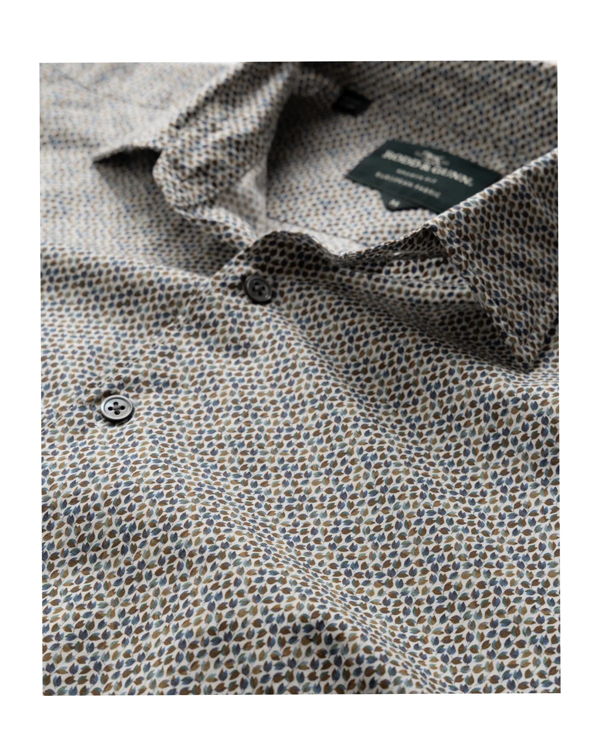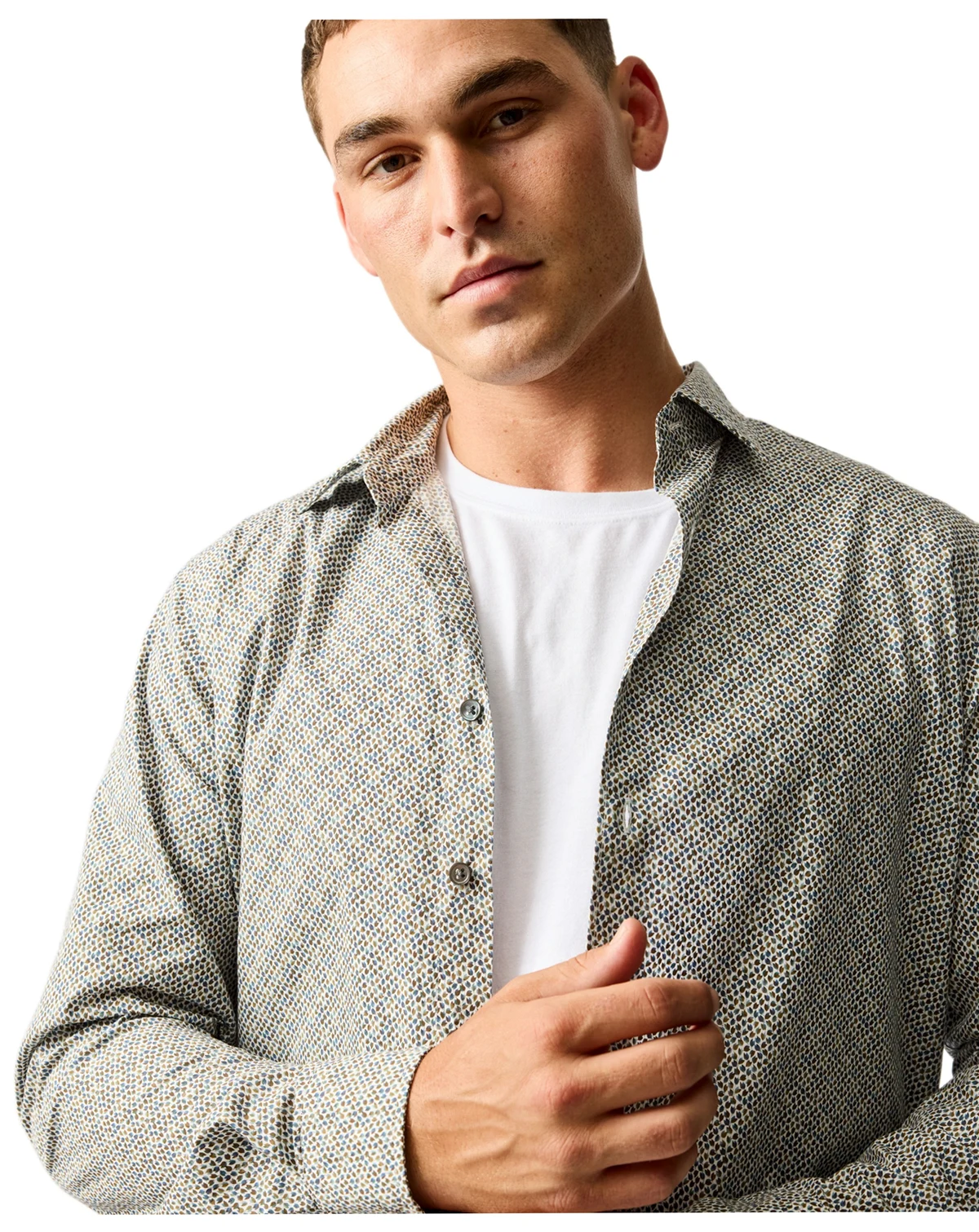 Elevate your wardrobe with this versatile long-sleeve shirt adorned with a leaf print in neutrals and blues on a white base. Cut from the highest quality European, lightweight cotton fabric.