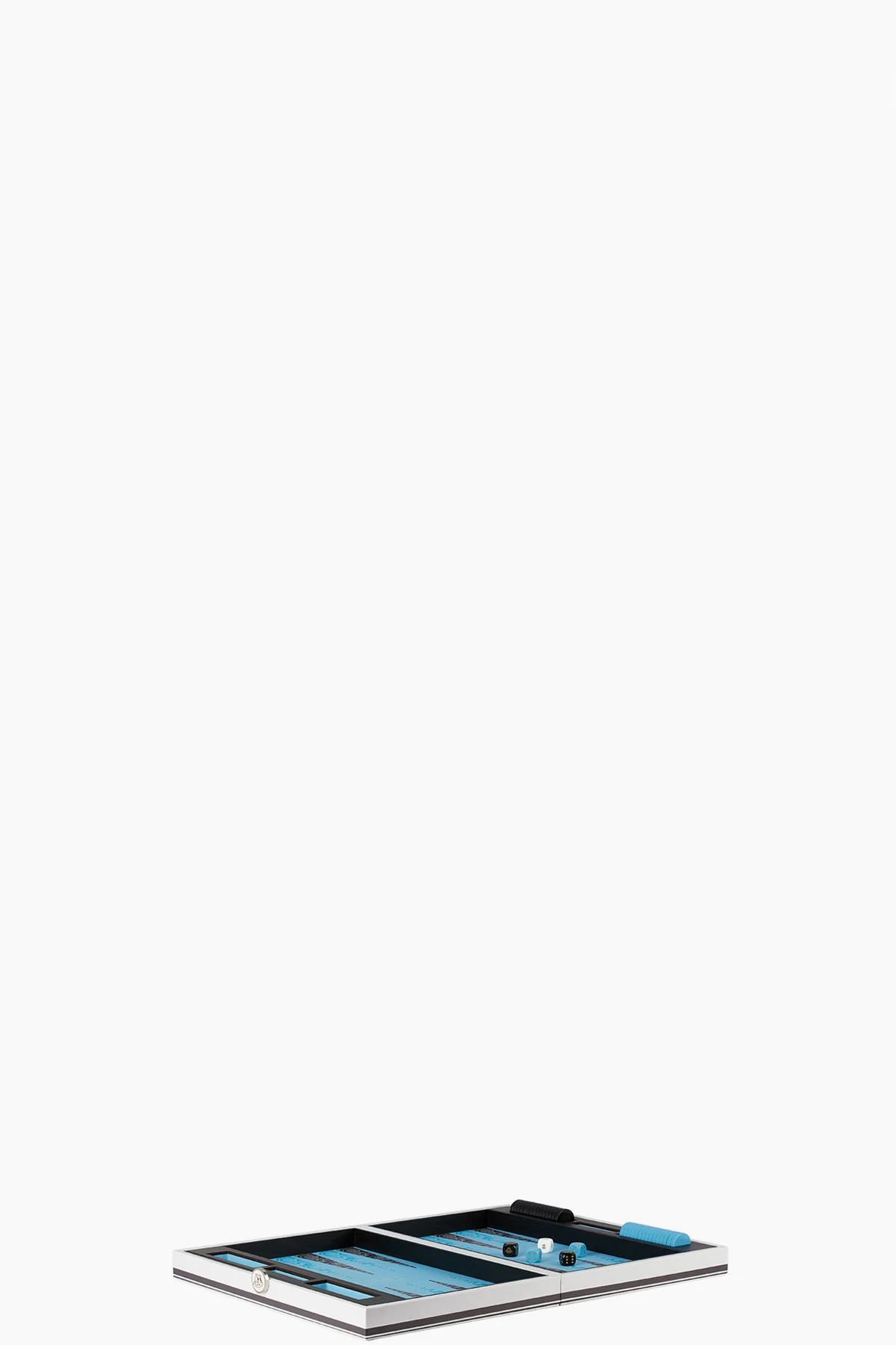 Backgammon set in black and blue. Hinged calfskin and faux-leather board with signature barocco pattern.
