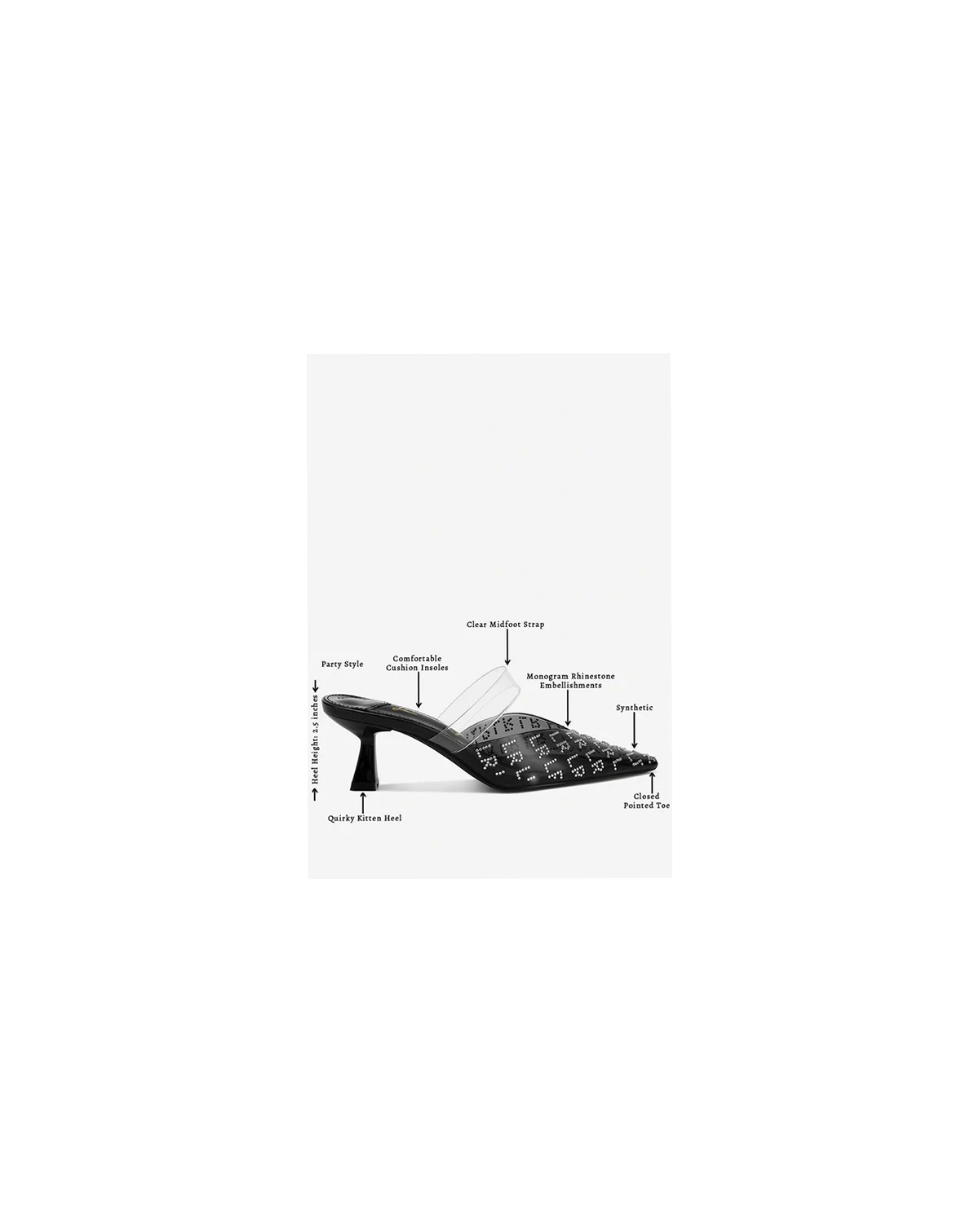 The kitten heel sandals have been a rampant rage in fashion! And we're taking it a notch up with the rhinestone embellishments and clear strap that adds layers of intrigue to the design. The comfortable cushion insole and the slip on construction make them an easy to wear fashionable pair!A Type: Slip On Sandals Upper Material: Synthetic Outer Sole: TPR Closed Pointed Toe Kitten Heels Rhinestone Embellished Vamp Slip On Design Clear Strap Detail Comfortable Cushion Insoles Heel Height: 2.5 inches SH4972