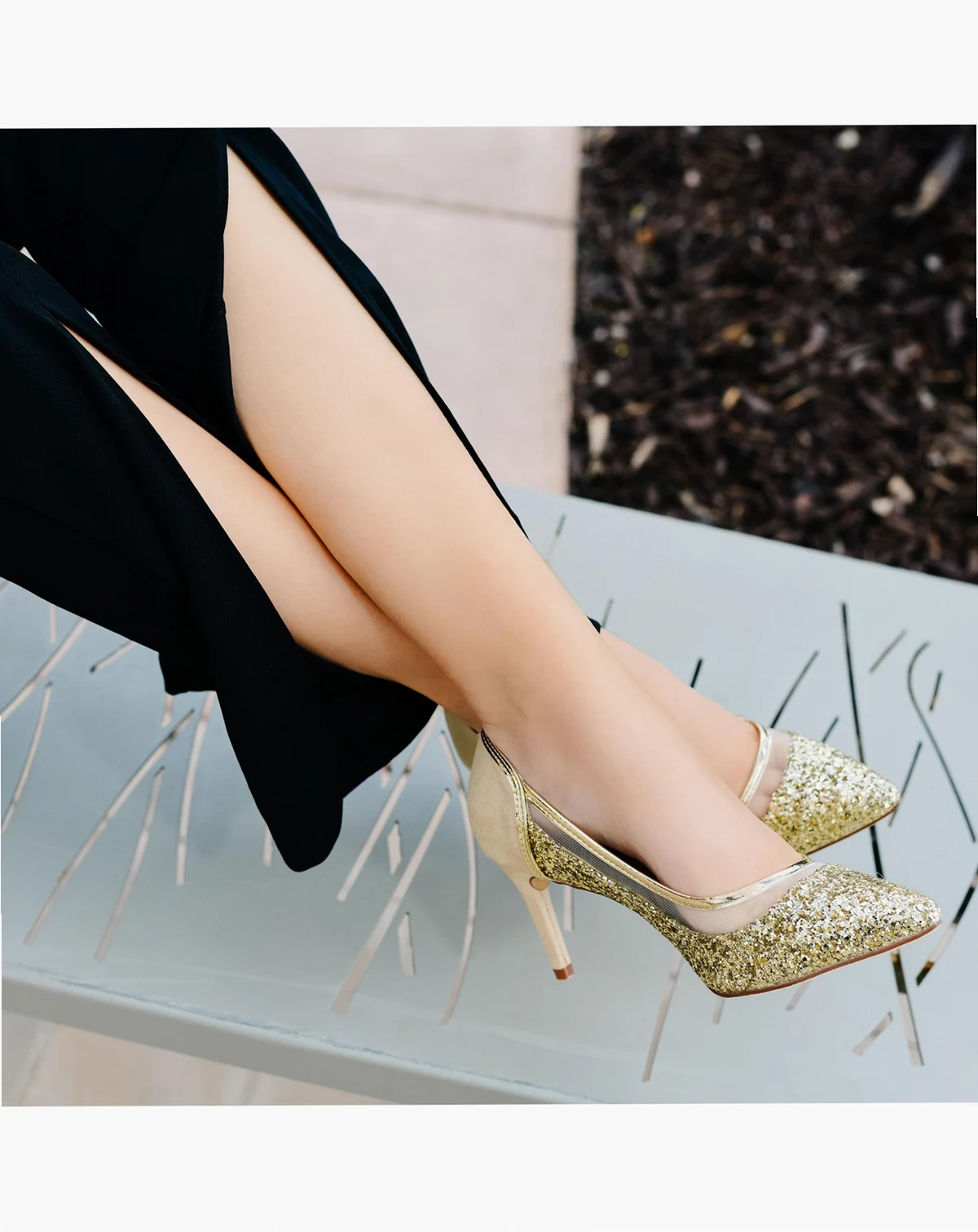 Covet glamourous style in glitter mesh pumps by Journee Collection. Glitter uppers compliment mesh detail shiny bordering with a patent finish. Faux suede accents the back heels and skinny stiletto high heels complete the look.