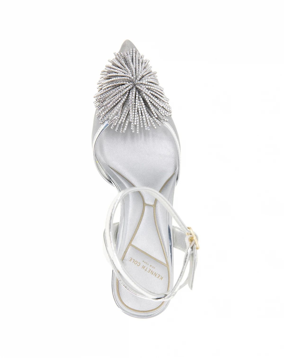 A jewel-encrusted pom pom ornament enriches the vamp of the Kenneth Cole New York Umi Pom Pom ankle strap martini heel pump.