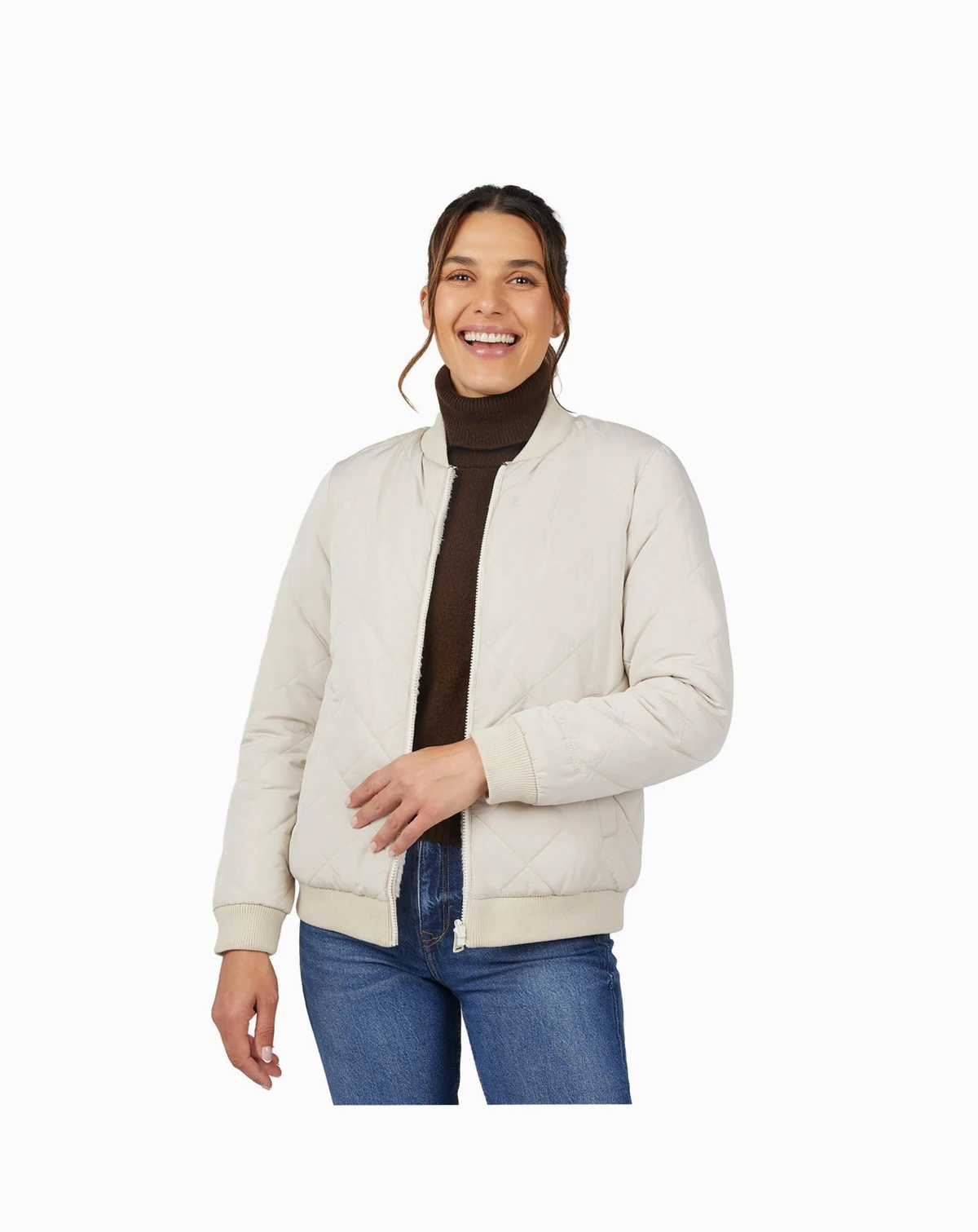 Take on the season in effortless style with the Women s Quilted Reversible Bomber Jacket. Made from 100% recycled polyester—about 6 recycled bottles—it features cozy sherpa on one side and a wind-resistant quilted shell on the other for versatile warmth and performance. A reversible front zipper, snap-closure pockets, and utility-inspired sleeve patch blend urban style with outdoor function. Whether you're commuting or trail walking, this eco-friendly bomber s got your back.