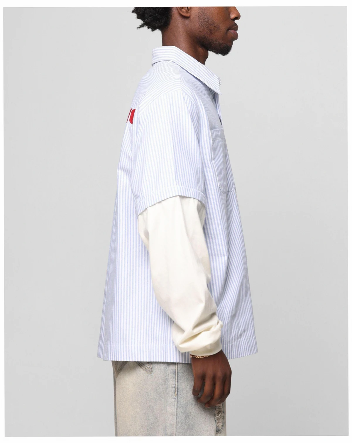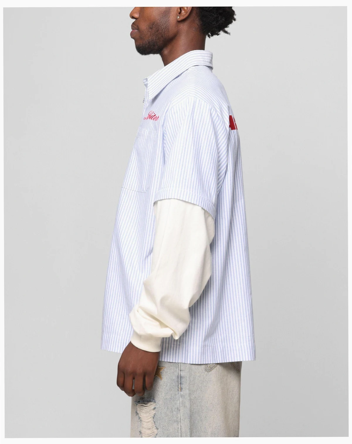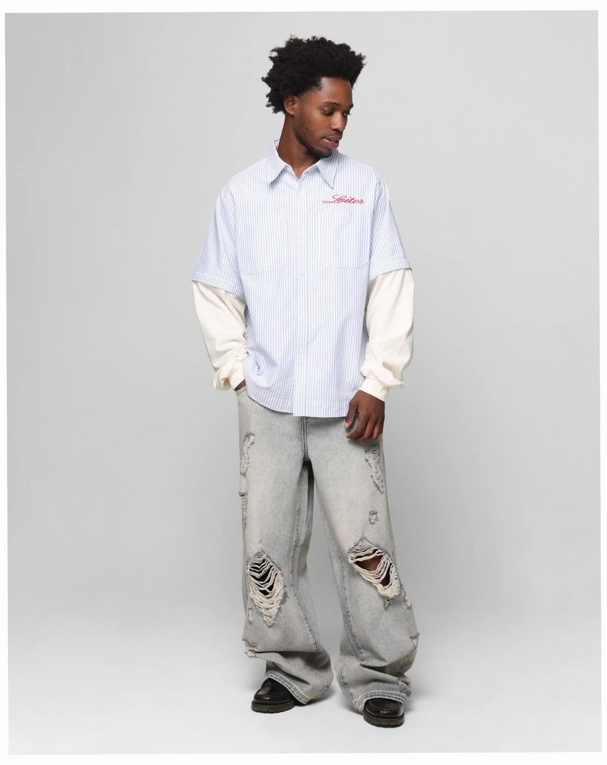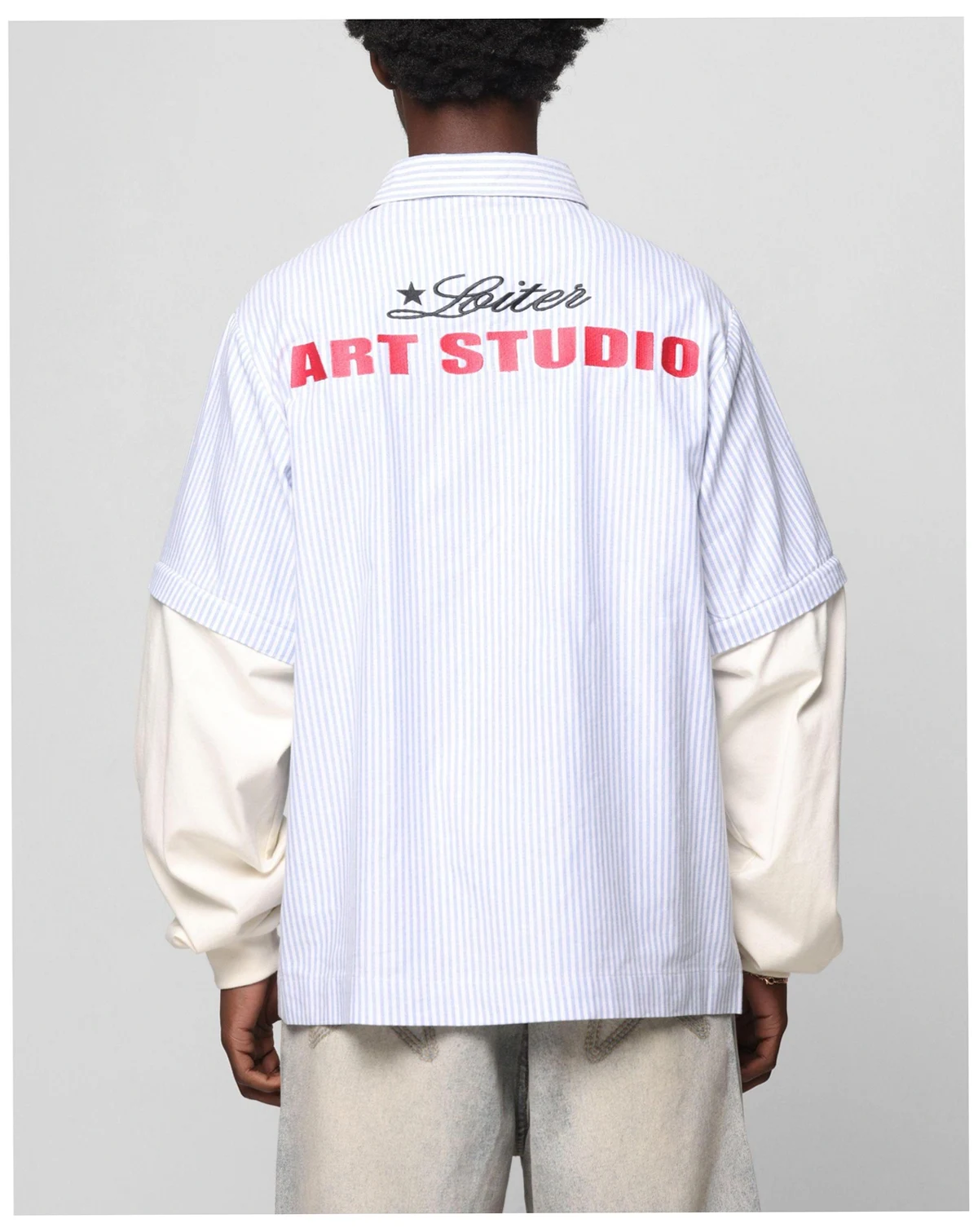 The Art Studio Work Shirt by Loiter has embroidered graphics with a button-up for that classic vibe, with contrast camo sleeves for a standout look. Finished off with an ultra flattering oversized fit and dropped shoulders.