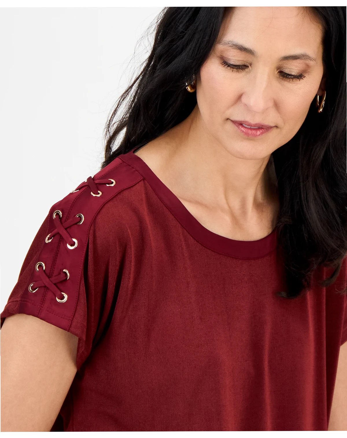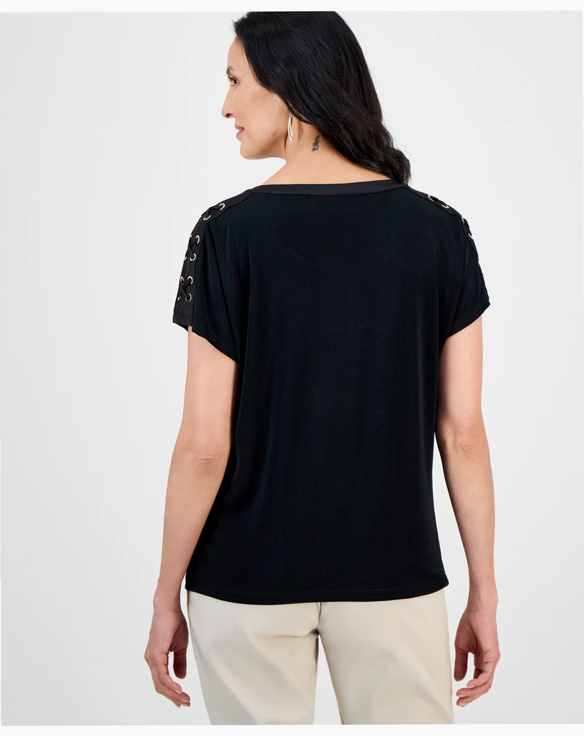 Upgrade your wardrobe with a short-sleeve jersey top from JM Collection featuring metal grommets and lace-up details.