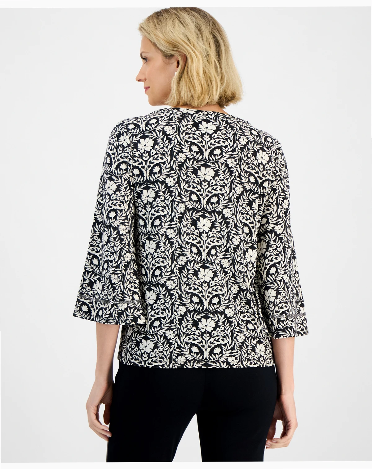 Embellished with mirror rhinestone trim, this painted foliage top from JM Collection adds a touch of sparkle to a relaxed silhouette. A V-neck and short sleeves provide a comfortable and flattering fit.