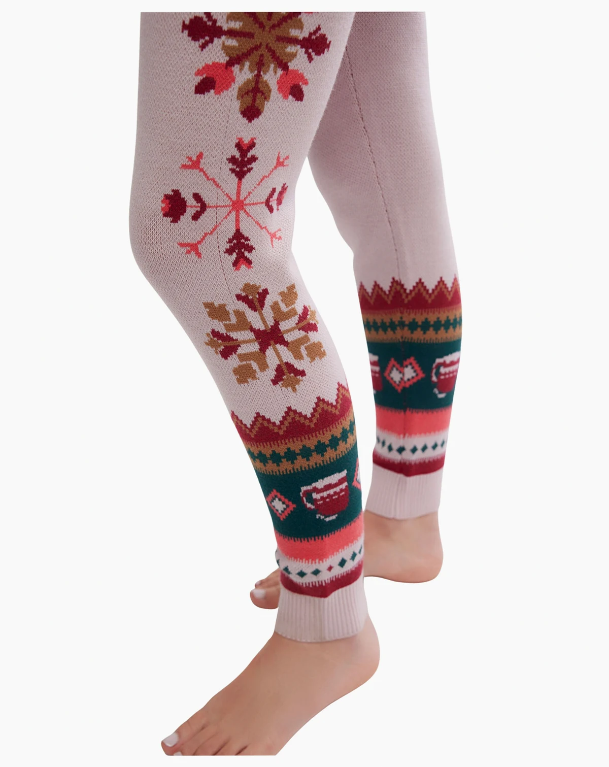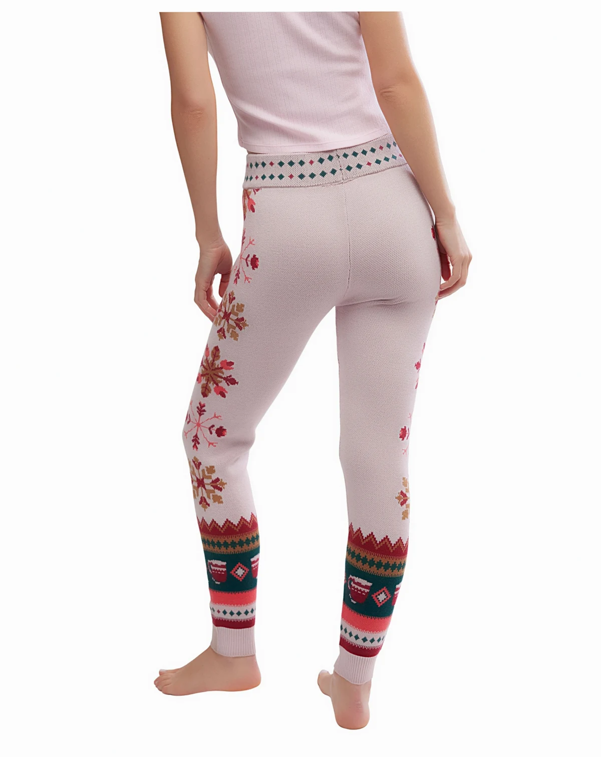 Mid rise; hits at ankle; approx. 27" long; Snowflake motifs running down the side of the leg