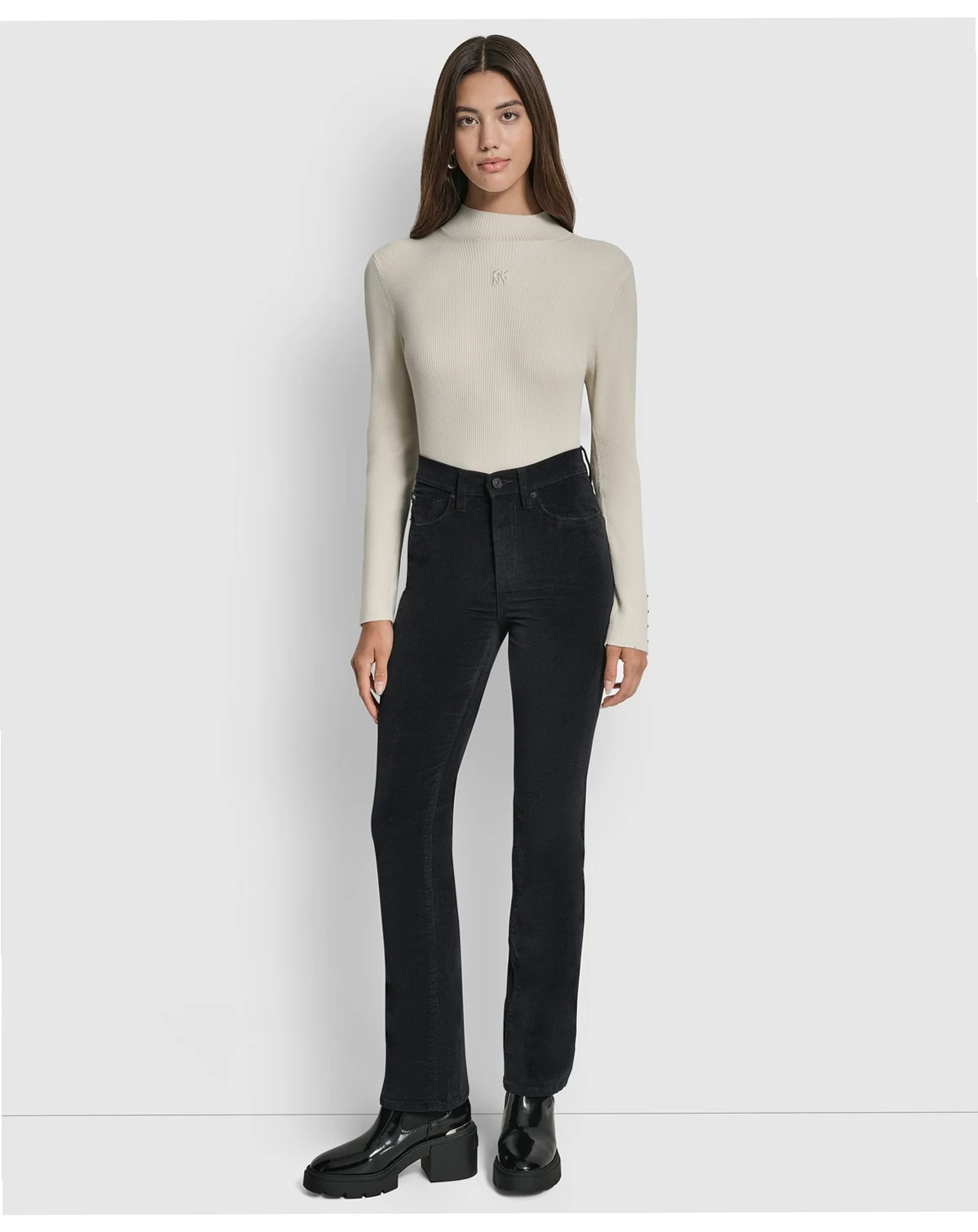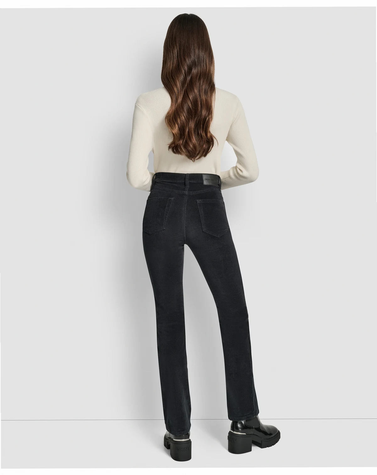 Highlighting a high waisted bootcut silhouette, these jeans from DKNY Jeans offer a sleek and elongating fit. A zip and button closure with functional five-pocket styling ensures both security and classic appeal.