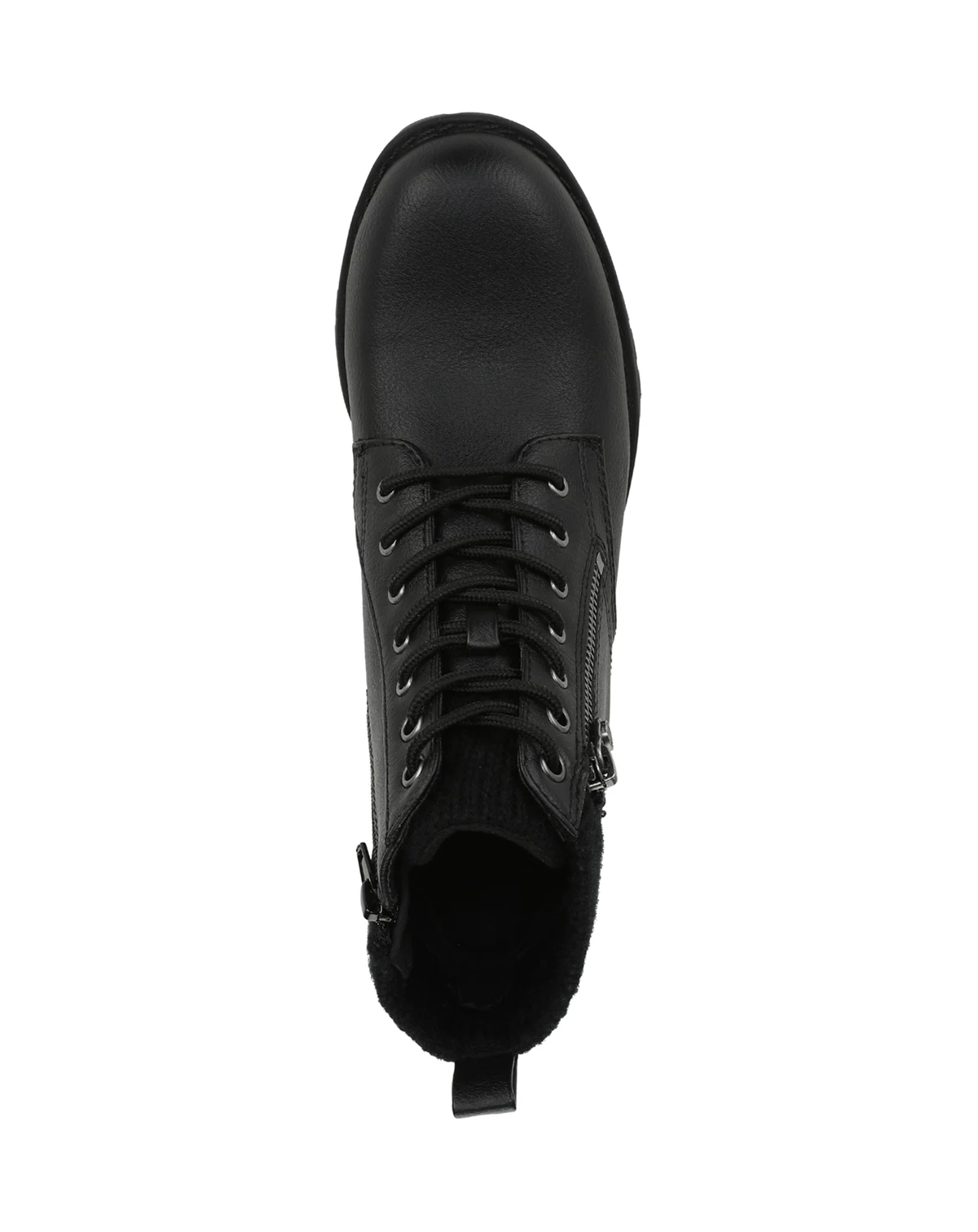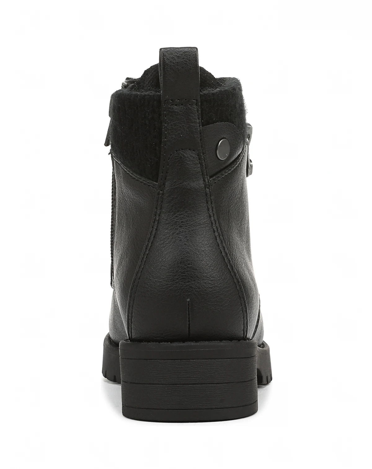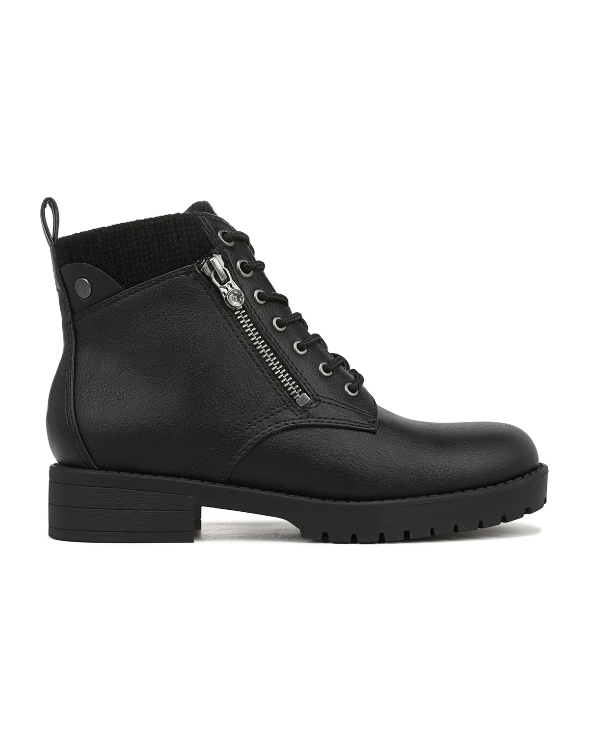 Get that moto look with SoCal vibes in the Deva ankle boot from Blowfish Malibu. Features include a soft sweater knit collar and tongue, decorative outer zipper, and lug sole. Faux leather upper with sweater knit collar and tongue. Inside zipper for easy on/off and lace-up front for a secure fit. Decorative outside zipper. 1 3/8 inch block heel and trending lug sole.