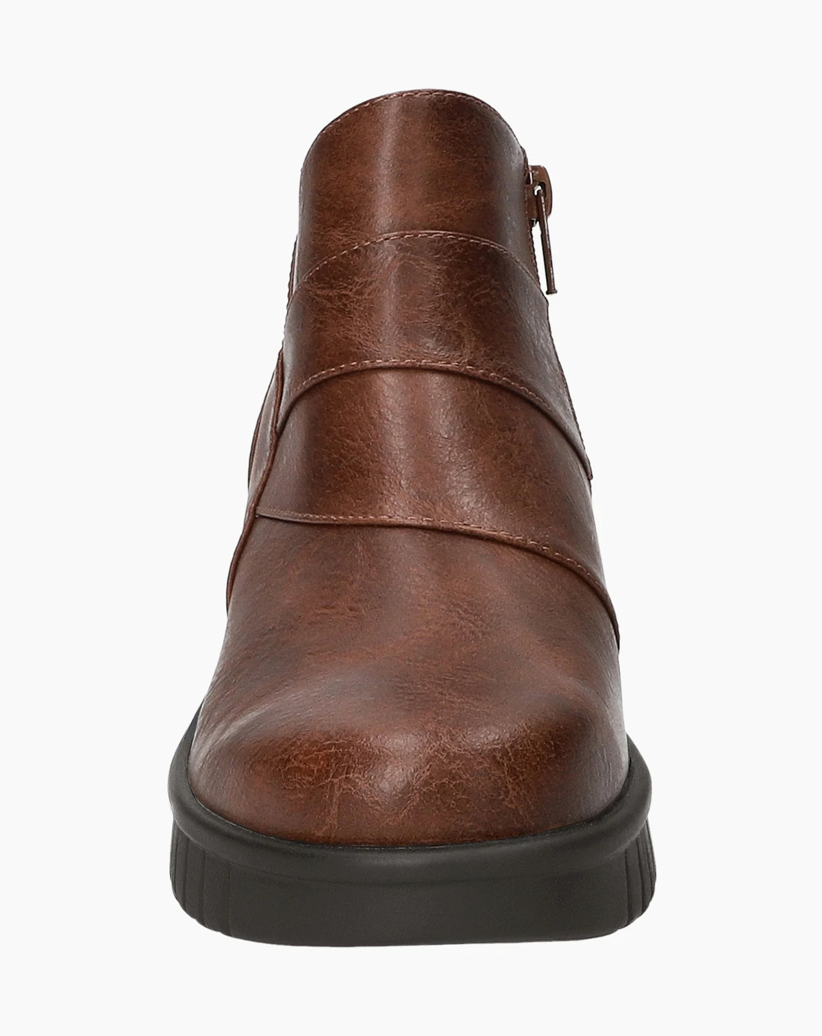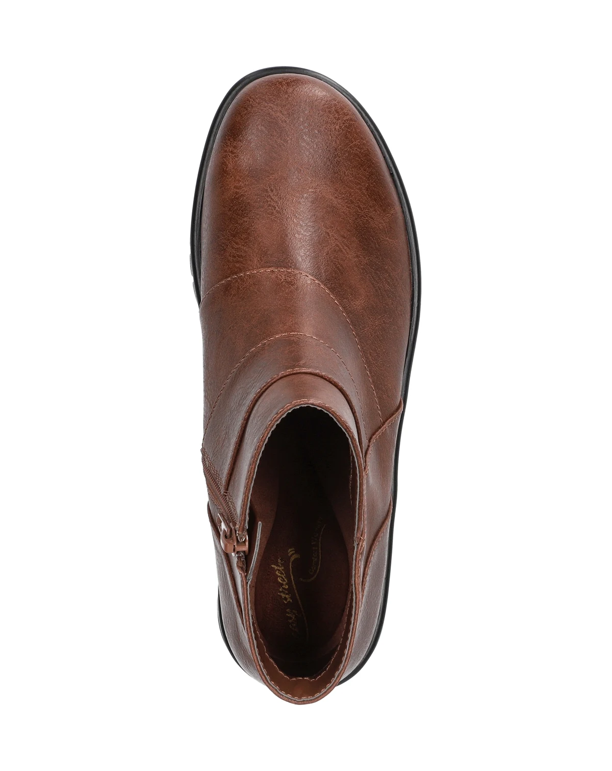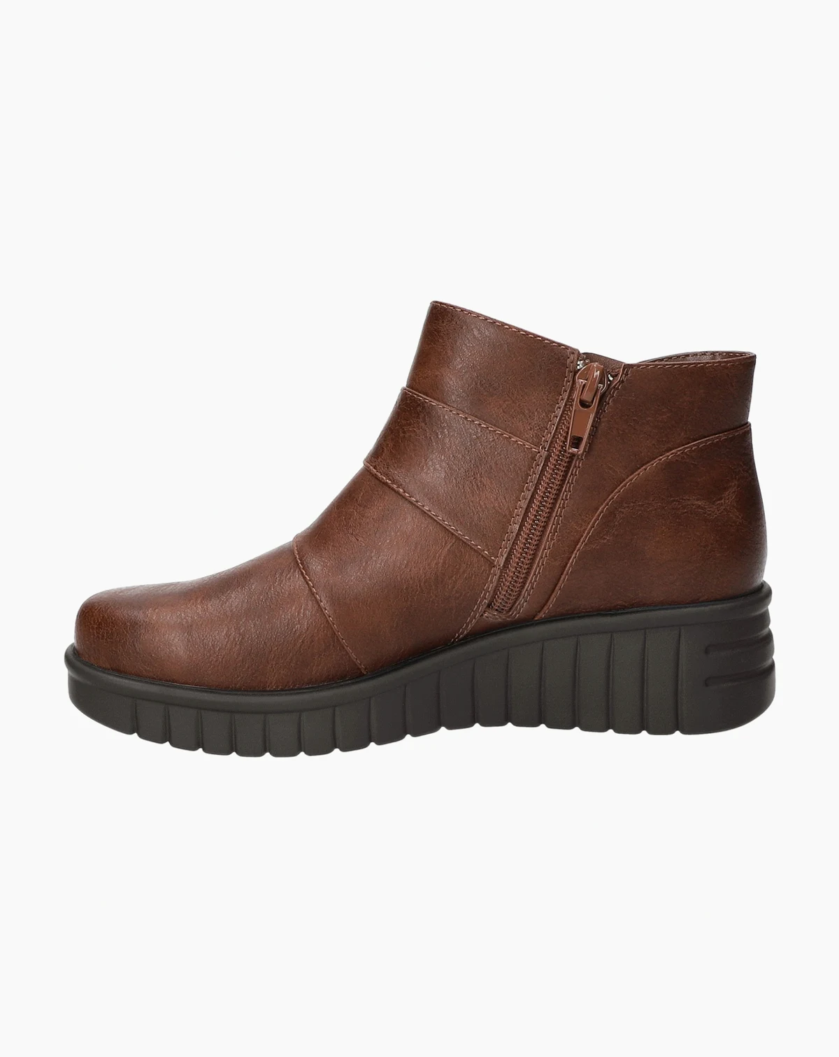 The Rayleen ankle boot by Easy Street is designed for both style and comfort. It features a lightweight and flexible Comfort Wave platform construction, along with a trendy layered detail overlay upper, making it a fresh, new look for the season. Enhanced with ultra-light removable insoles from Easy Motion by Easy Street, it ensures all-day comfort. The inside zipper allows for easy on and off access.