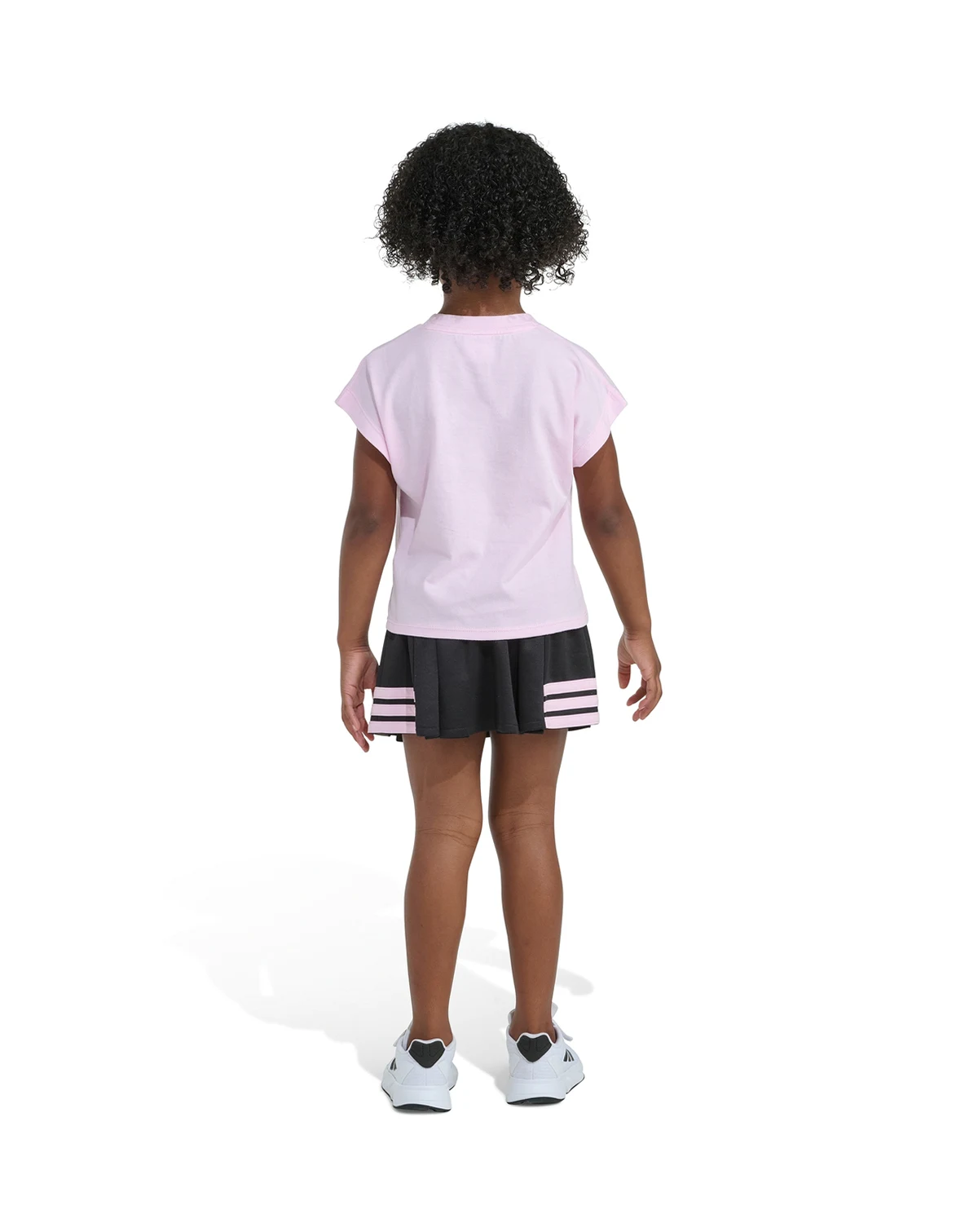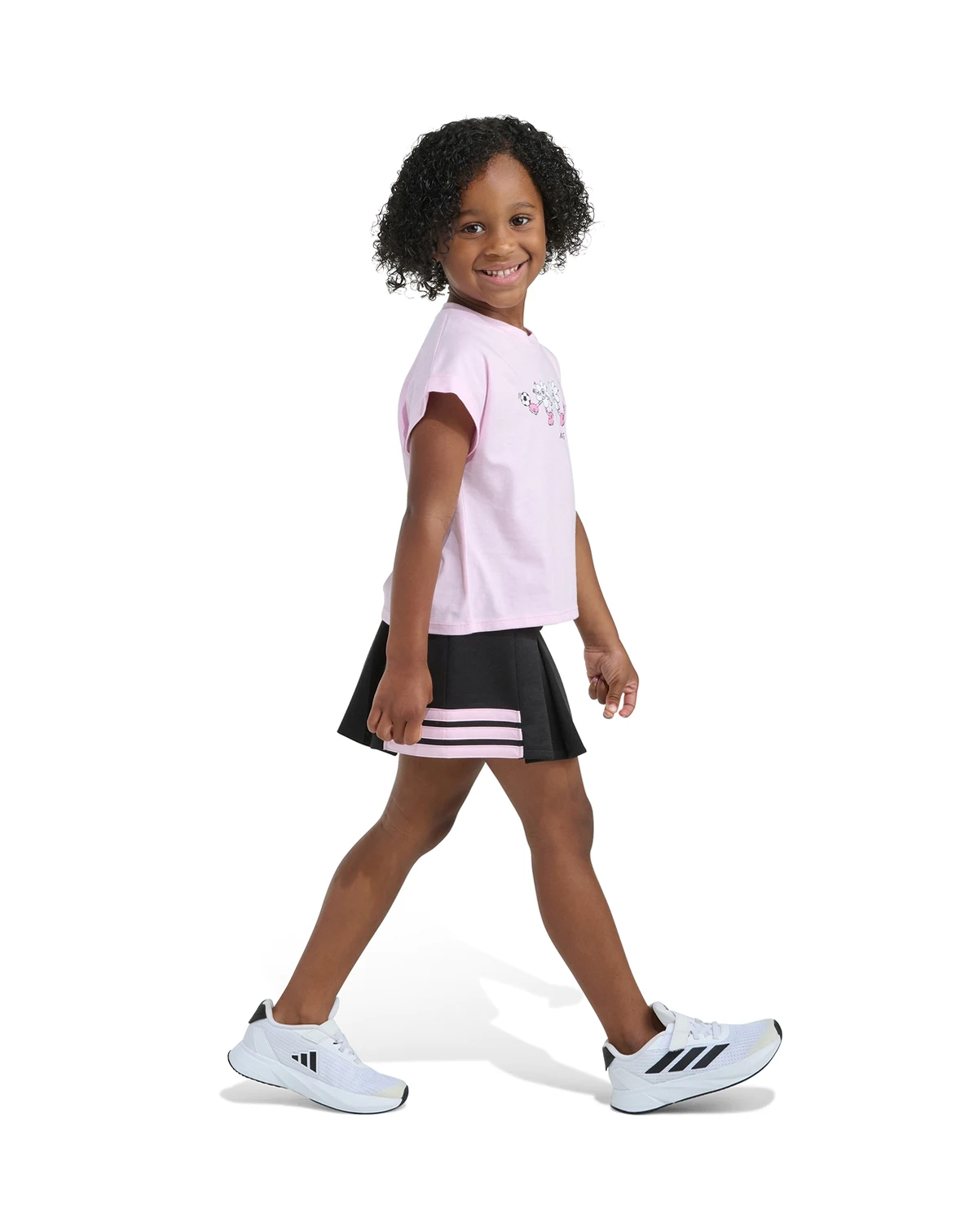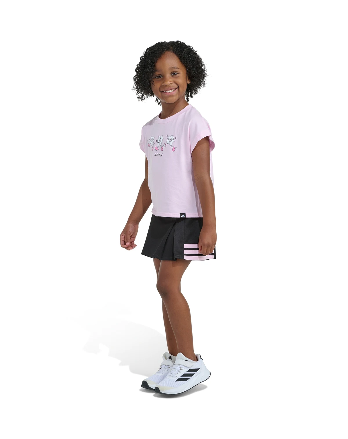 Letting little ones shine, this adidas 2-piece set includes a short-sleeve box T-shirt and a pleated skort with internal bike shorts. The iconic 3-stripes graphic on the side hems adds a sporty flair.
