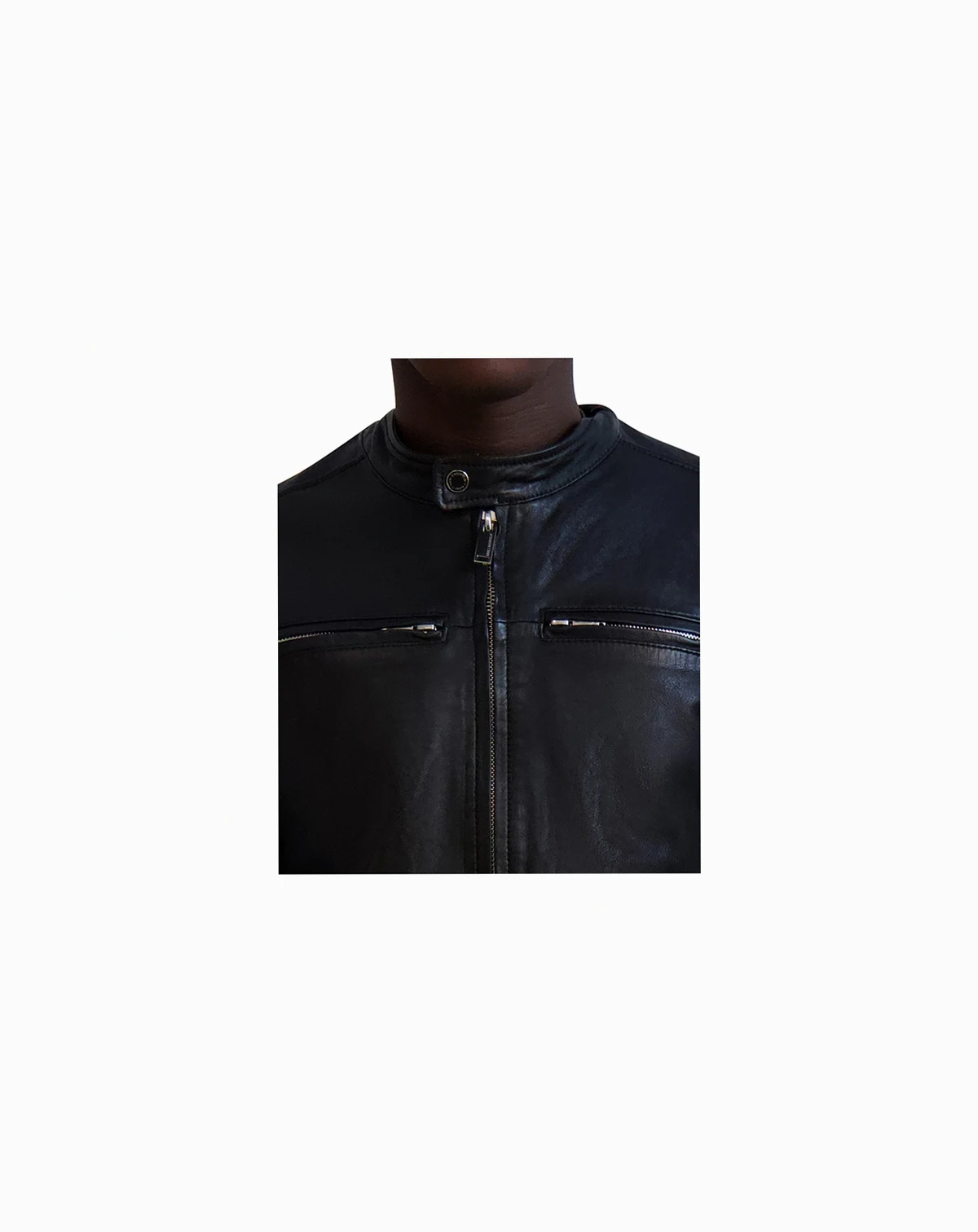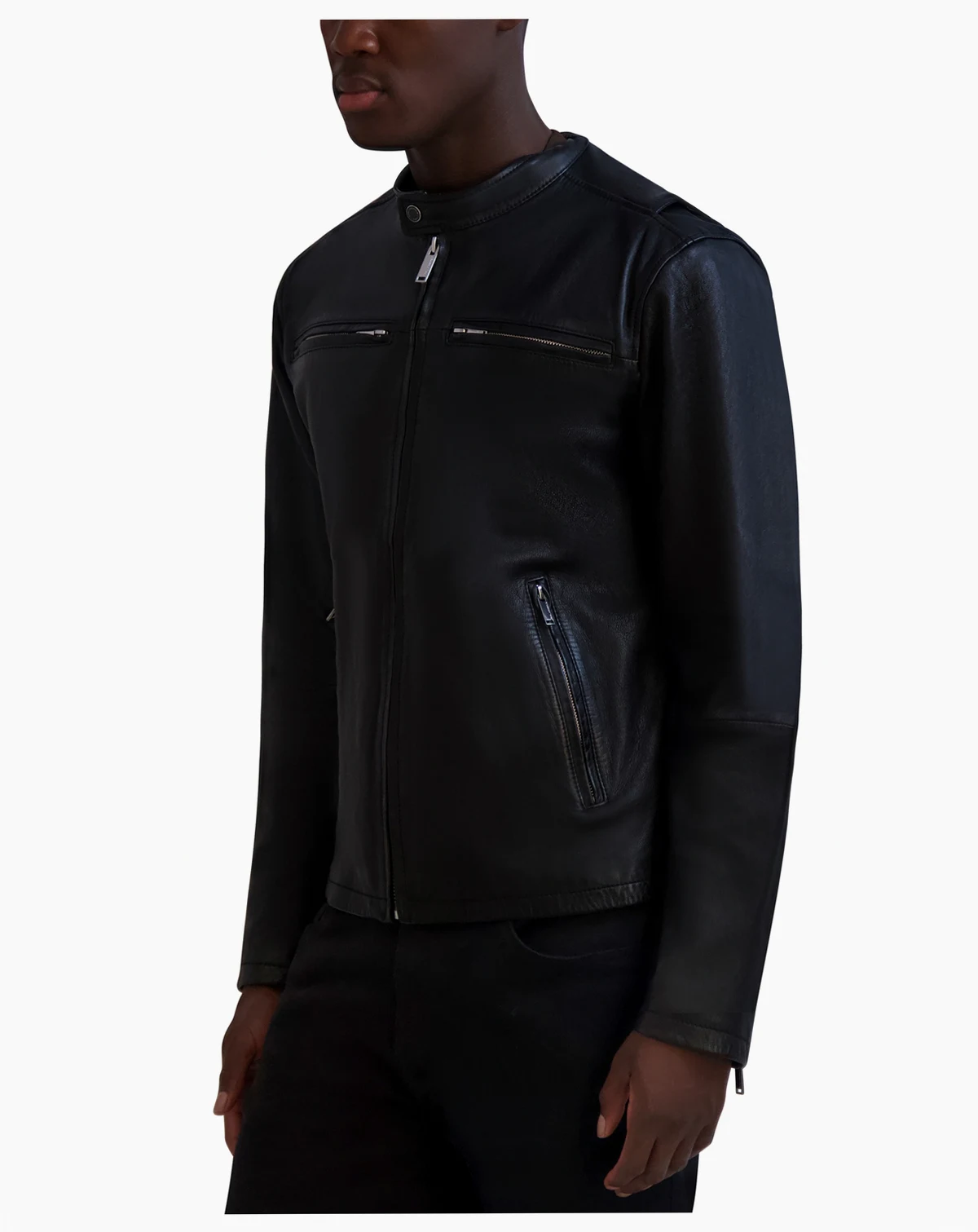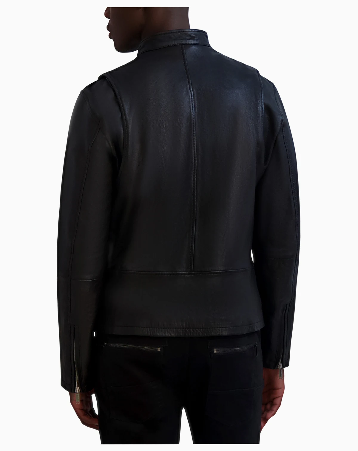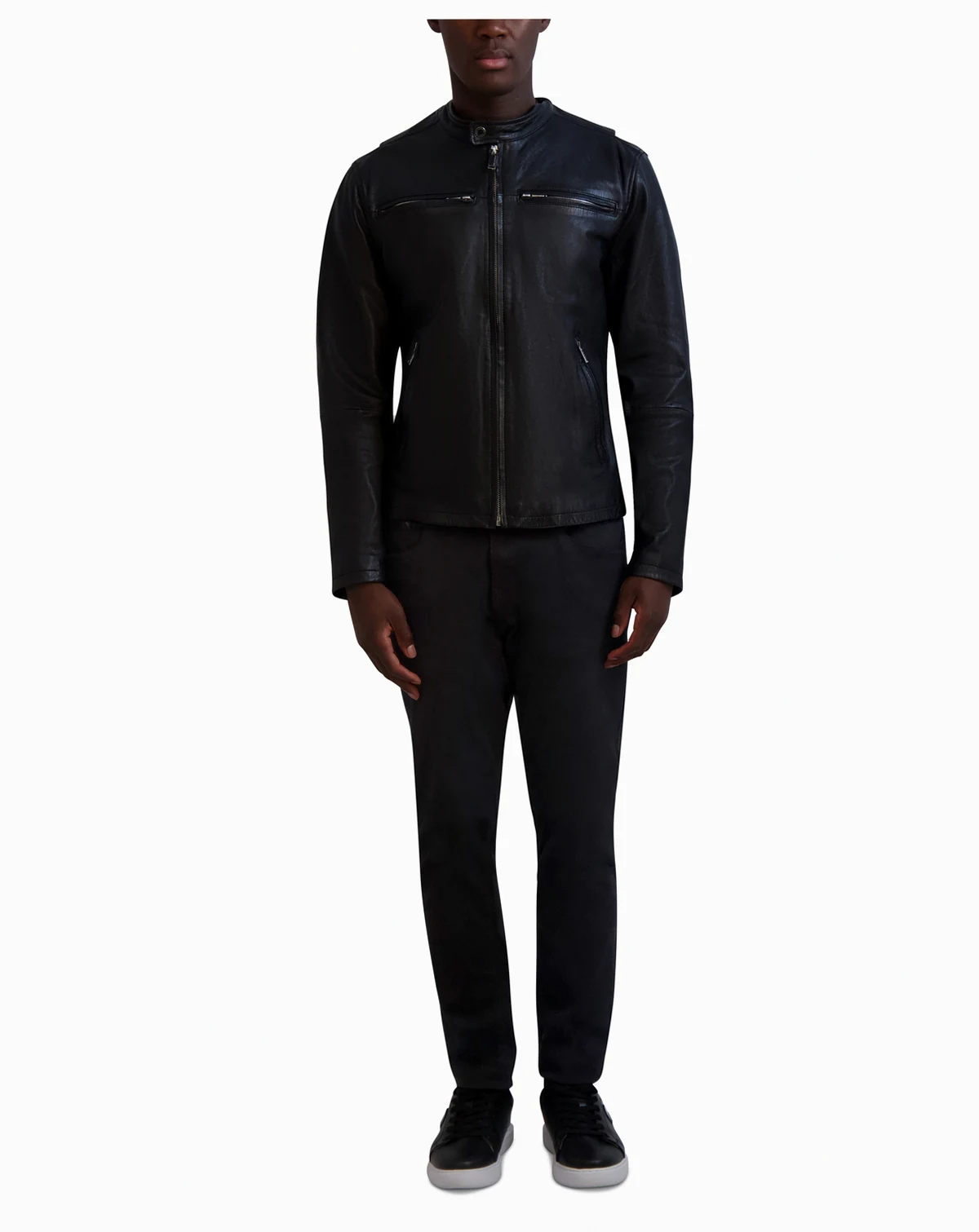 A classic in supple leather, this Karl Lagerfeld jacket instantly elevates any look. Exposed zippers and distressed details add an edge.