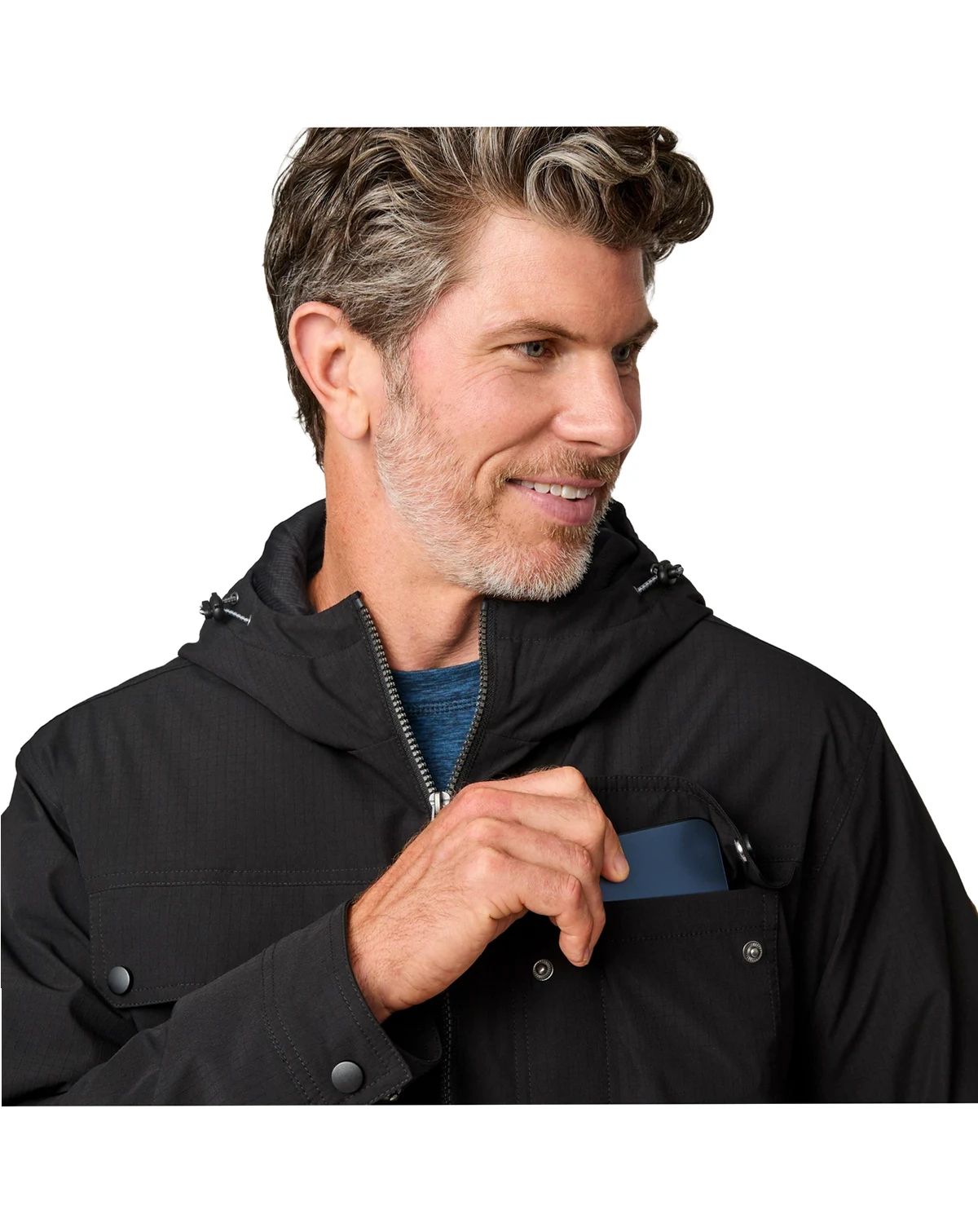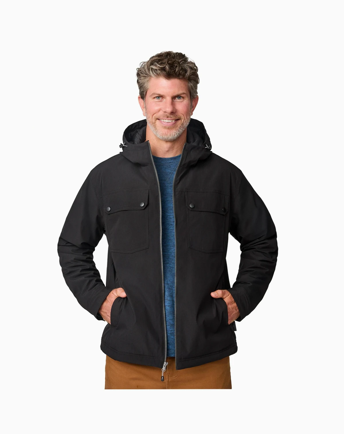 From job sites to trail treks, the Fieldsman Work Jacket delivers rugged durability with eco-conscious comfort. Its mechanical stretch shell and quilted REPREVE recycled insulation offer warmth and mobility in wind and light rain. A detachable hood, adjustable cuffs, and zippered pockets add function, while the textured polyester shell, drop tail hem, and storm placket enhance coverage and weather protection.