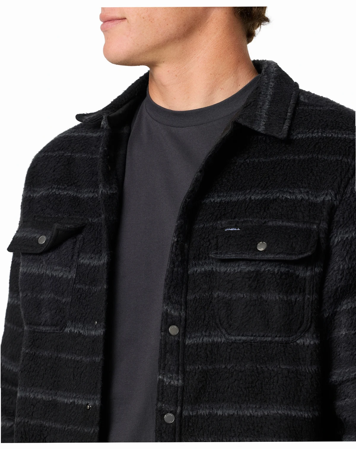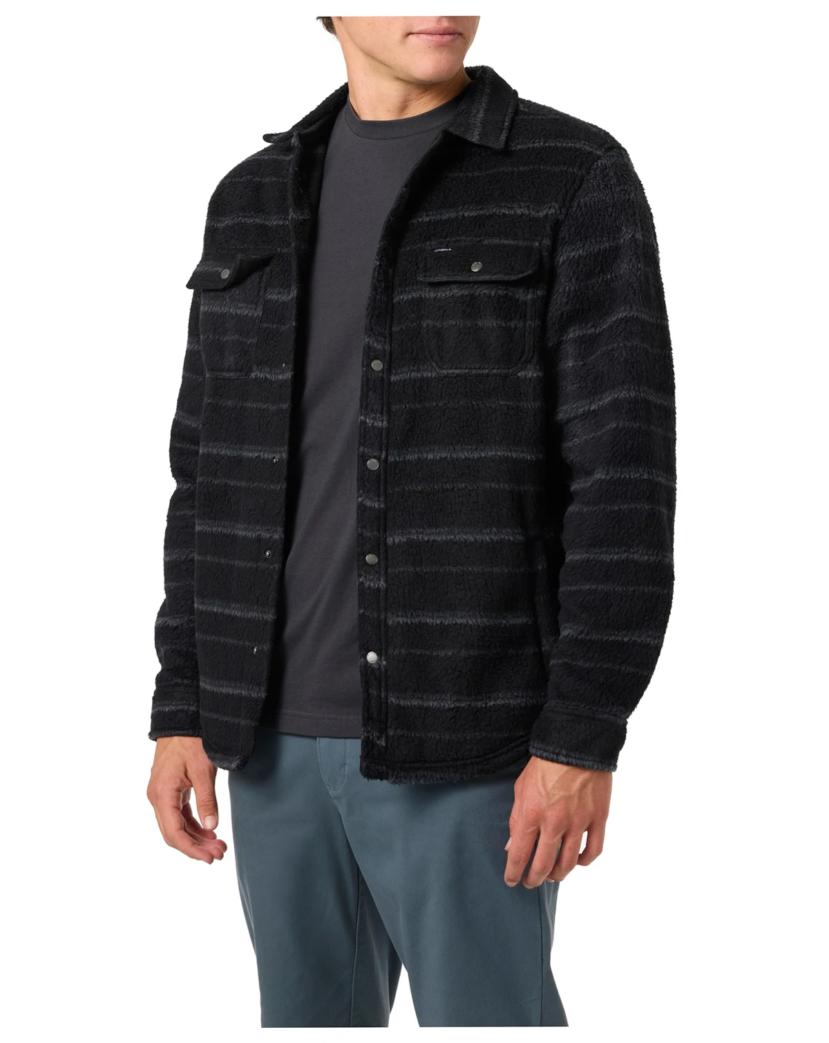 Layer with style in this high pile overshirt from O'Neill, featuring center front snaps and double chest pockets with snaps. Adjustable cuffs with snaps and welt hand pockets offer a comfortable and practical design.