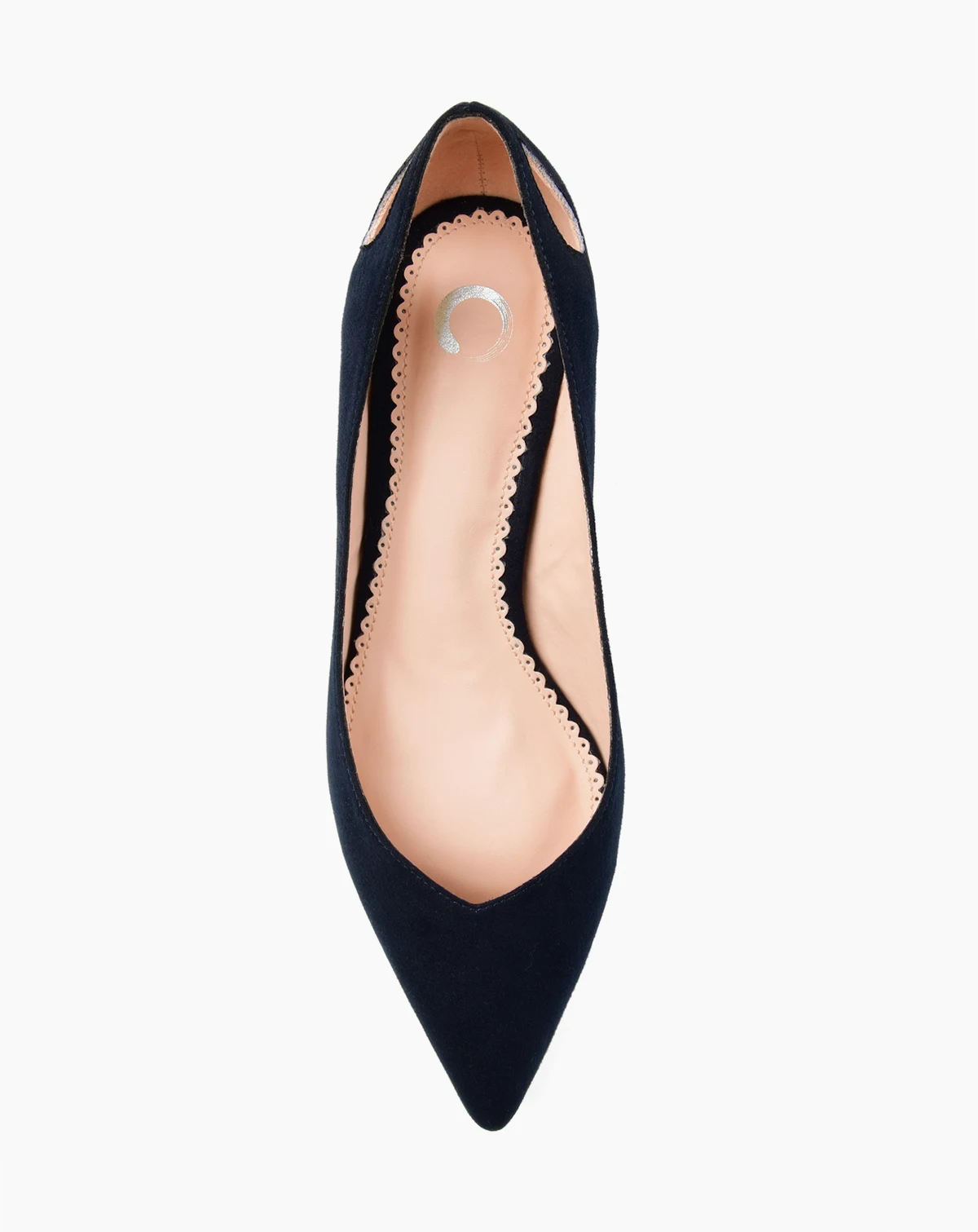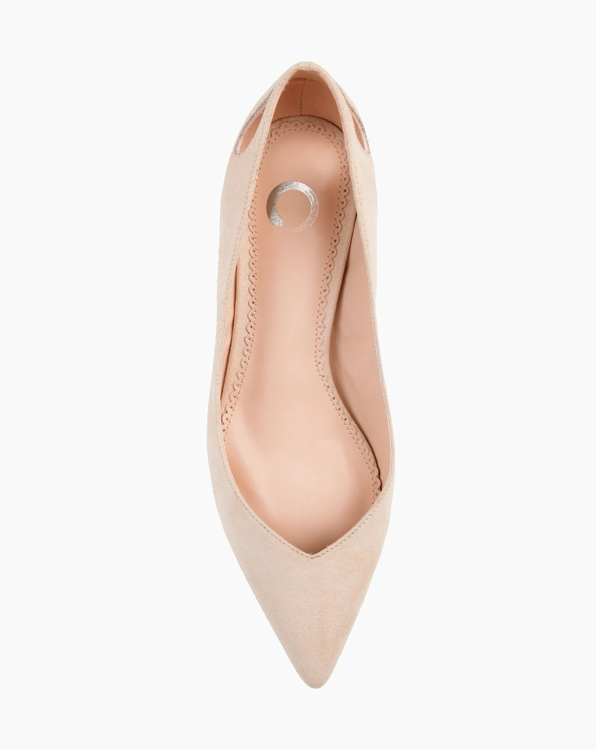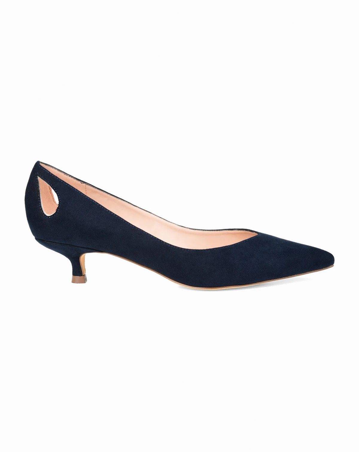 Add a beautiful addition to your closet with the Goldie kitten heel by Journee collection. This adorable heel features a soft faux suede material with a cut-out design on the heel. The angled design at the toe complete this look.