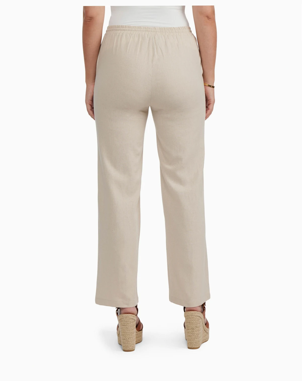 Go with the flow in these breezy linen blend wide leg pants. They feature a comfortable pull-on elastic waistband, inseam pockets and adjustable strings with beads and tassel details for a fashionable touch.