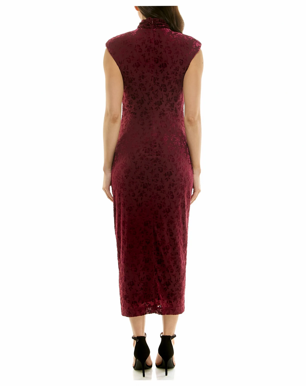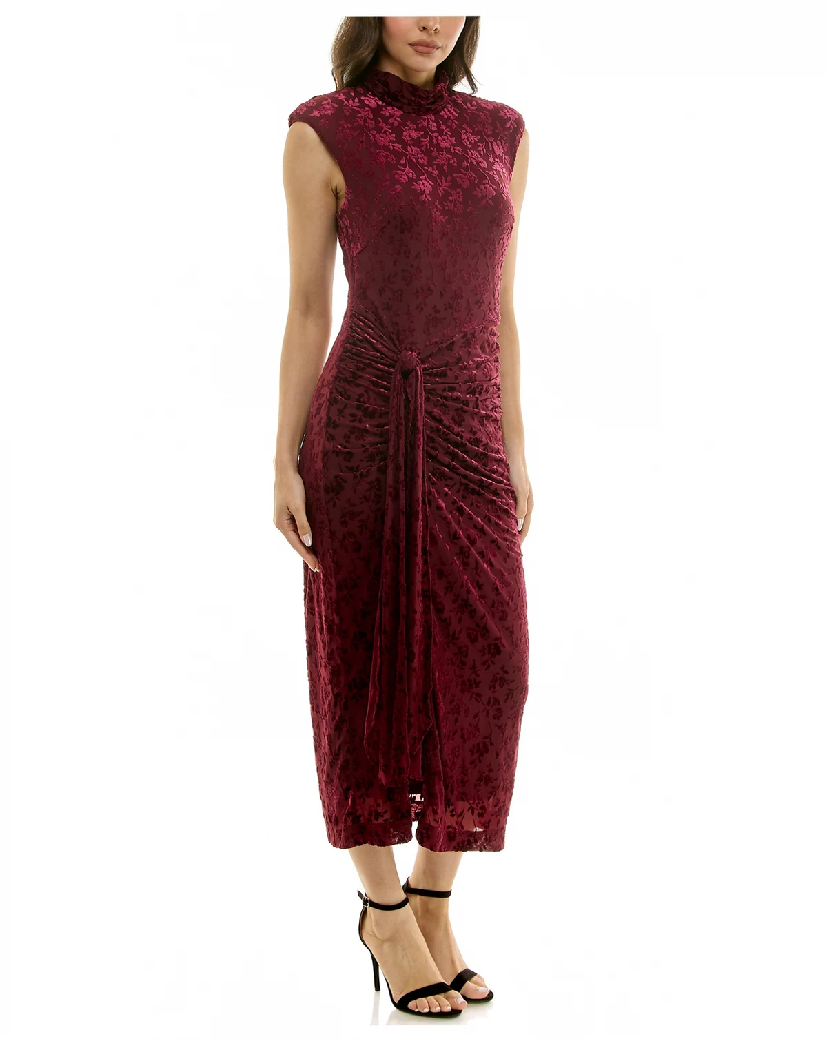 Highlight sophistication with this Taylor tie front mock neck shirred midi dress, featuring a knot detail that offers flexible fit at the hip. The back zipper allows practical wear, making it suitable for work or evening occasions.