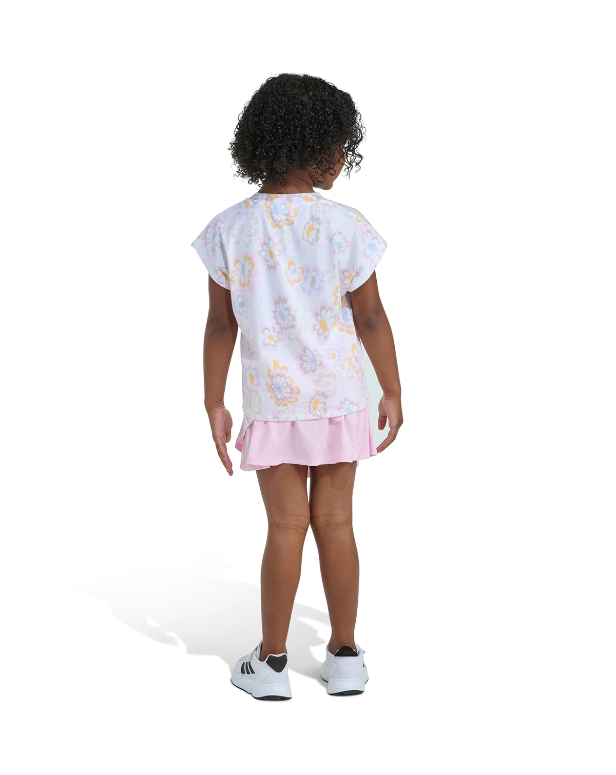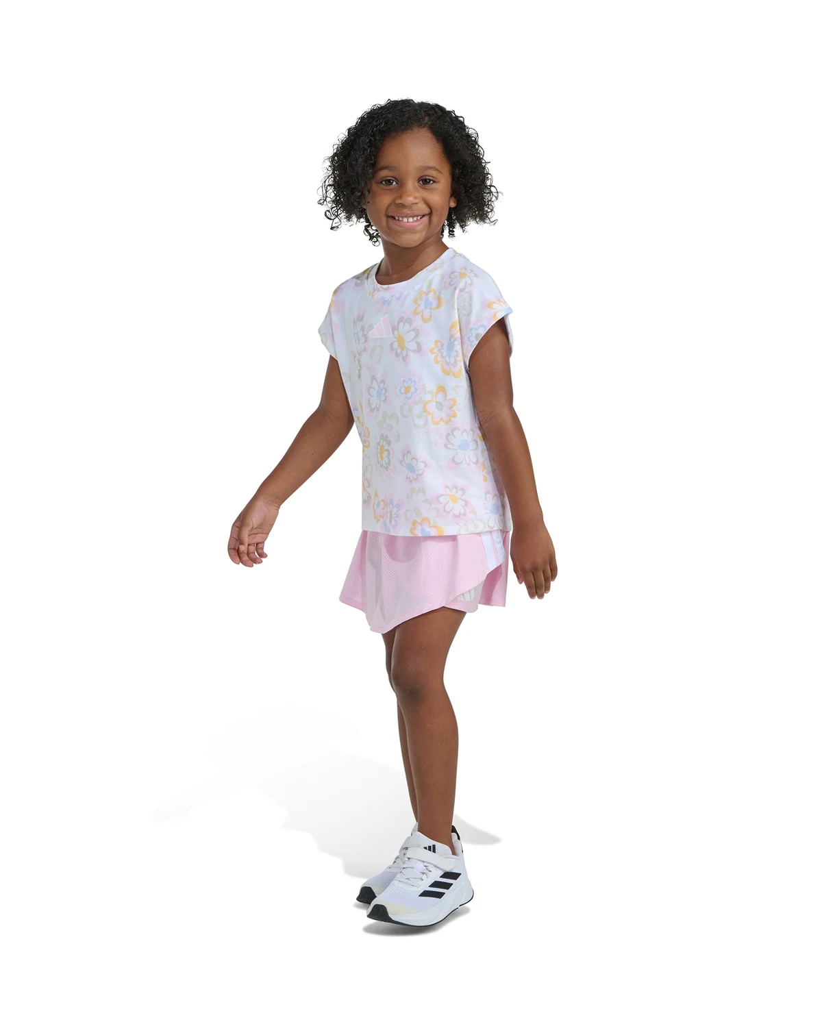 A great choice for children's playtime, this adidas 2-piece set pairs a printed box T-shirt with a faux wrap skort featuring a flouncy asymmetrical hem. The elastic waistband ensures comfortable play.