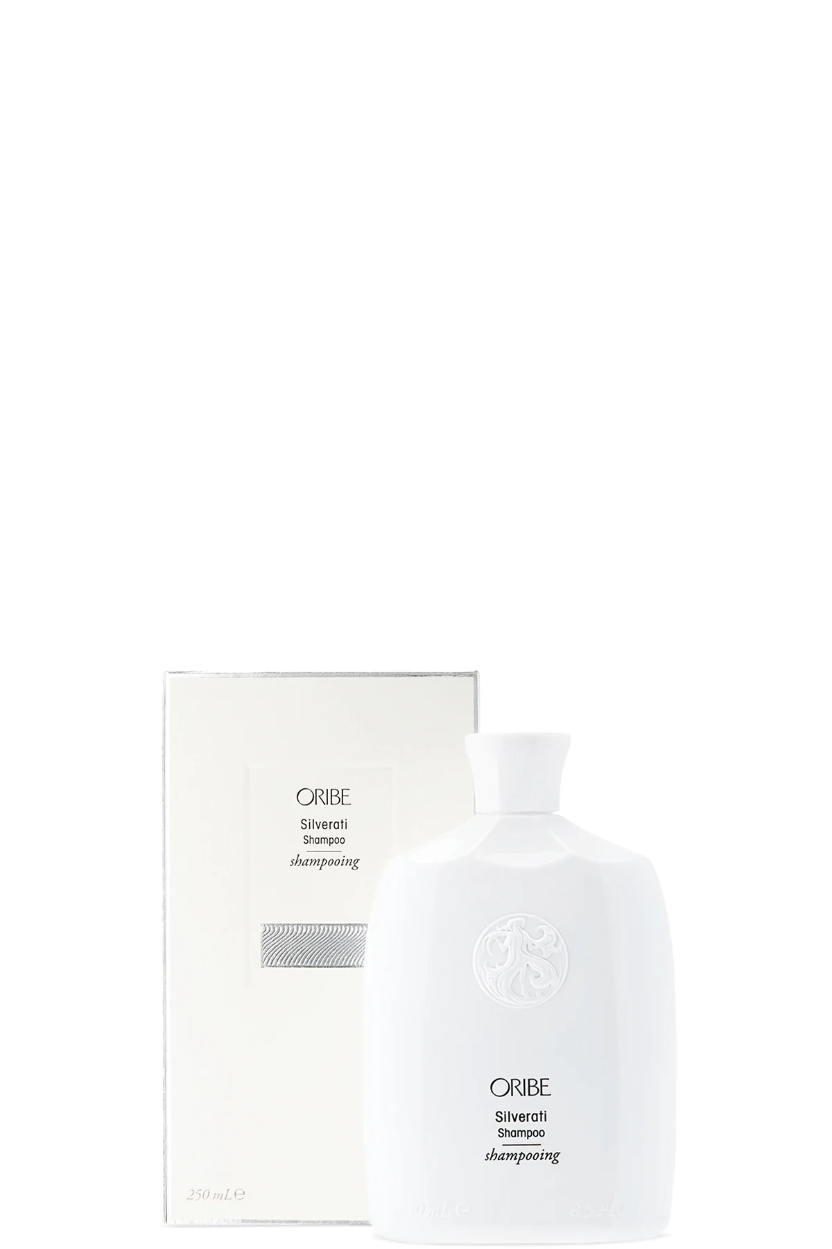 Shampoo for cleansing, toning, and strengthening grey, silver, and white hair. Features blue and silver pigments, European silver fir extract, and Oribe Signature Complex. Suitable for colored and keratin-treated hair. Free of sulfates, parabens, and gluten. Dermatologist-tested. Vegan and cruelty-free.