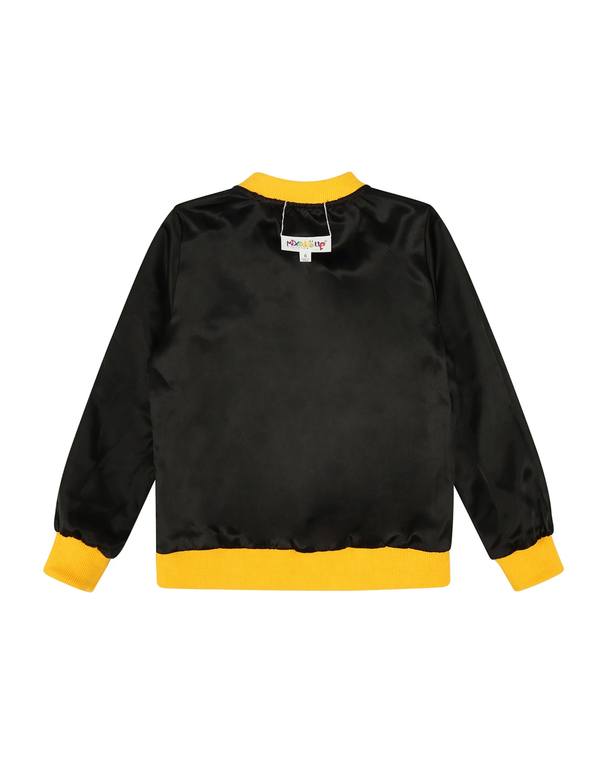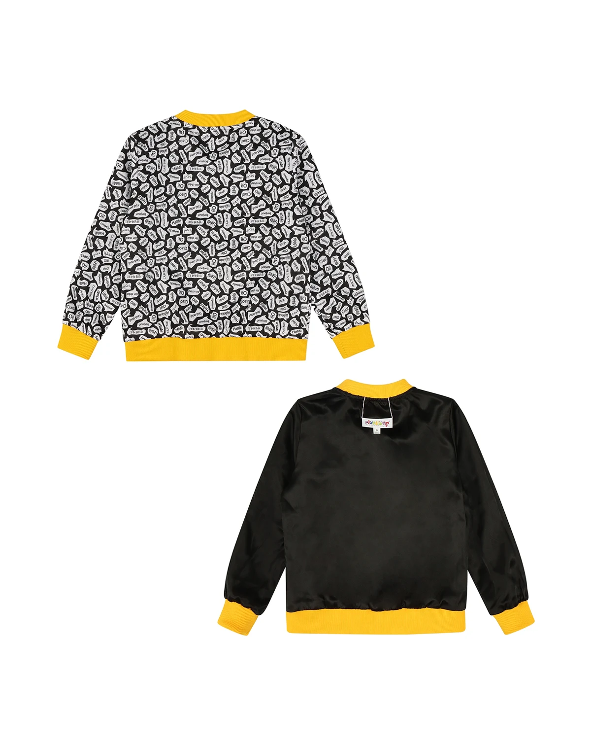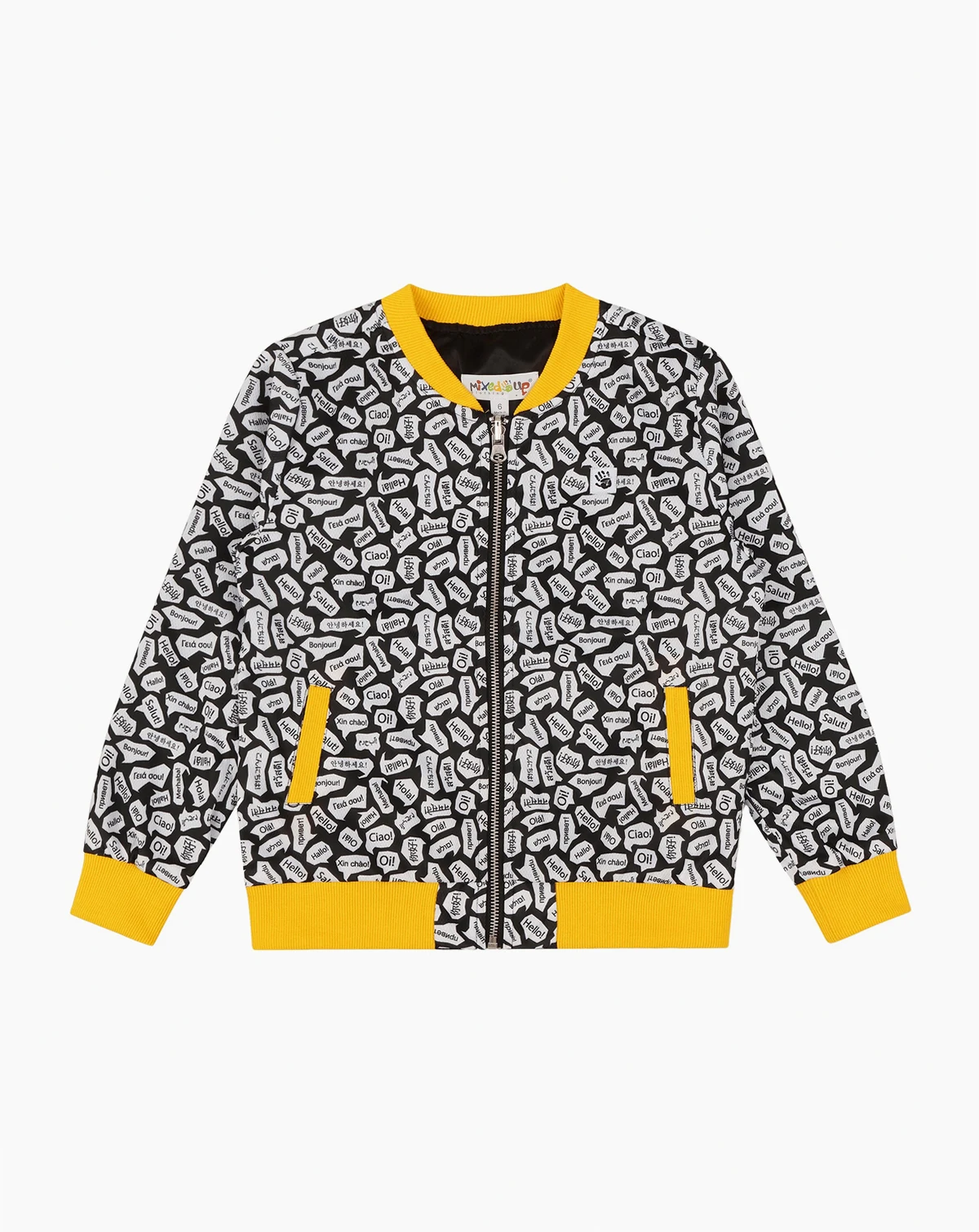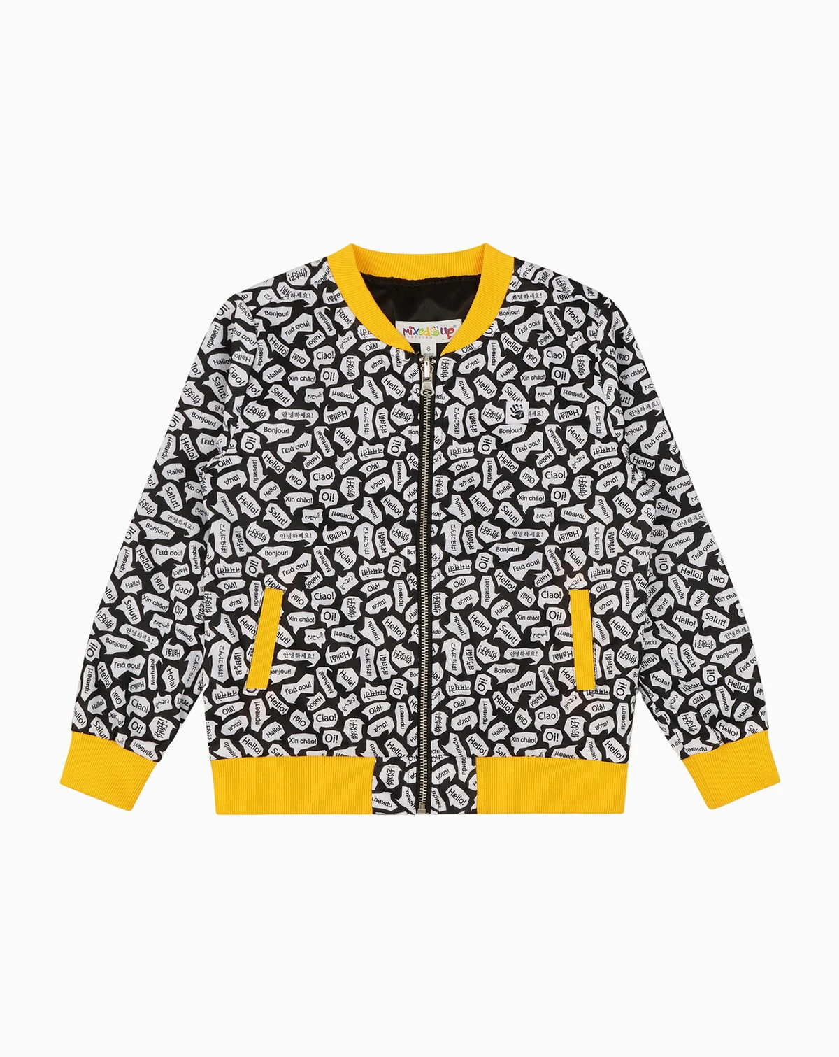 Introducing our "Twice as Nice" Reversible Lightweight Jacket, a versatile addition to your child's clothing collection. Featuring a comfy, soft fabric with a shiny finish, this jacket dazzles with its fun multilingual hello print. It flips to reveal a stunning contrast fabric, doubling the style options. Complete with handy pockets, it's the perfect blend of function and fun for fashion-forward kids.