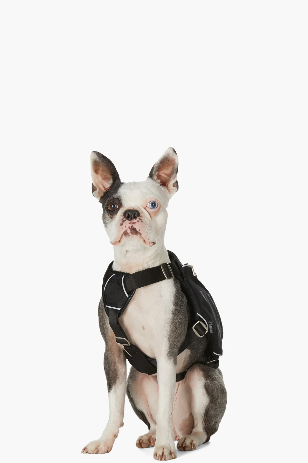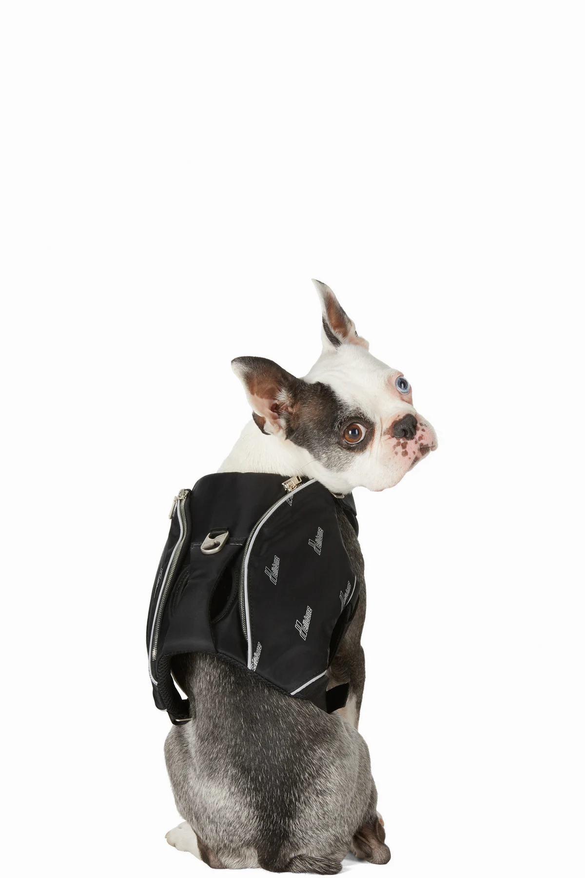 Sleeveless nylon satin and mesh harness in black. Logo printed in white and reflective trim in silver-tone throughout. Tonal rubberized logo patch and adjustable cinch straps at chest. Adjustable cinch straps at waist and hem. Logo-engraved hoop hardware and carry handle at back. Zippered pocket at sides. Logo-engraved silver-tone hardware.