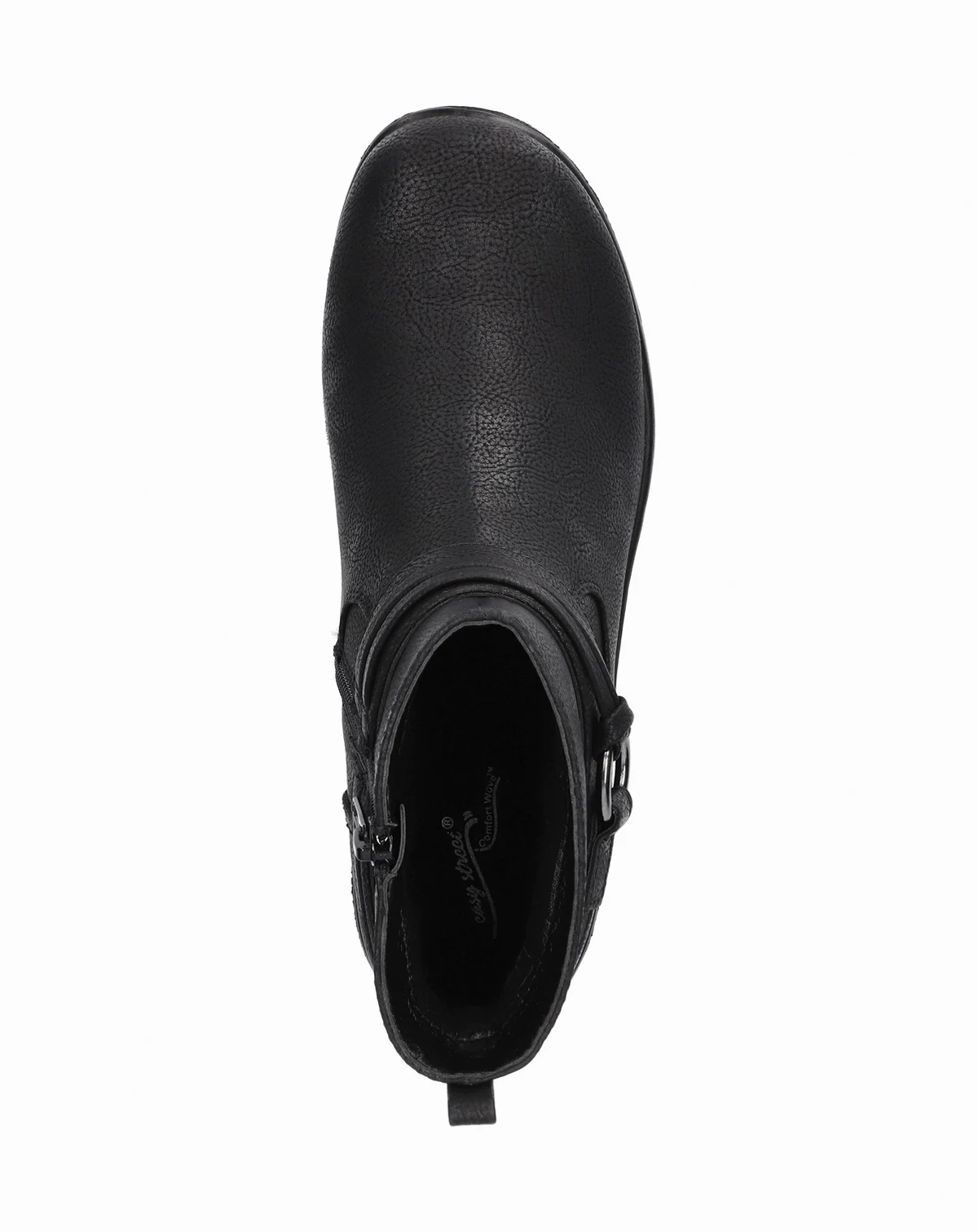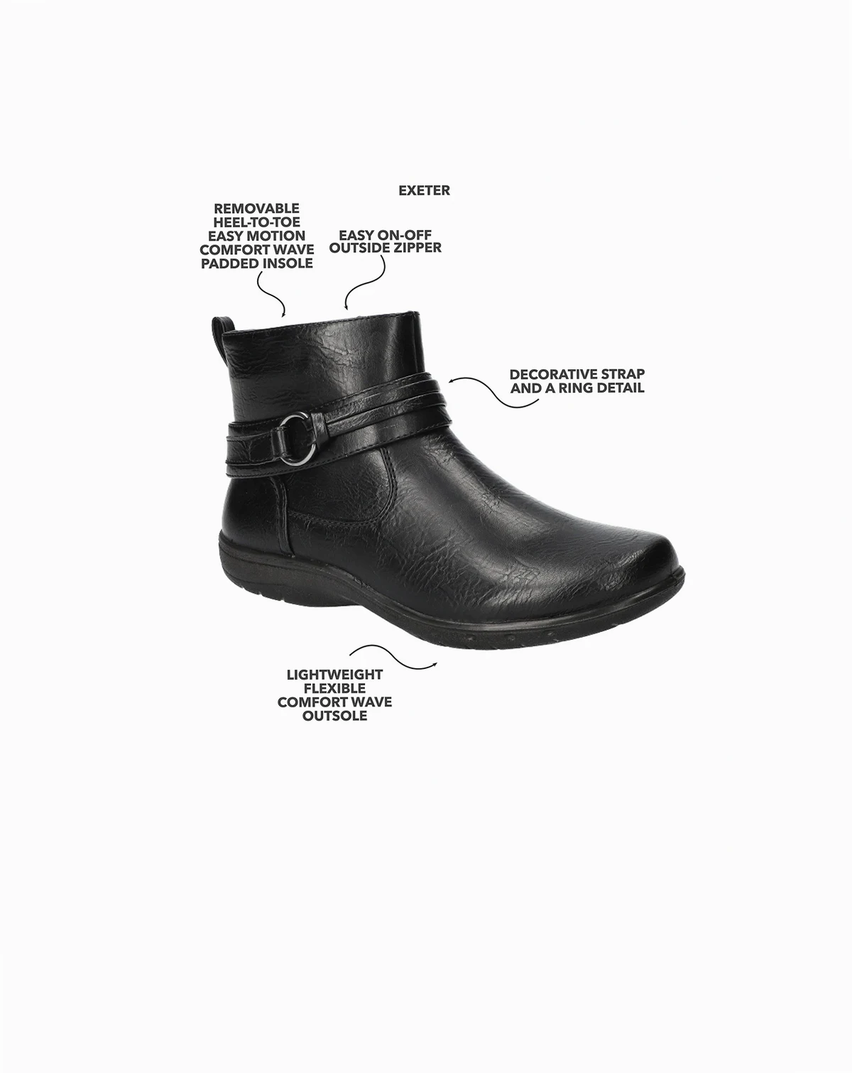 Step into the Exeter ankle boot by Easy Street, your ultimate everyday companion. A mix of casual comfort and versatility, this bootie features a decorative strap and a ring detail. It is designed on a Comfort Wave unit outsole that is both lightweight and flexible. The Easy Motion by Easy Street removable insole provides all-day comfort. An inside zipper allows for easy on/off.