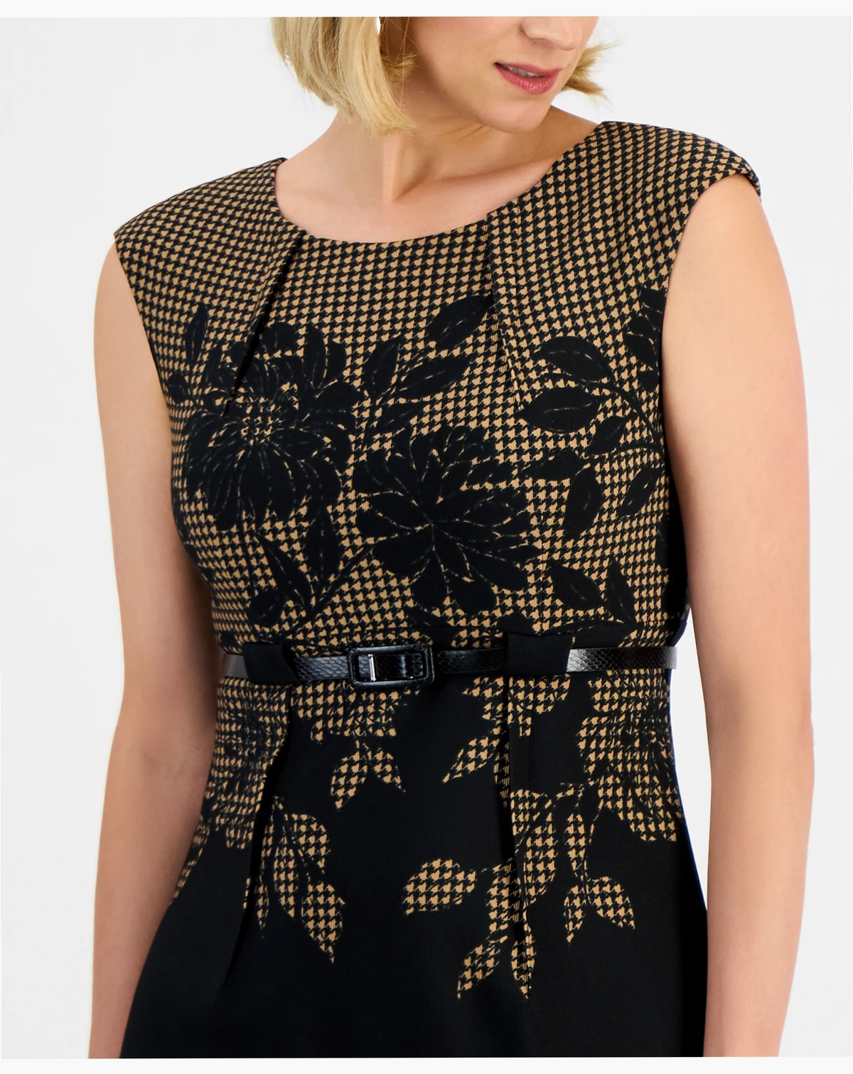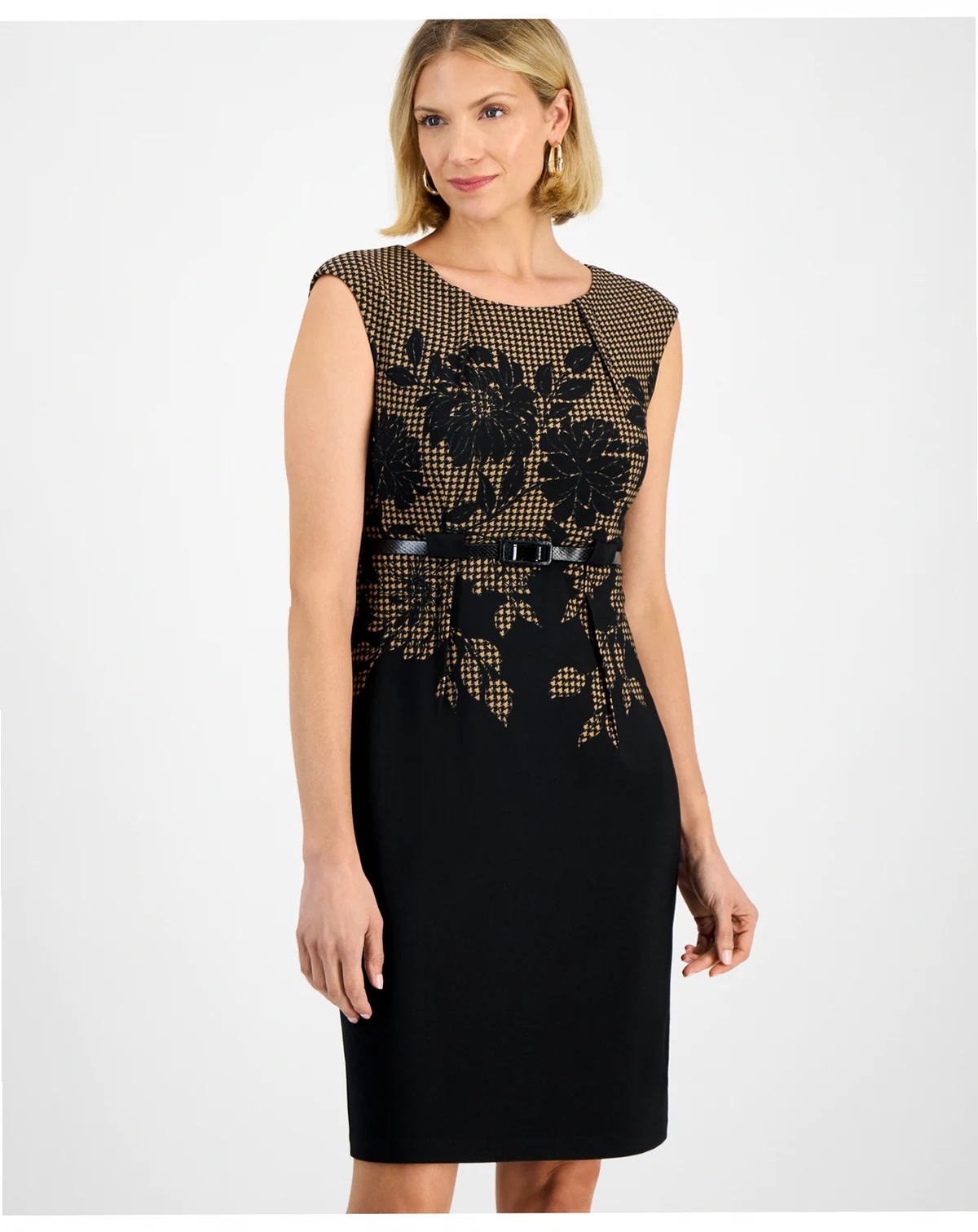Adorn yourself in elegance with this women's belted dress from Connected, featuring stunning floral cutouts that add a touch of romantic charm to your look.