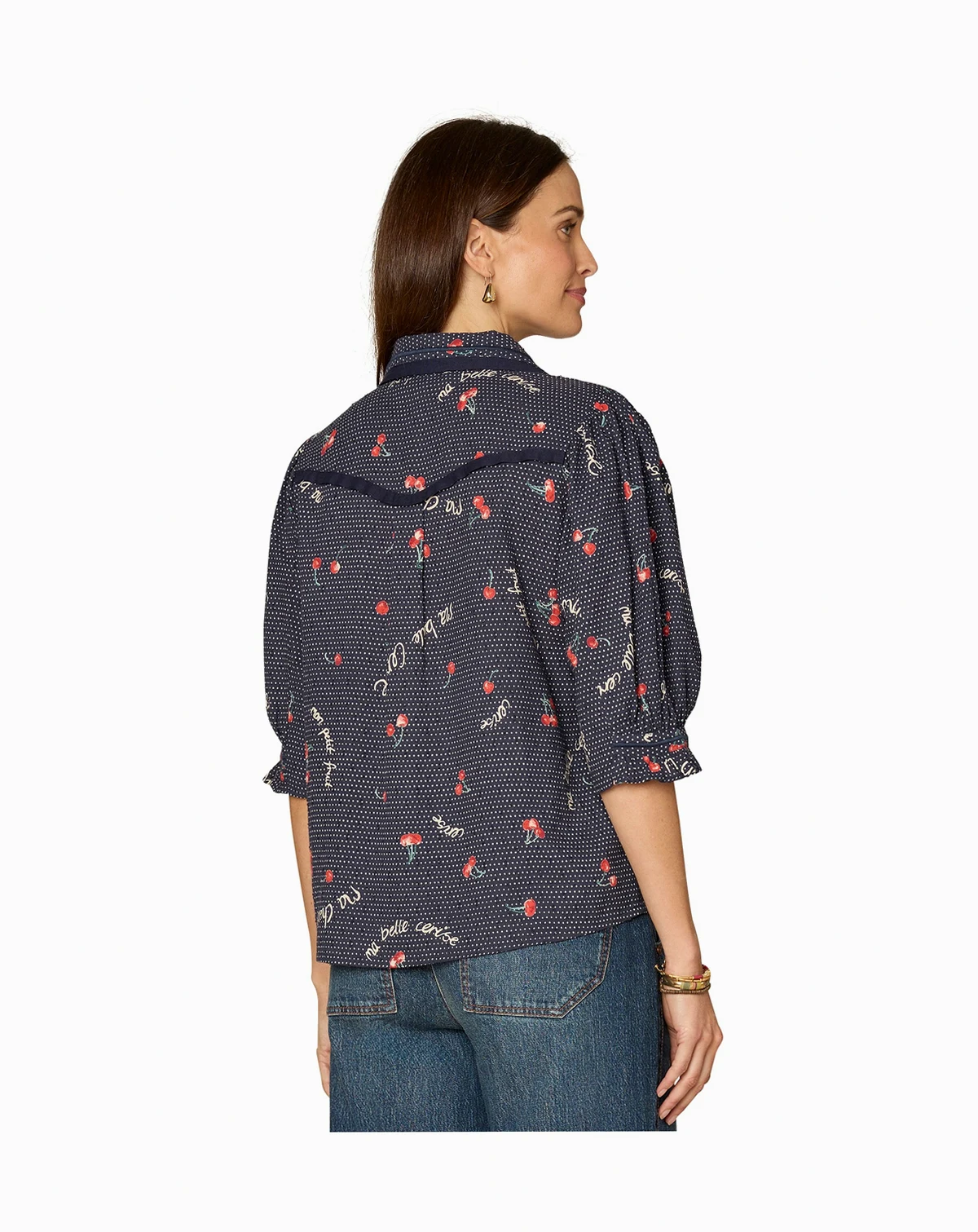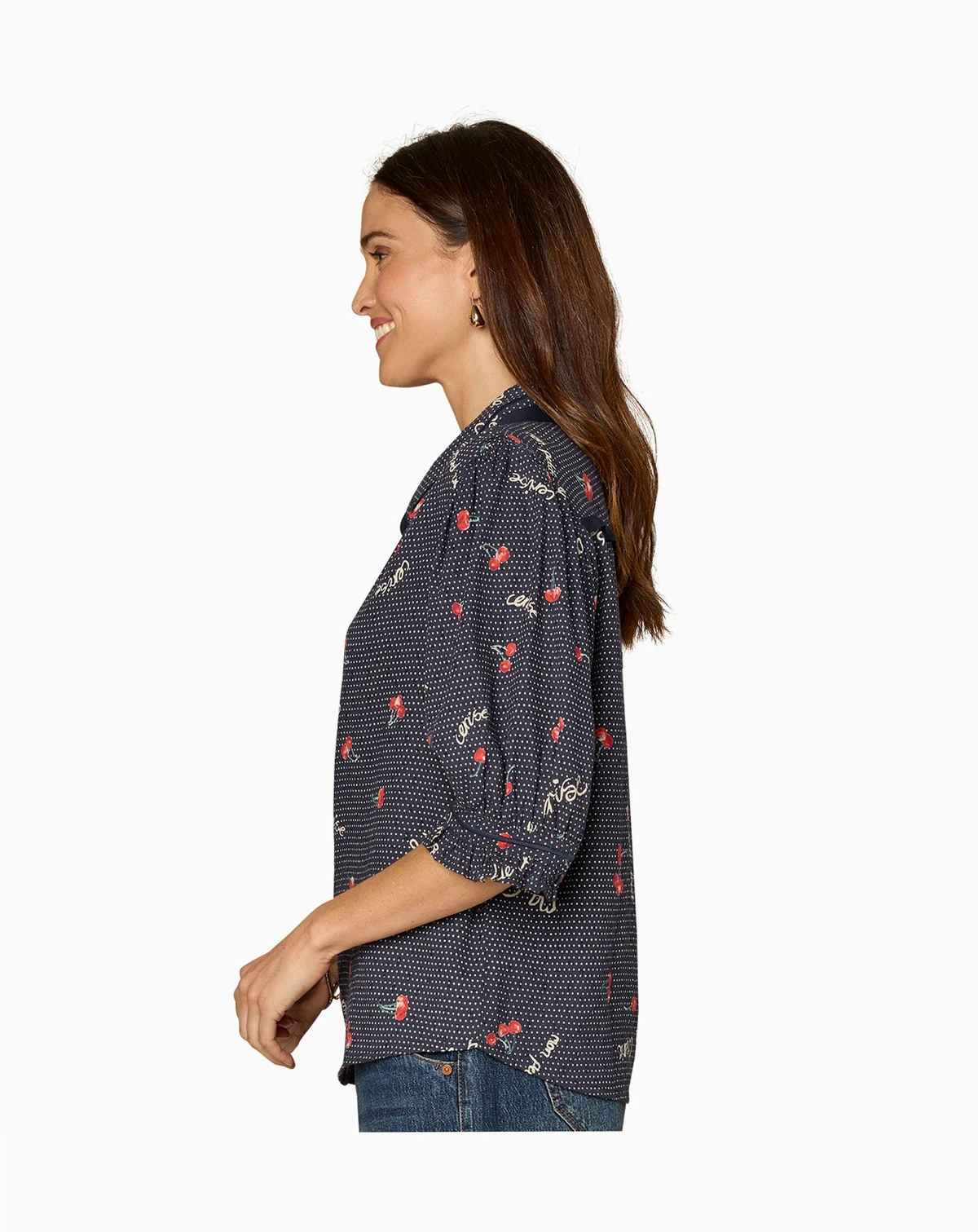 Detailed with novelty piping, this printed Democracy top features a below-elbow cinched band sleeve and a button-down front. The relaxed fit and collared neckline offers a polished casual look.