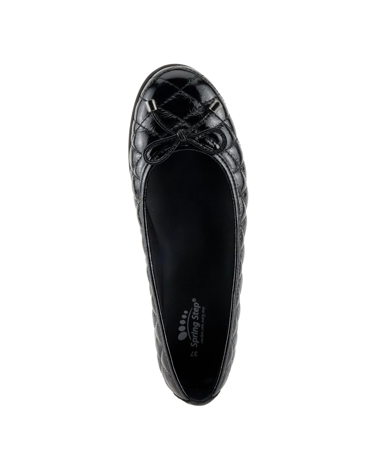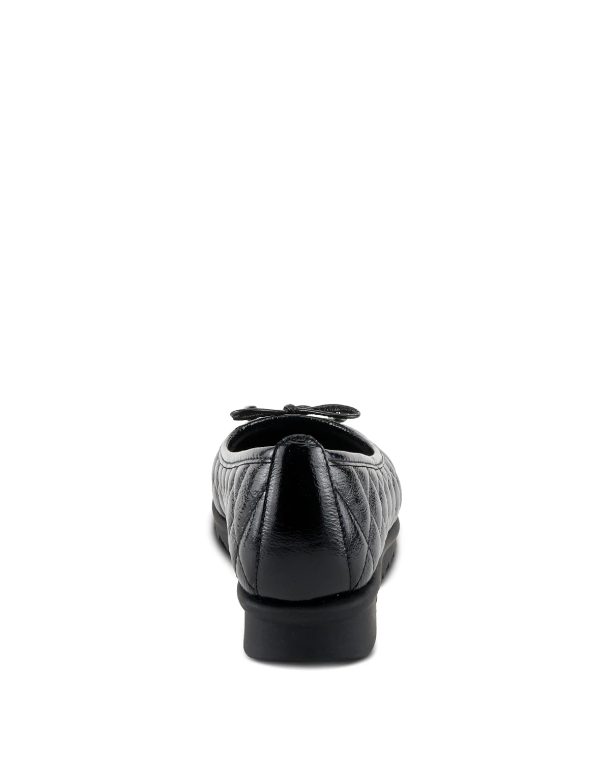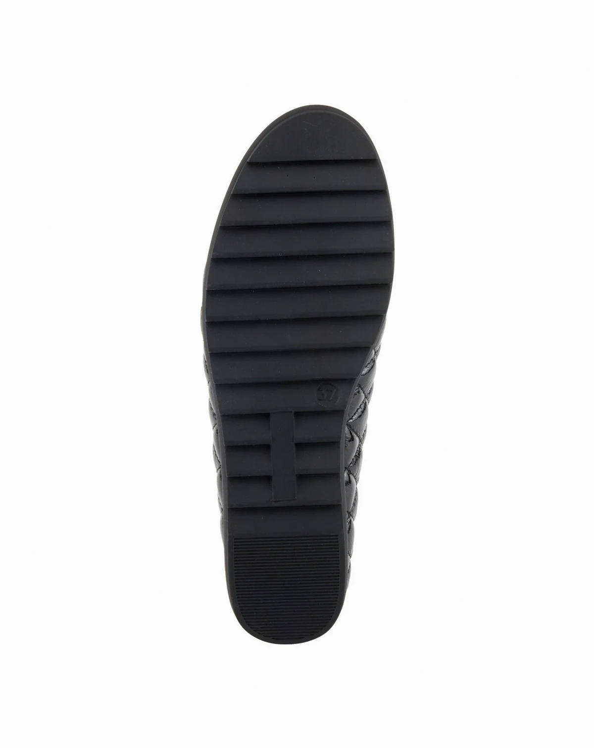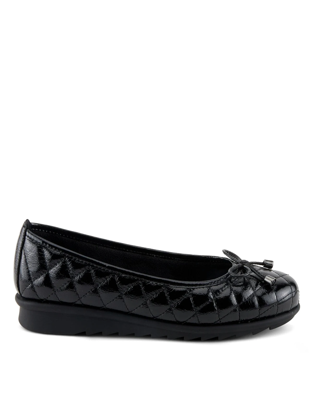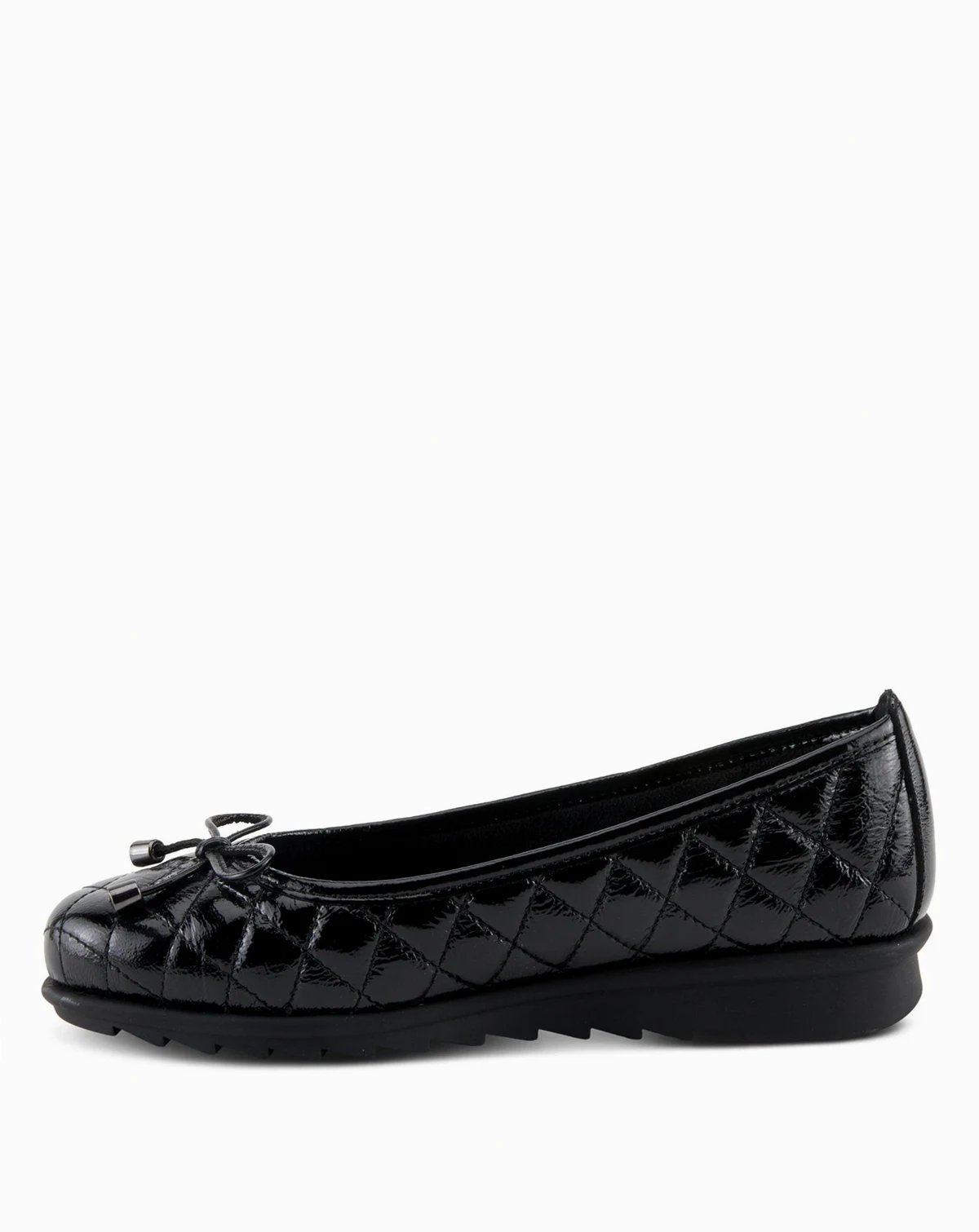 A refined twist on the classic ballet flat, this elegant style features a quilted leather upper, feminine bow accent, and a supportive saw-edged wedge. With a soft microsuede lining and removable cushioned insole, it's designed for comfort that doesn't compromise on charm.