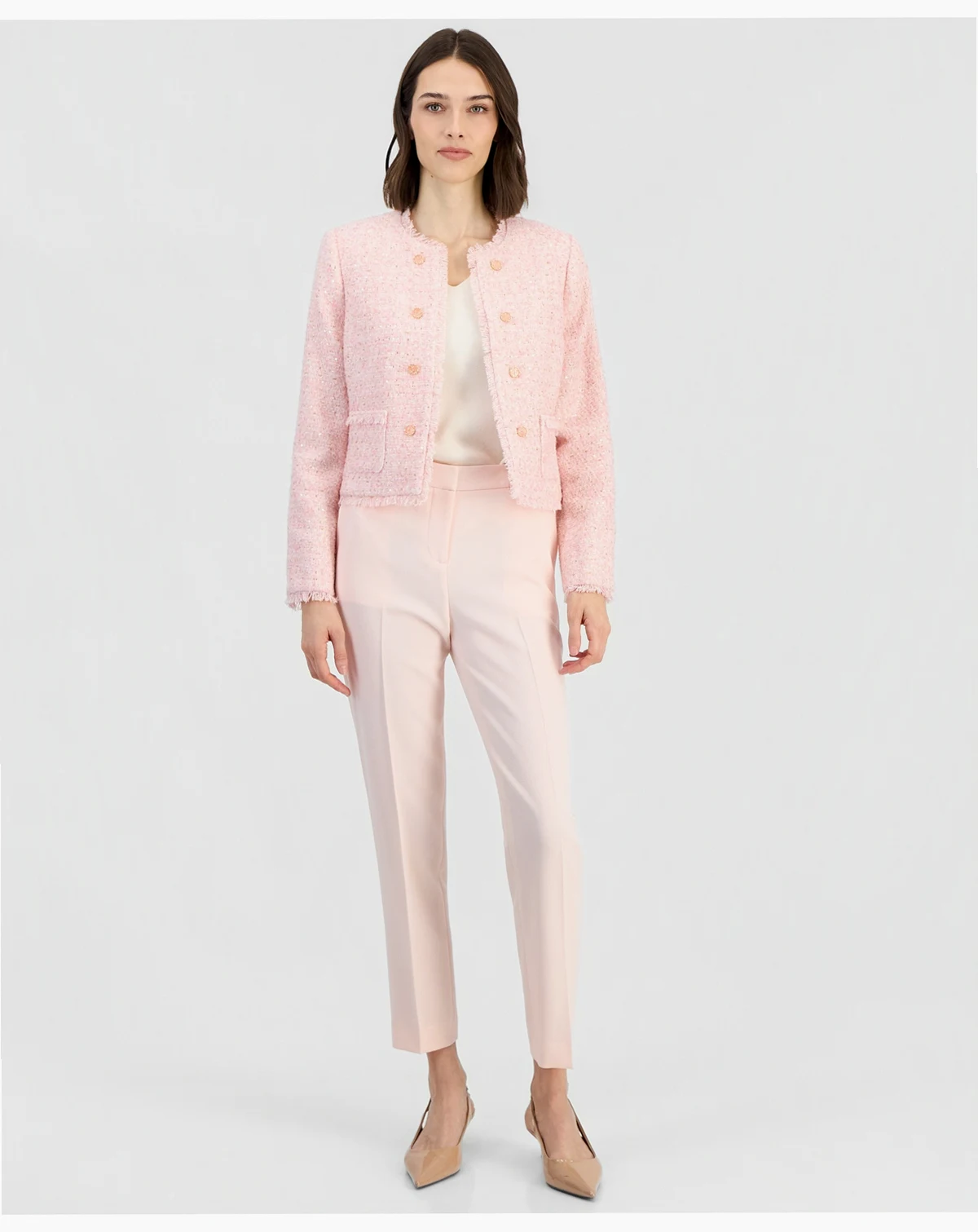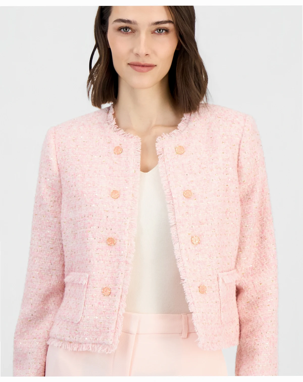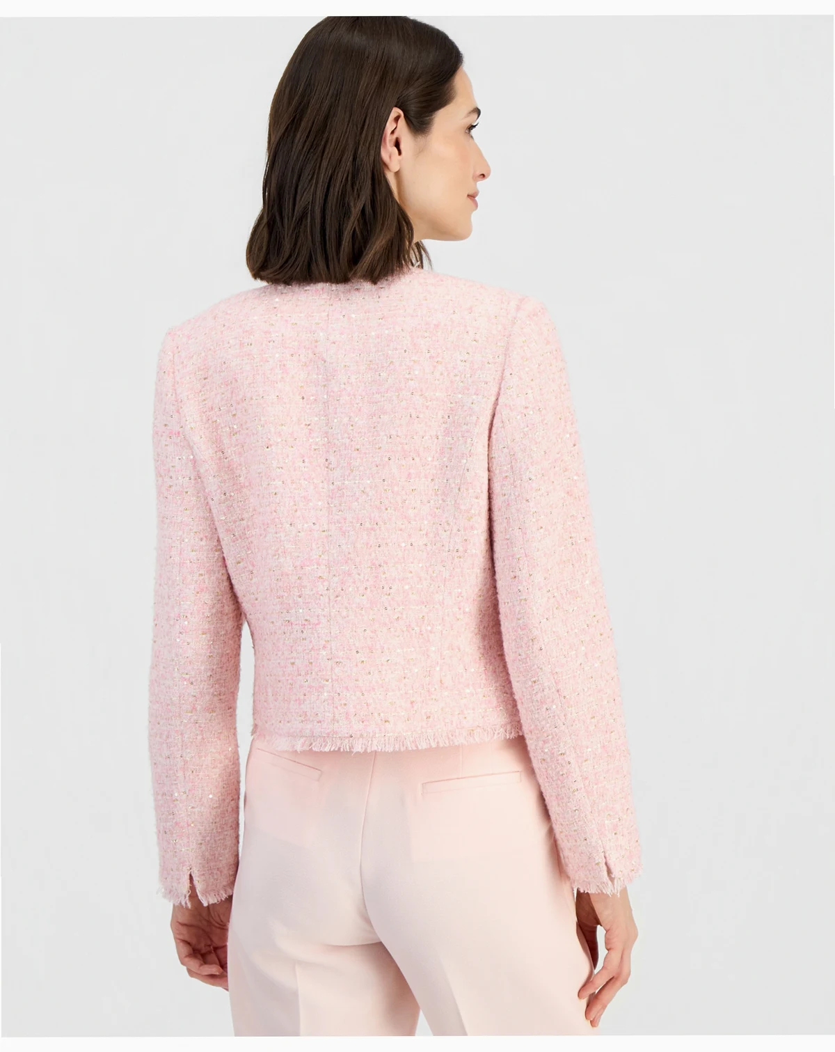 Bring stylish depth and fresh color to your collection with this Tahari ASL jacket. The cropped silhouette features allover texture and delicate fringed trim.