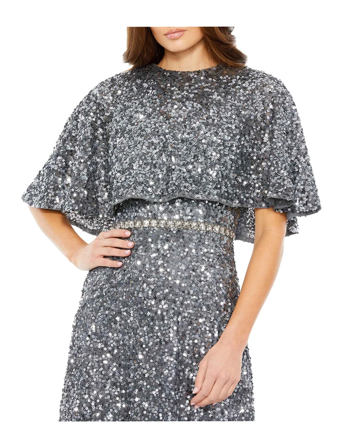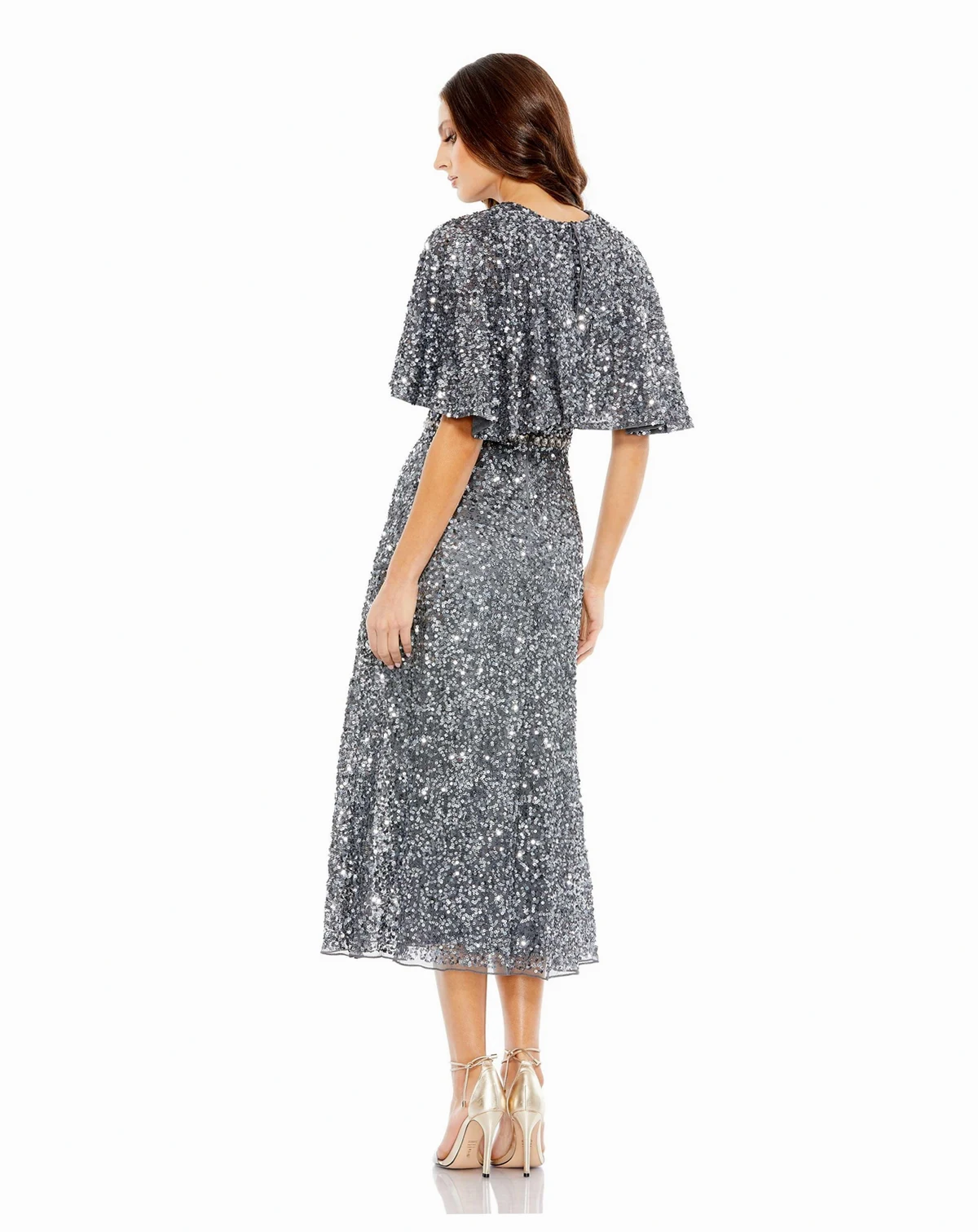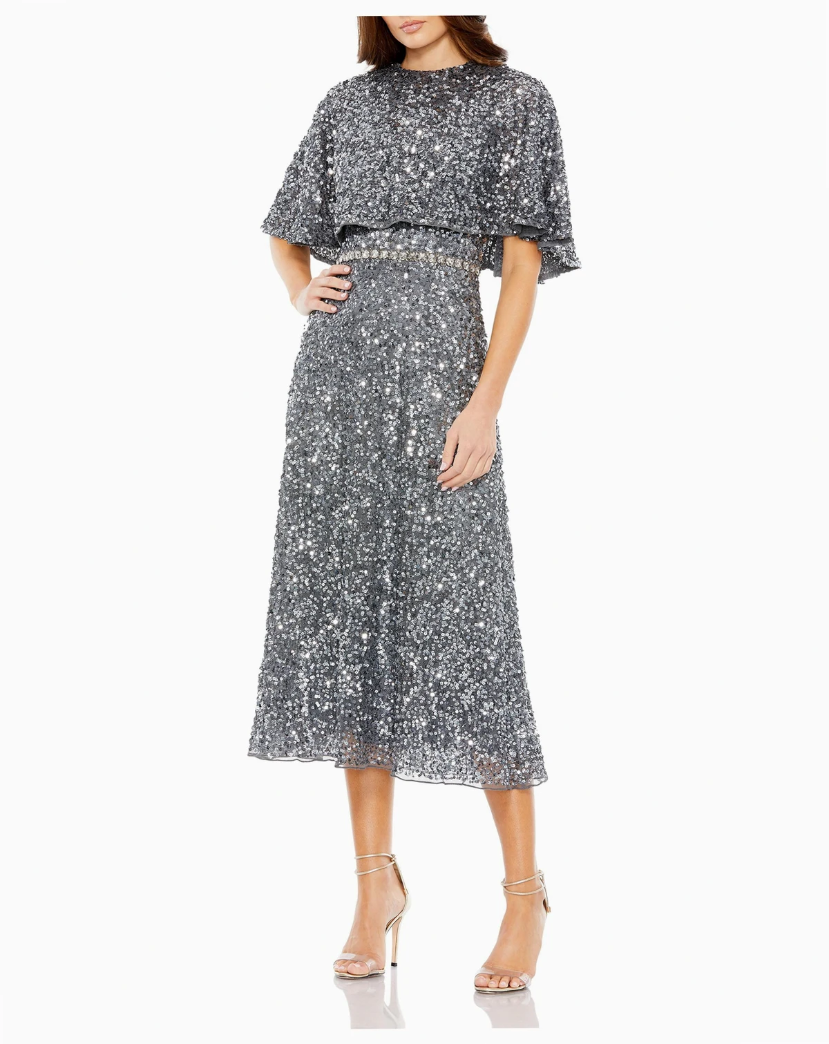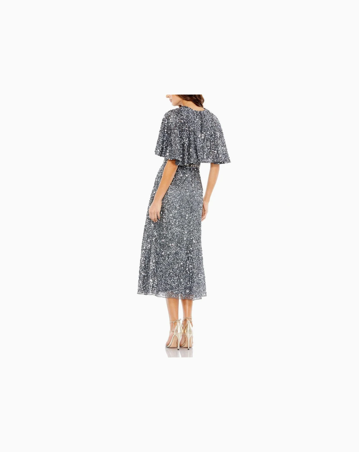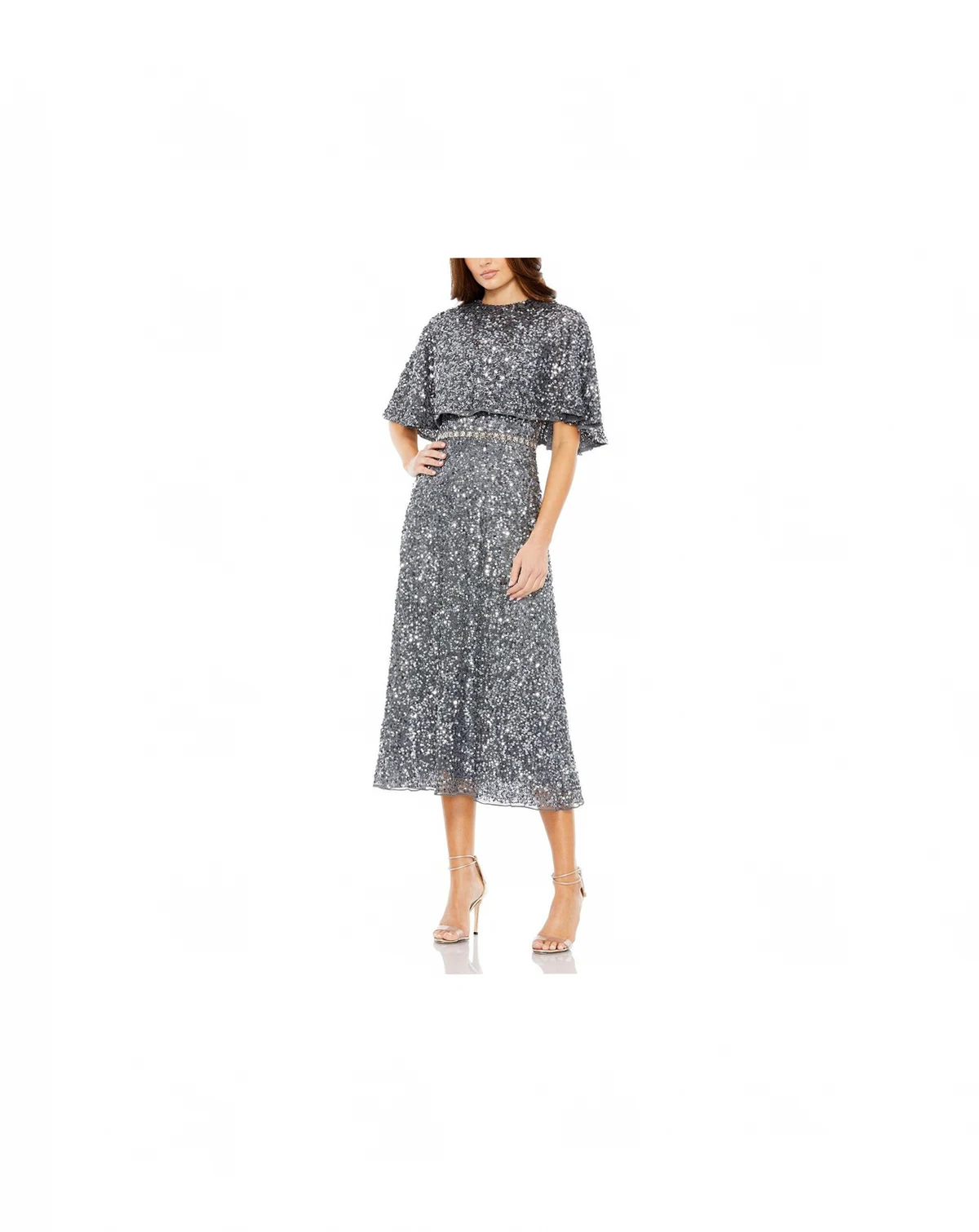 Shine in this allover sequin midi dress featuring a relaxed cape overlay, fitted waist, and flowing A-line skirt. Perfect for cocktail parties, weddings, galas, and evening events, this sparkling silhouette delivers timeless glamour and sophistication.