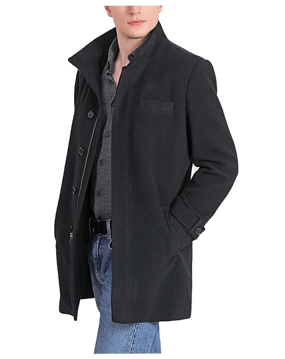 Versatile enough to wear to work, and casual enough to wear on your day off with a pair of jeans, this stand collar wool car coat with zip front with hidden button closure can be worn buttoned up or open.