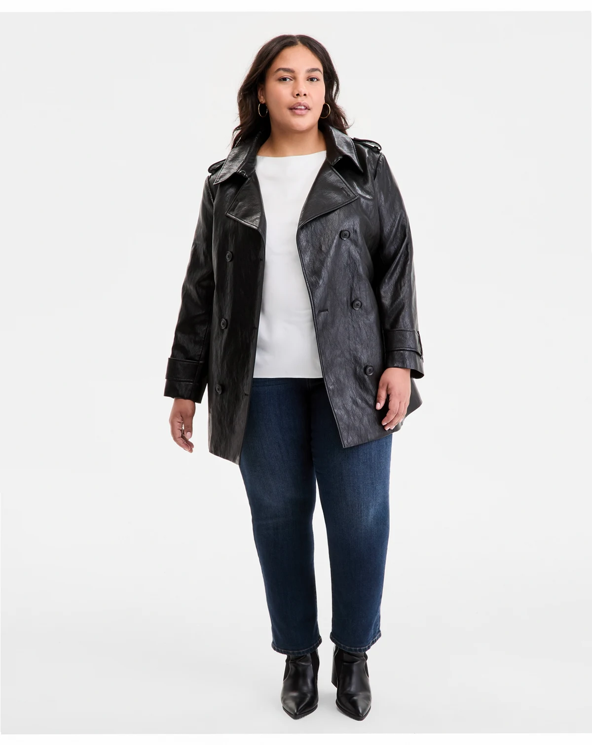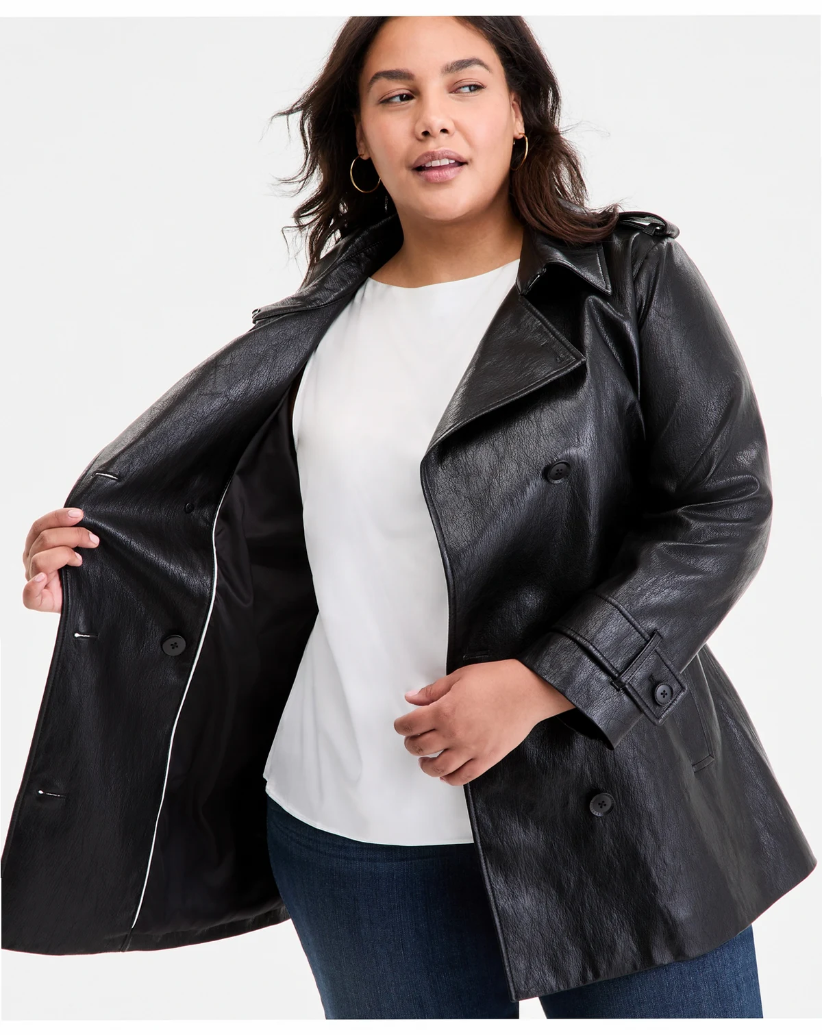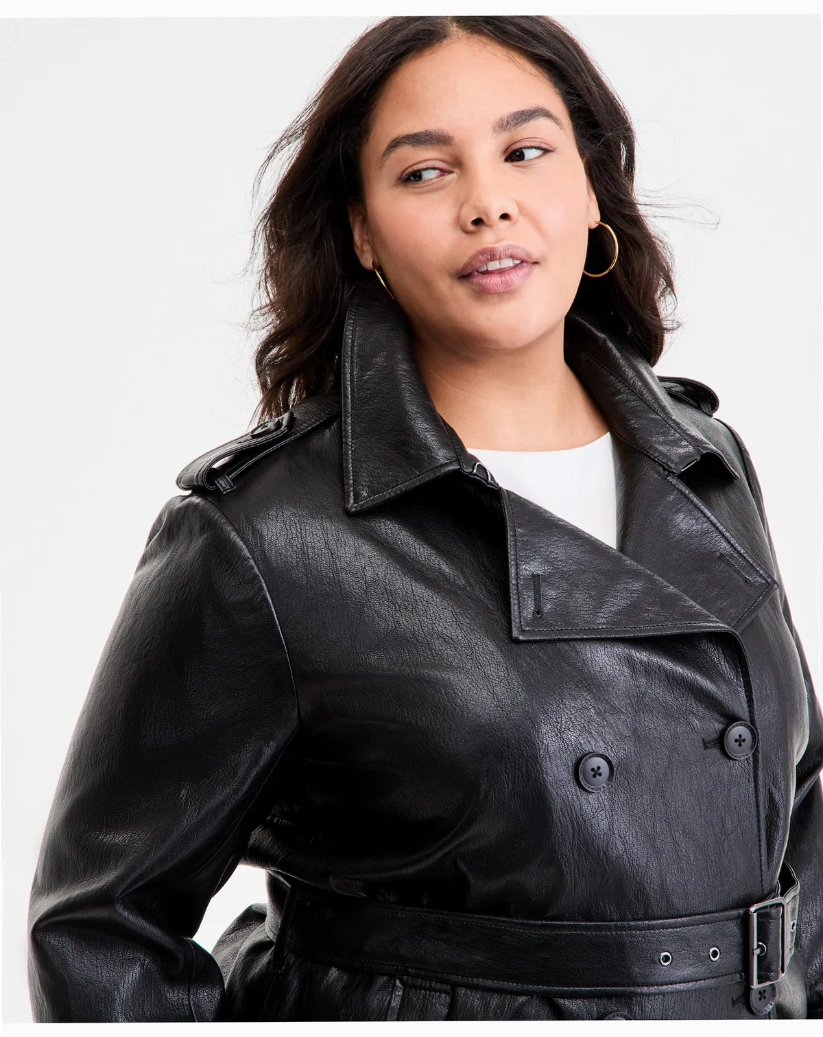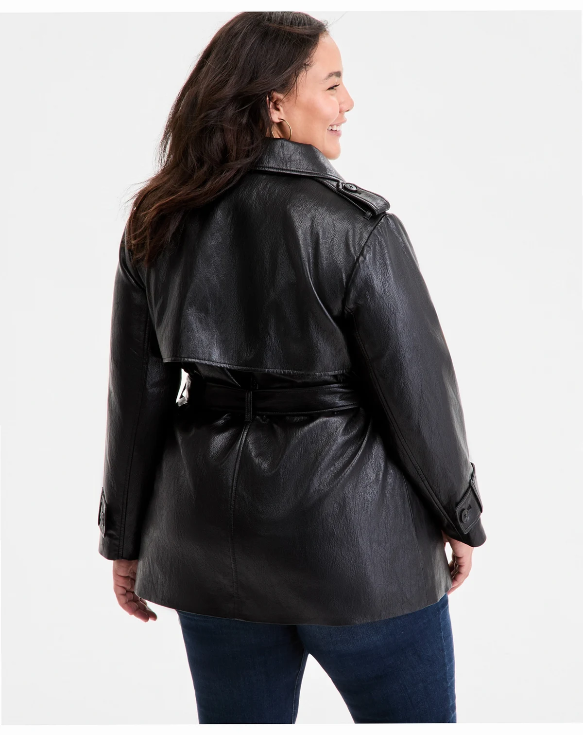 Face: 100% polyurethane; back: 97% rayon, 3% other; lining: 100% polyester; Matte black logo buttons; epaulets; faux-leather finish; matching belt; back storm flap