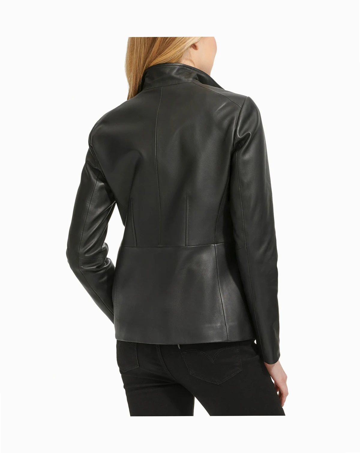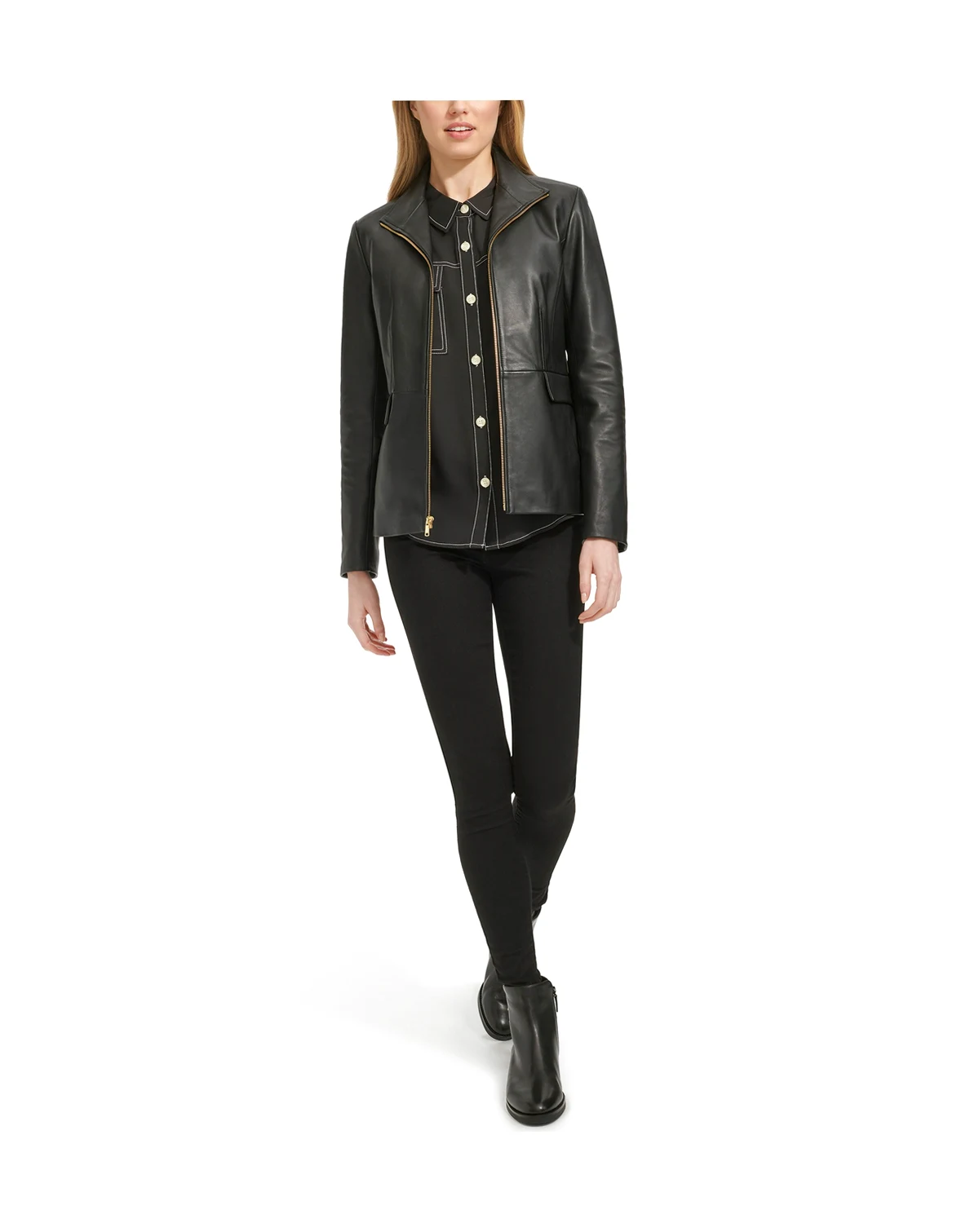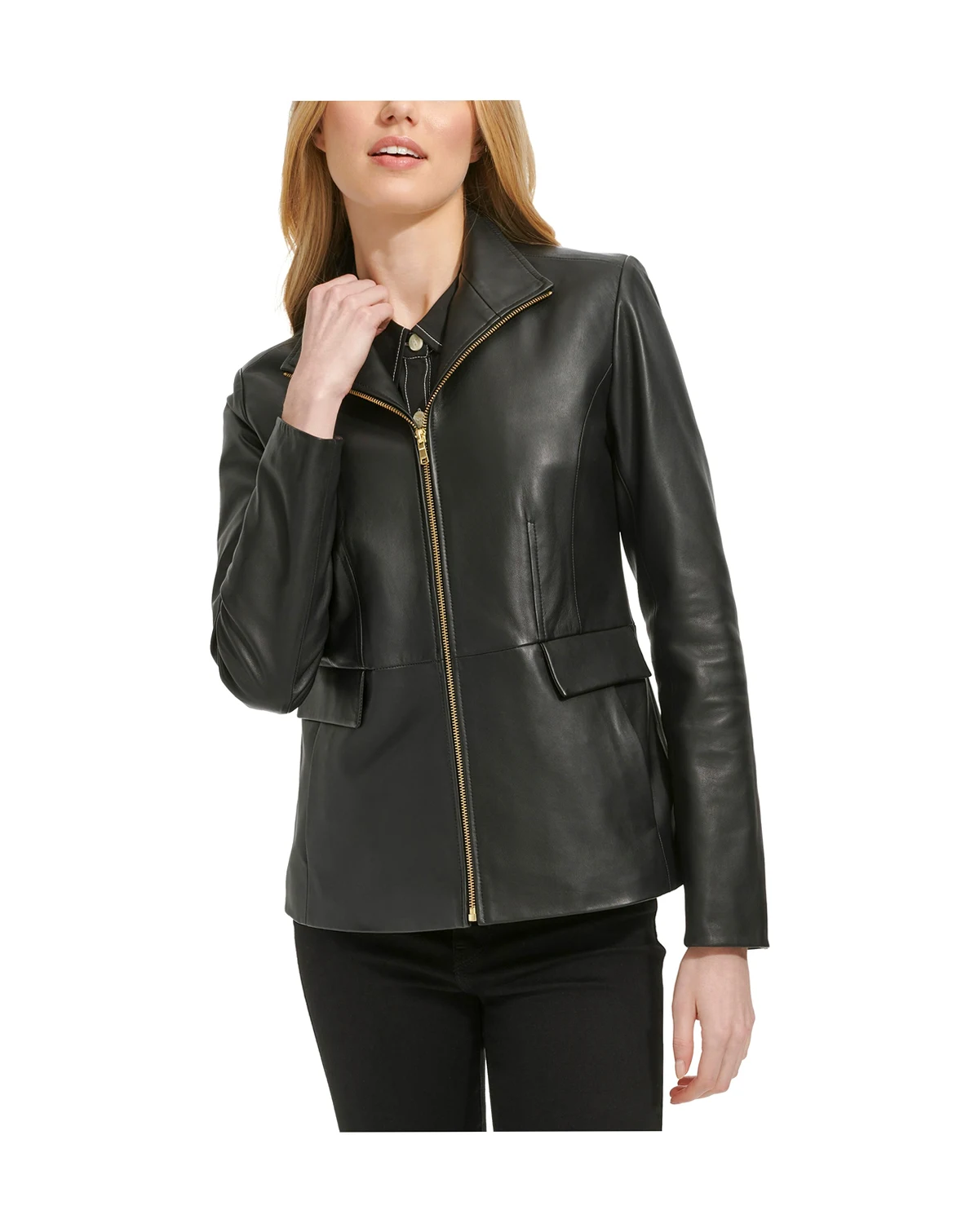 Refined and versatile, this Cole Haan leather jacket features a sleek zip-front design and a softly structured wing collar. Fully lined for added comfort, the smooth layer offers a polished finish that's easy to style.