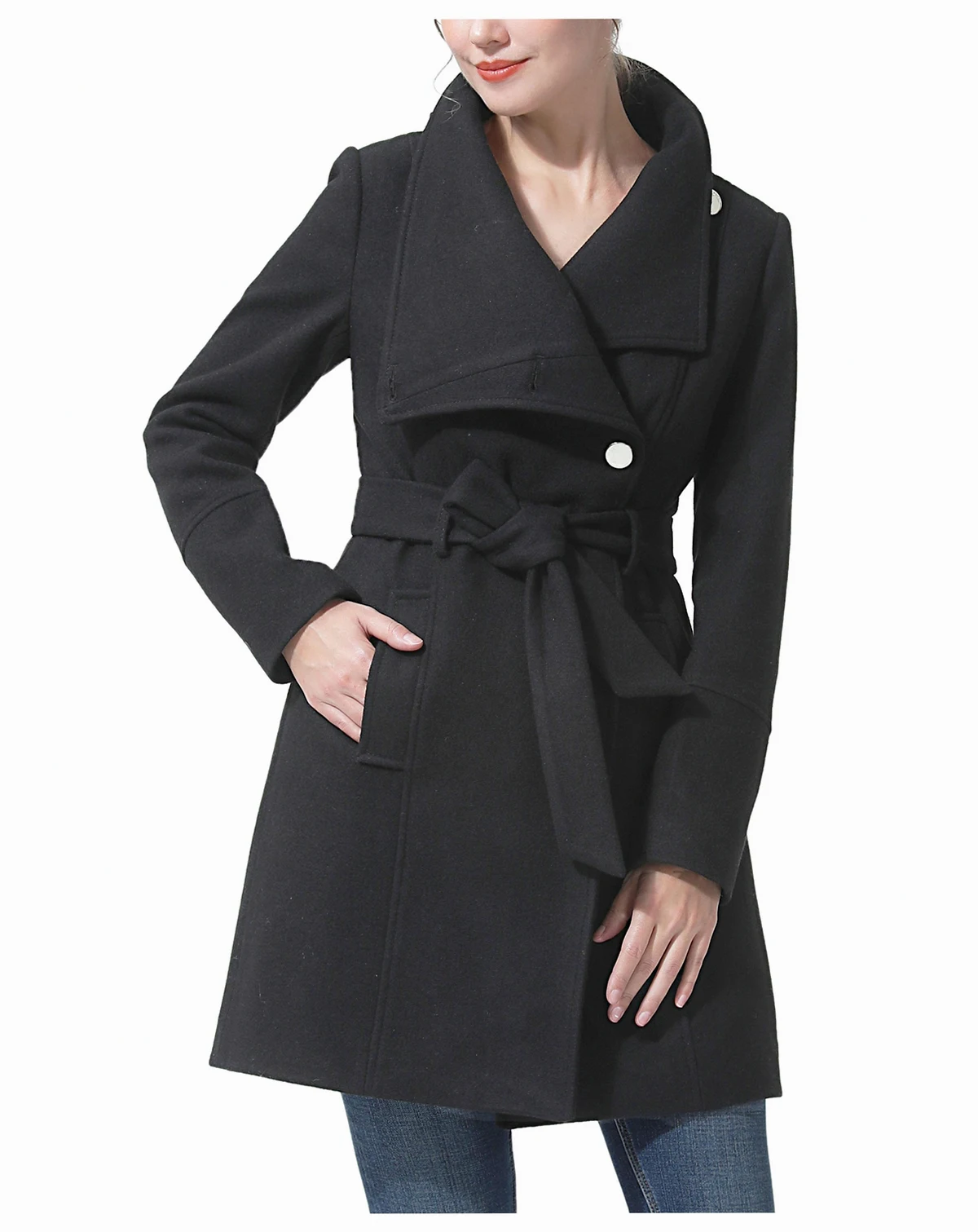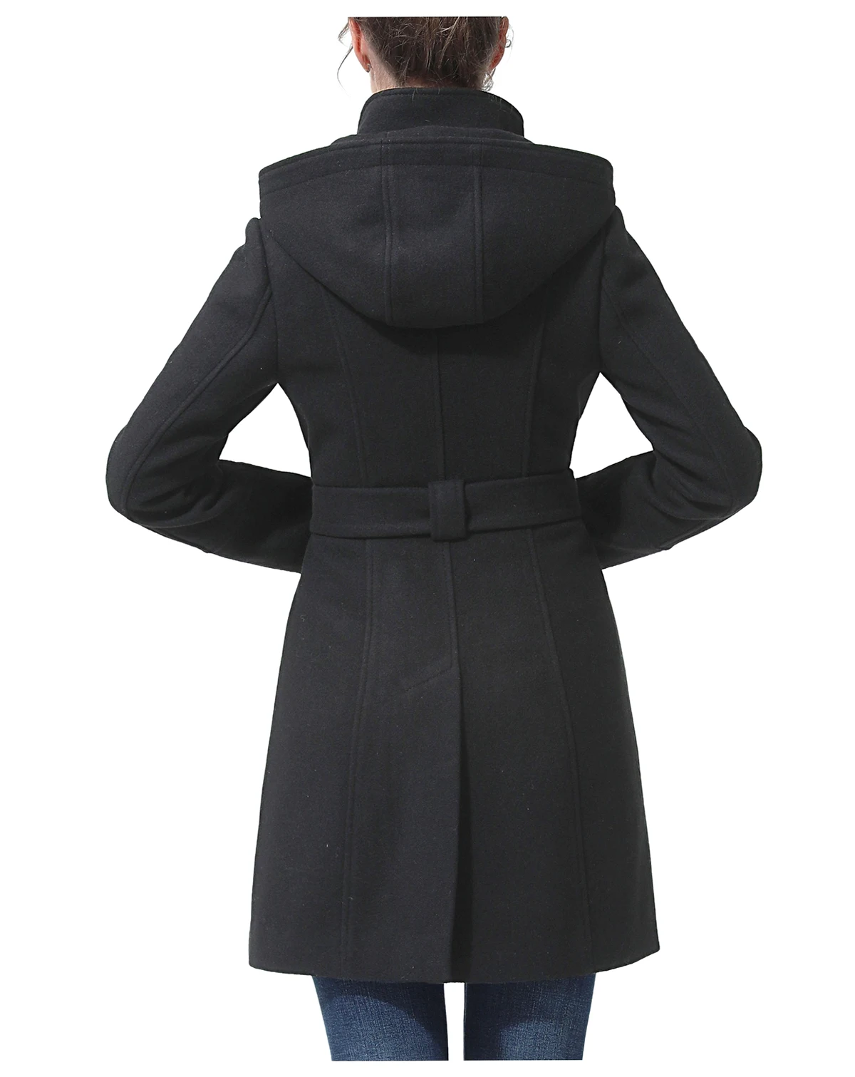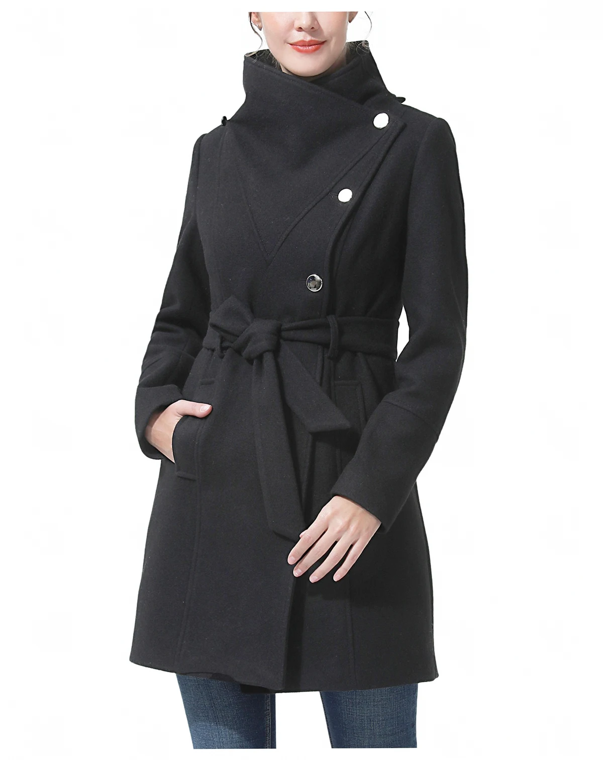 This knee-length wool trench coat combines timeless elegance with modern design, highlighted by an asymmetrical front that adds a touch of high style. A detachable hood, fold-over collar, and shapely seam detailing enhance its versatility and refined silhouette.
