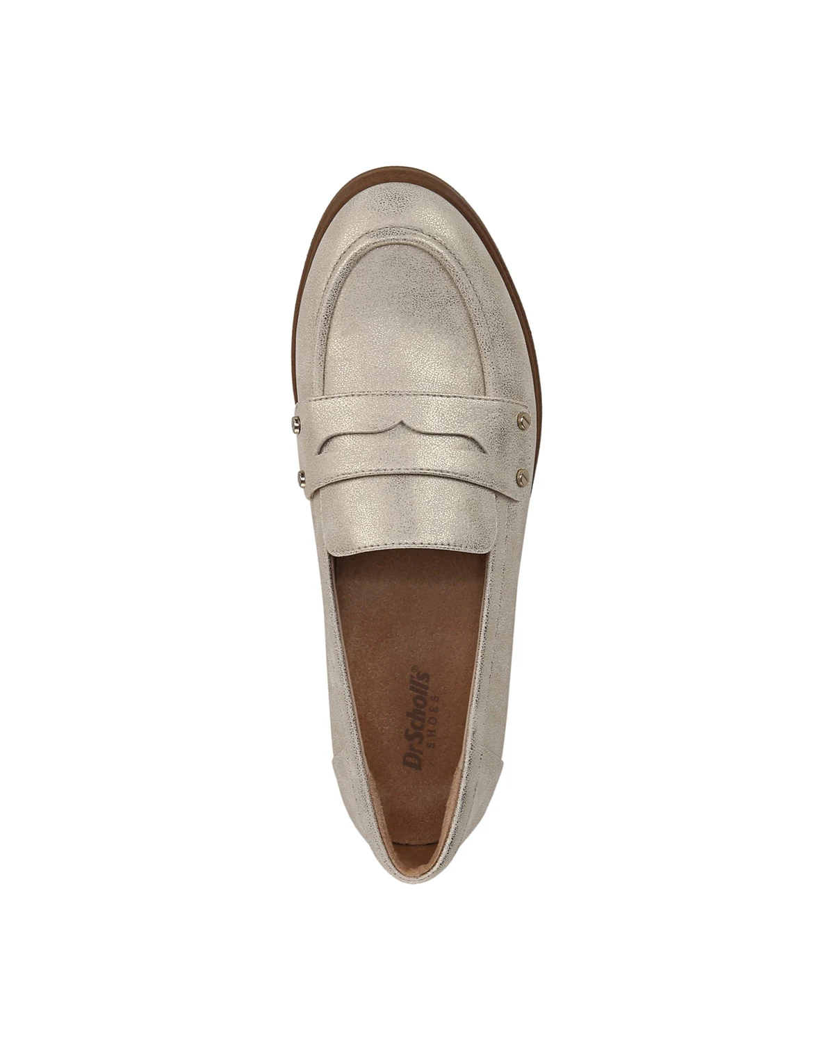 Meet your newest go-to women's loafers, infused with innovative comfort. CRAFTED: Fabric linings and topcloth; toe box and heel counter. MATERIALS: Low chemical faux leather or fabric upper and synthetic outsole. FIT: Slip on fit for easy on/off. COMFORT: Anti-odor Insole Technology with cushioning, comfort, and arch support that uses cushy BLOOM® foam insole. MOVEMENT: Lightweight, flexible construction moves with you. STYLE: Women's flat loafers with penny keeper strap, metal stud detailing, and 1-inch stacked block heel. Classically cute loafers that feel like comfort shoes, ready for in and out of office.
