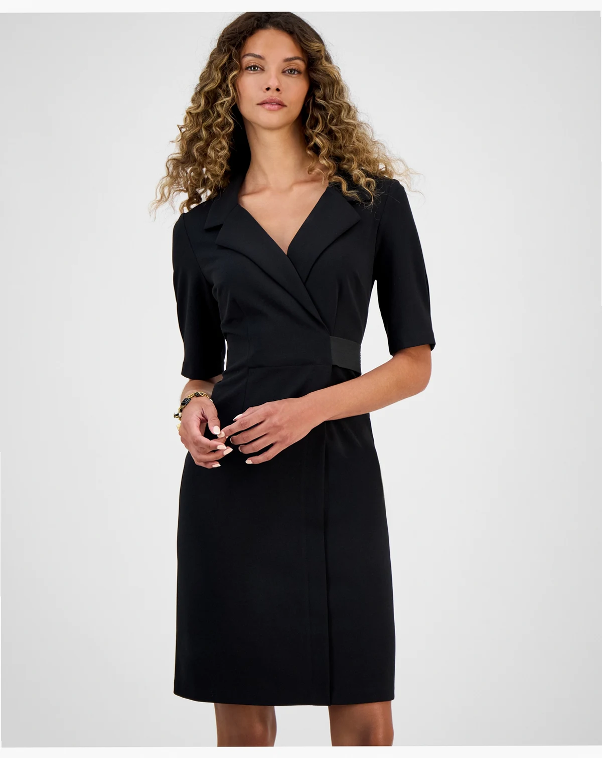 A classic notched collar and flattering faux-wrap styling gives office-approved style to this elbow-length sheath dress from Connected.
