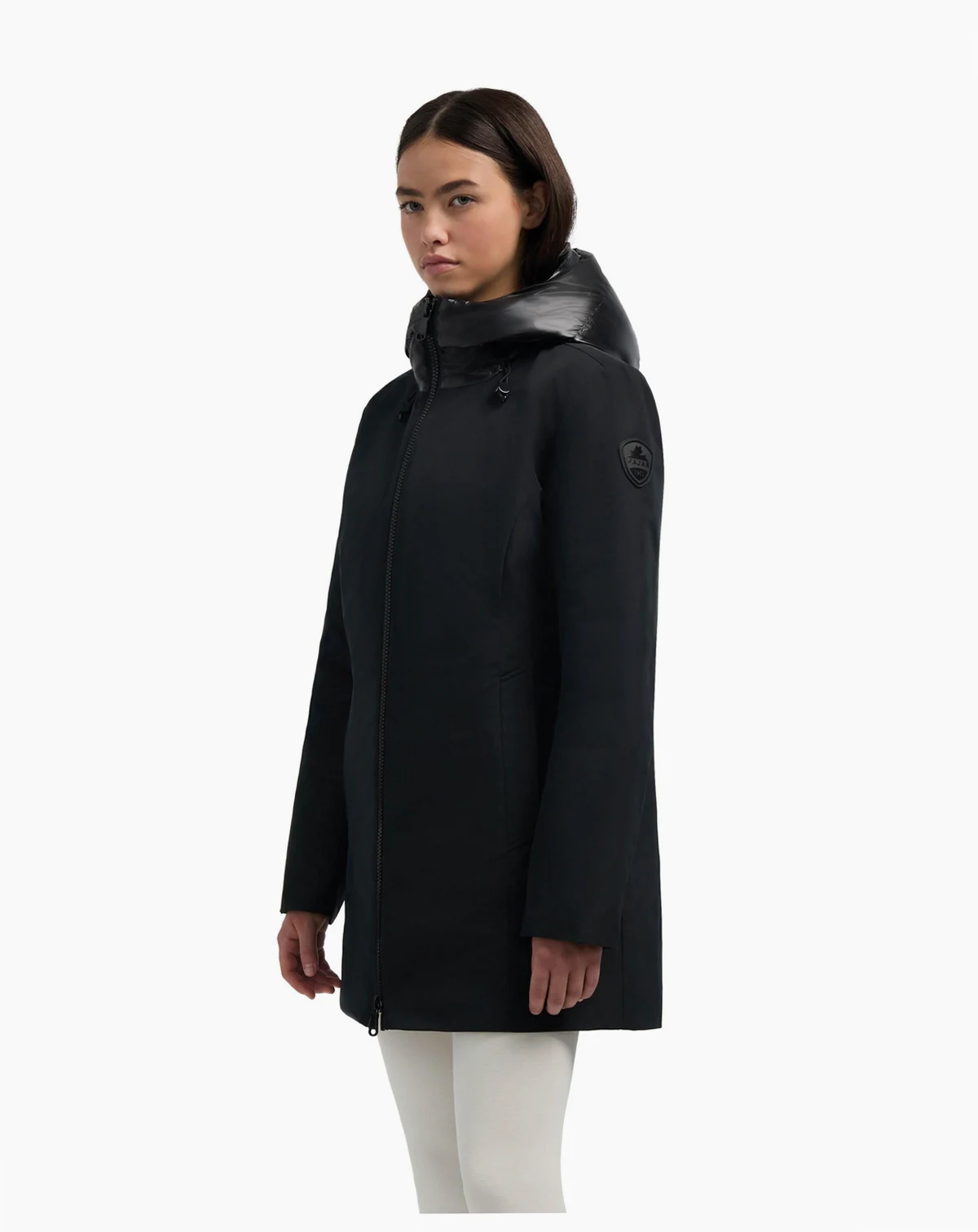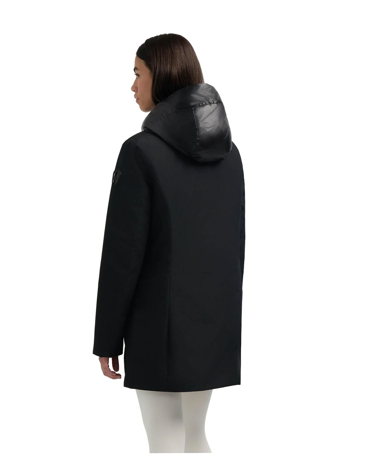 This Pajar 3-in-1 modular car coat features a fixed hood with adjustable bungee cords and an exposed zip front closure. The removable quilted puffer liner provides added insulation, while elastic cuffs and hem seal out wind. Designed with water-repellent fabric and REPREVE padding, this coat offers both style and functionality for weather down to -10°C.