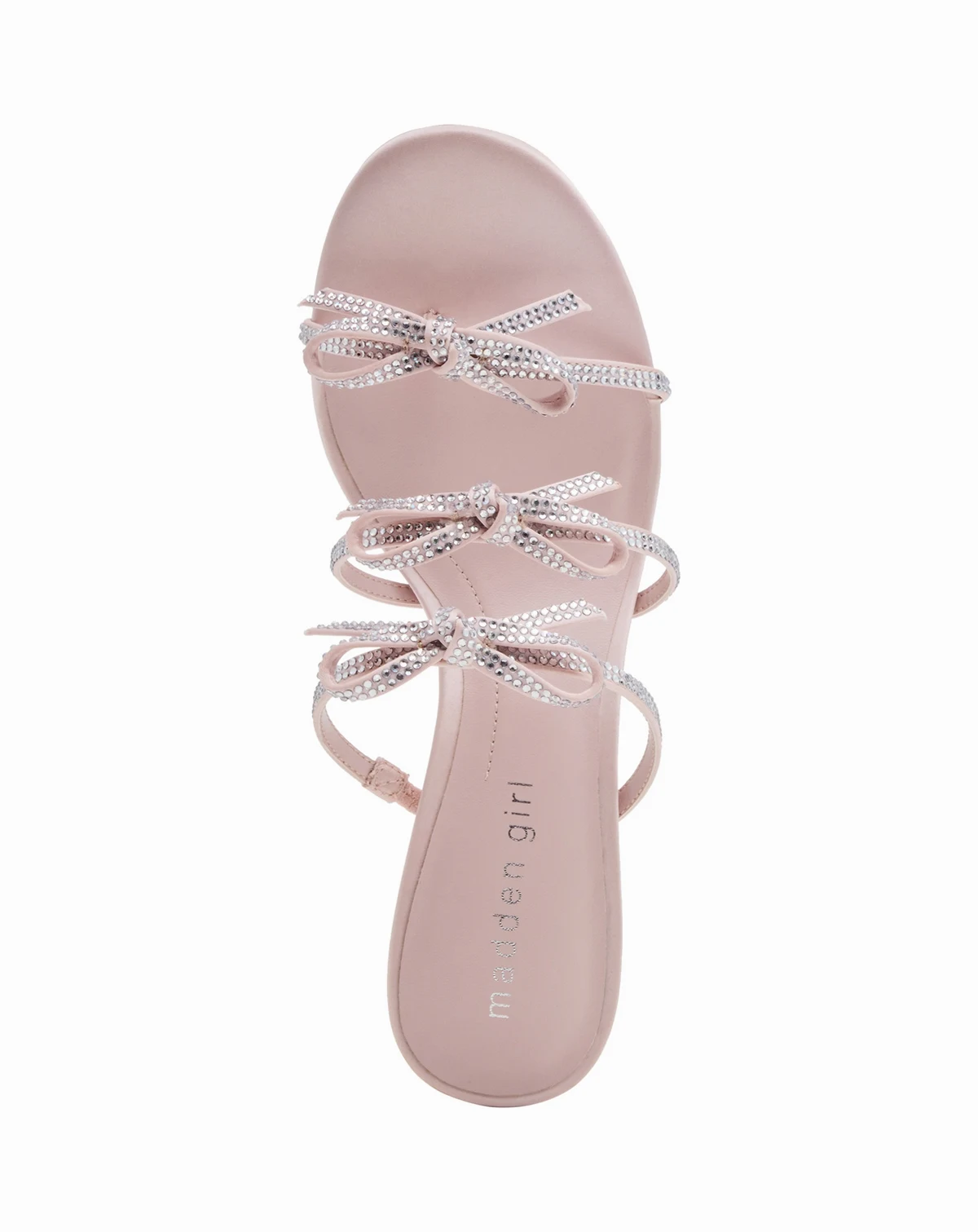 Shine with every step in these Madden Girl dress sandals, featuring a fully embellished upper and a classic mid-heel for comfortable height. A delicate bow detail adds a touch of feminine charm to this sparkling design.