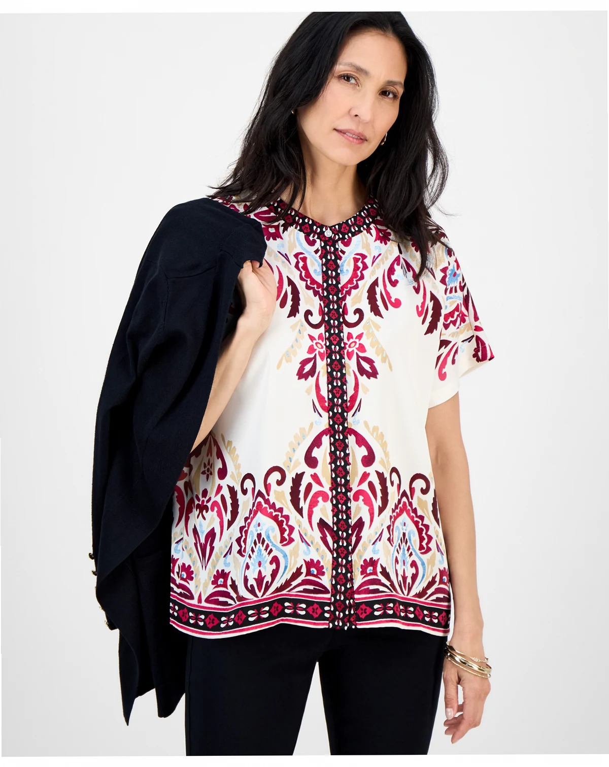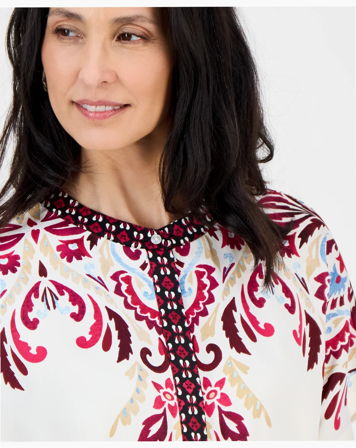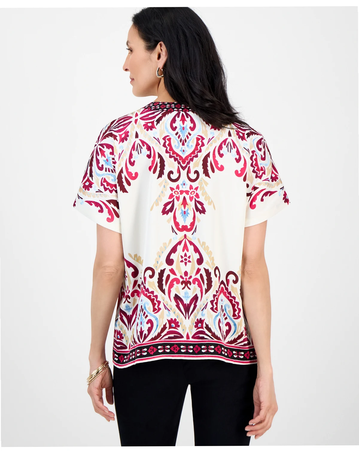 A bold mix of prints adds interest to this short-sleeve, silky-feeling top from JM Collection.